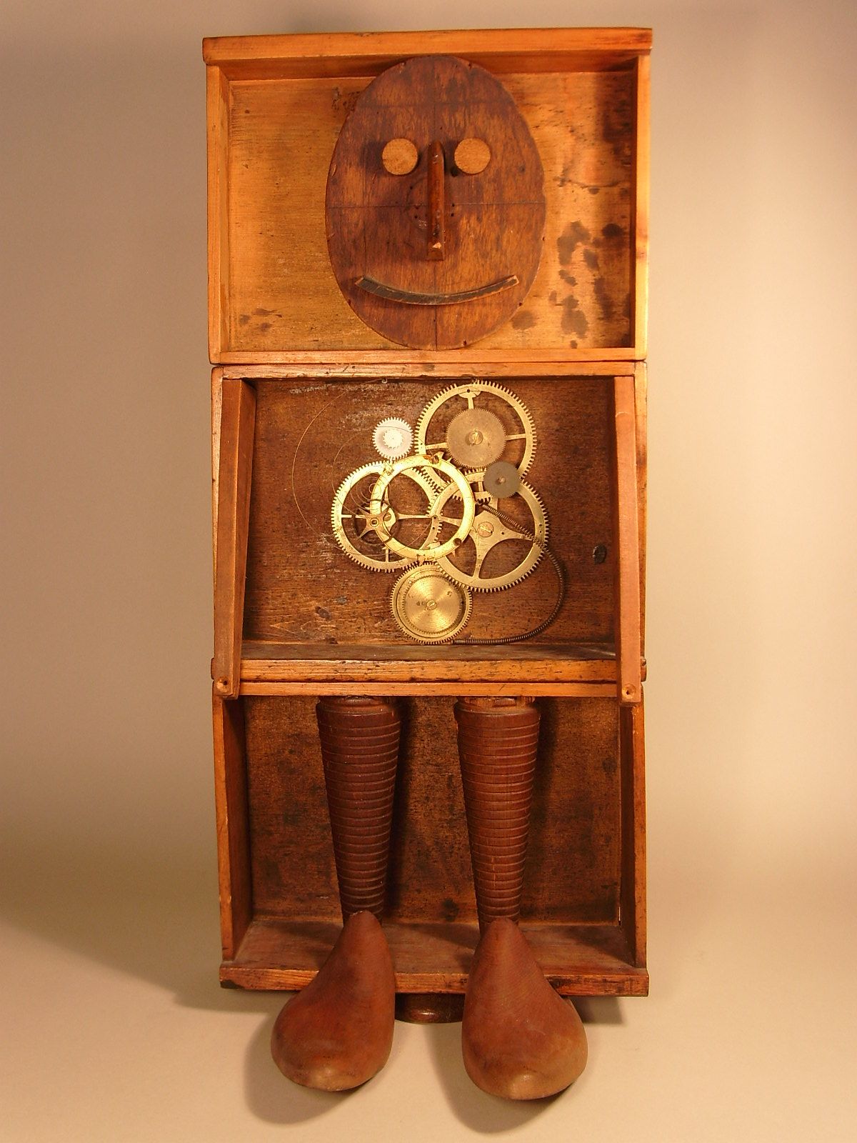 Description: A stylized man made of wood and gears is composed as a vertical triptych that speaks to the complex workings of the soul unique to every man in spite of the relatively standard form which our bodies all assume. Three wooden boxes are stacked one on top of another, containing his head, torso and legs and feet. In the top box, a wooden disc with smaller attached wooden forms representing eyes, a nose and a mouth form his head. In the middle box, overlapping metal gears represent his innards. In the bottom box, tapering, ribbed wooden cylinders attach to wooden shoe lasts representing his legs and feet.