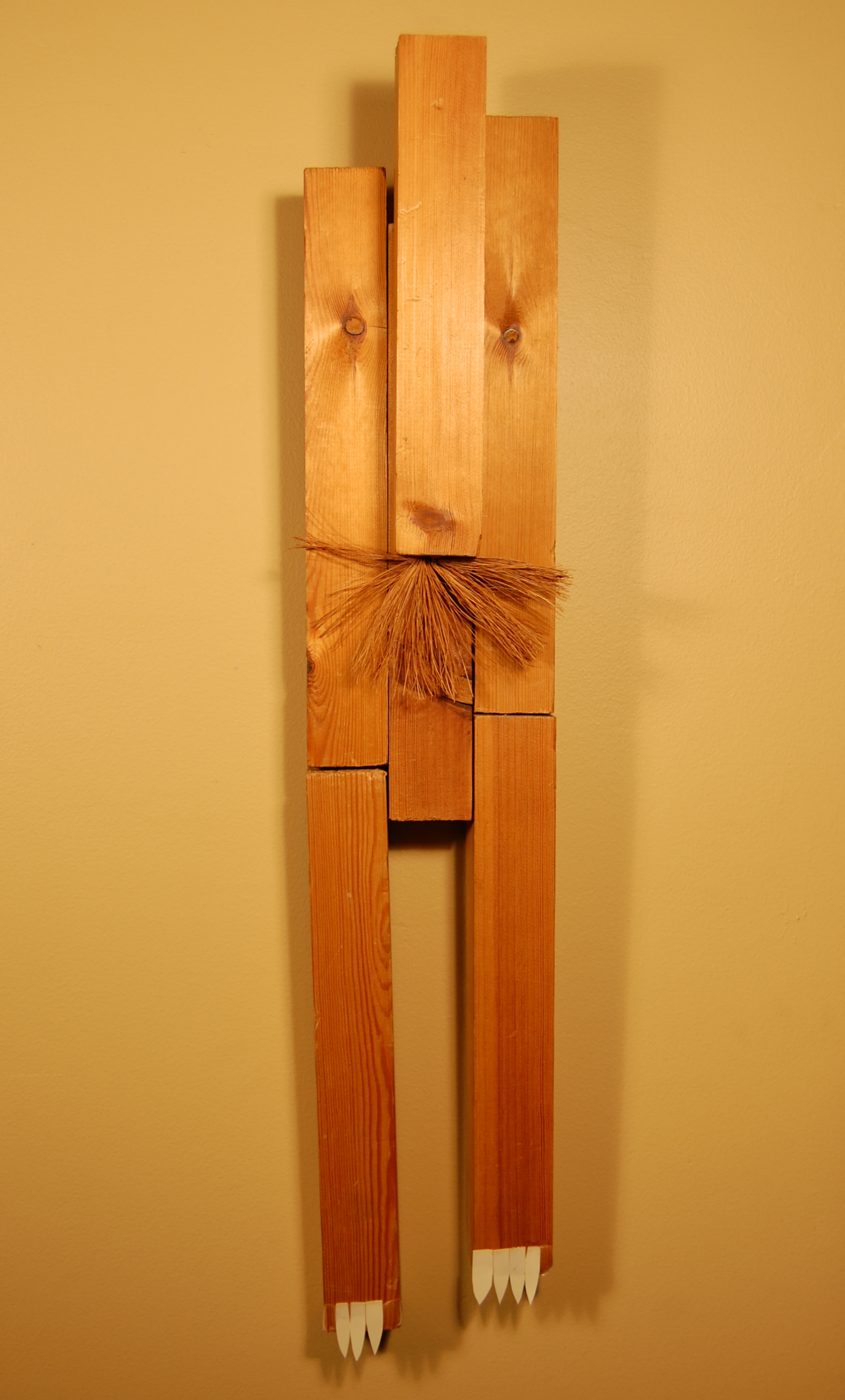 Description: Six long, rectangular wooden blocks form a standing figure. Four of the blocks are assembled to form the face of the figure, while the two other blocks are attached vertically below them, representing his legs. One of the blocks on his face projects past the surrounding blocks, delineating his nose. Protruding straw bristles splay beneath his nose; representing his mustache. Two of the wooden blocks representing the plane of his face have a knot on their outward surfaces that indicates his eyes. Glued to the end of each of the figure’s feet is thin, white, plastic material with a serrated edge, representing claws.