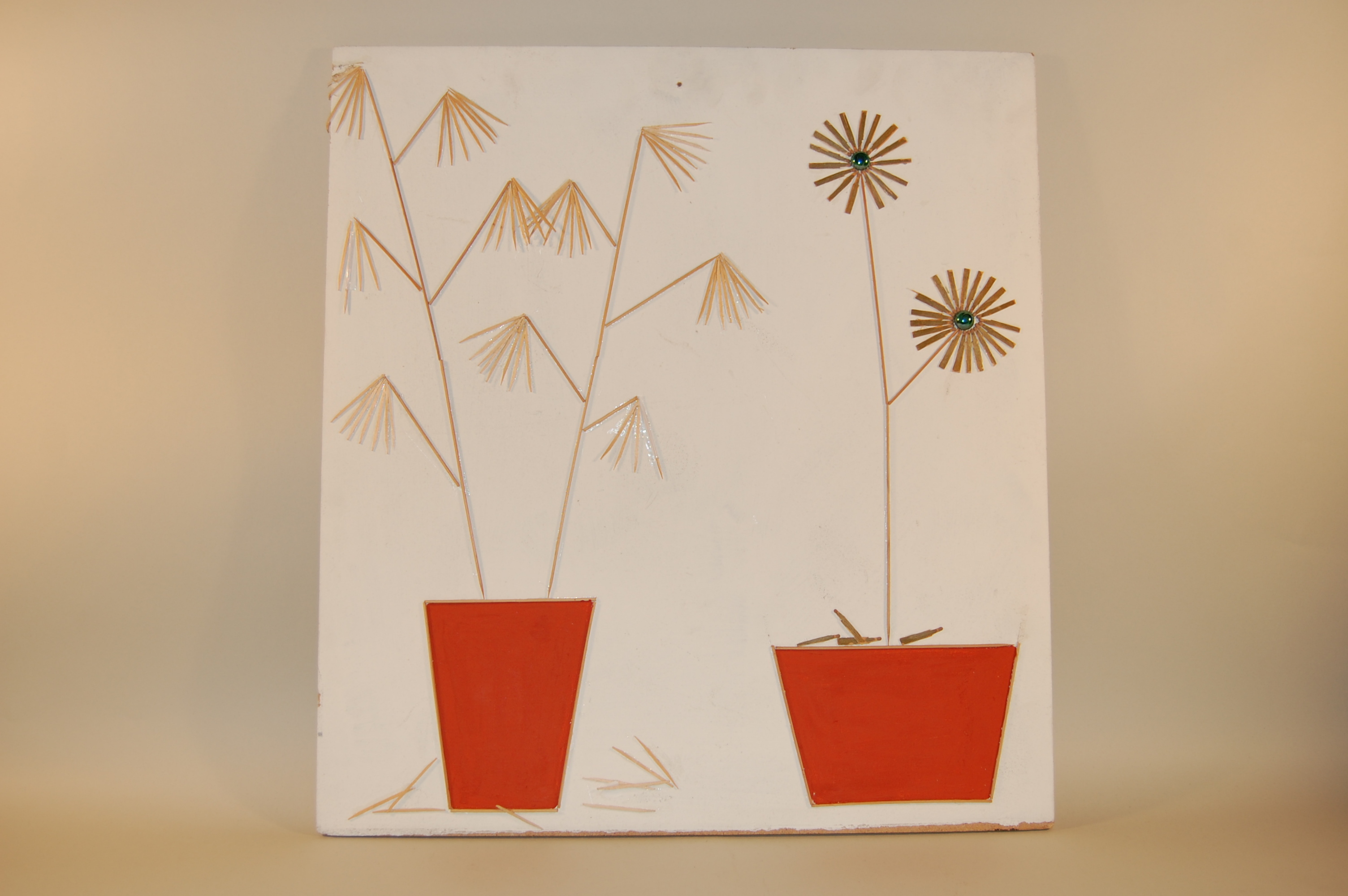 Description: A wooden board painted white serves as the background for this still-life of two potted plants. Both pots are orange and outlined with toothpicks. Toothpicks also form the plants that grow out of each pot. The plant on the left has two main branches, with additional stems and leaves branching from them. Gathered at the base of this pot are leaves, also of toothpicks, that appear to have fallen from the plant’s branches. The plant on the right is composed of toothpicks that are painted gold. One large stem grows from the pot, branching into two stems, each ending in a single flower. The petals of the flowers are composed of gold-painted toothpicks assembled in a radial pattern, projecting from the blue glass bead that represents each flower’s stigma.