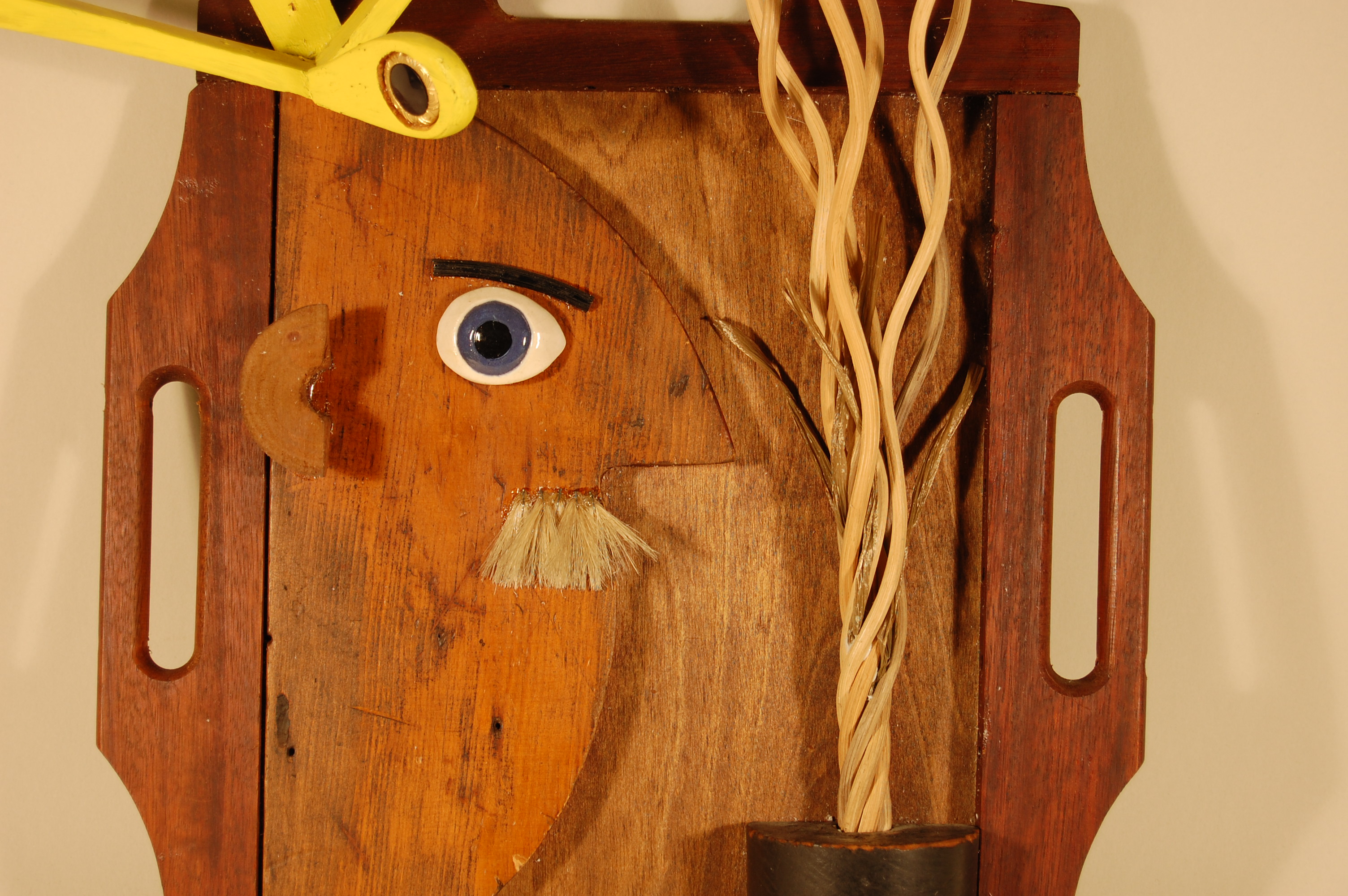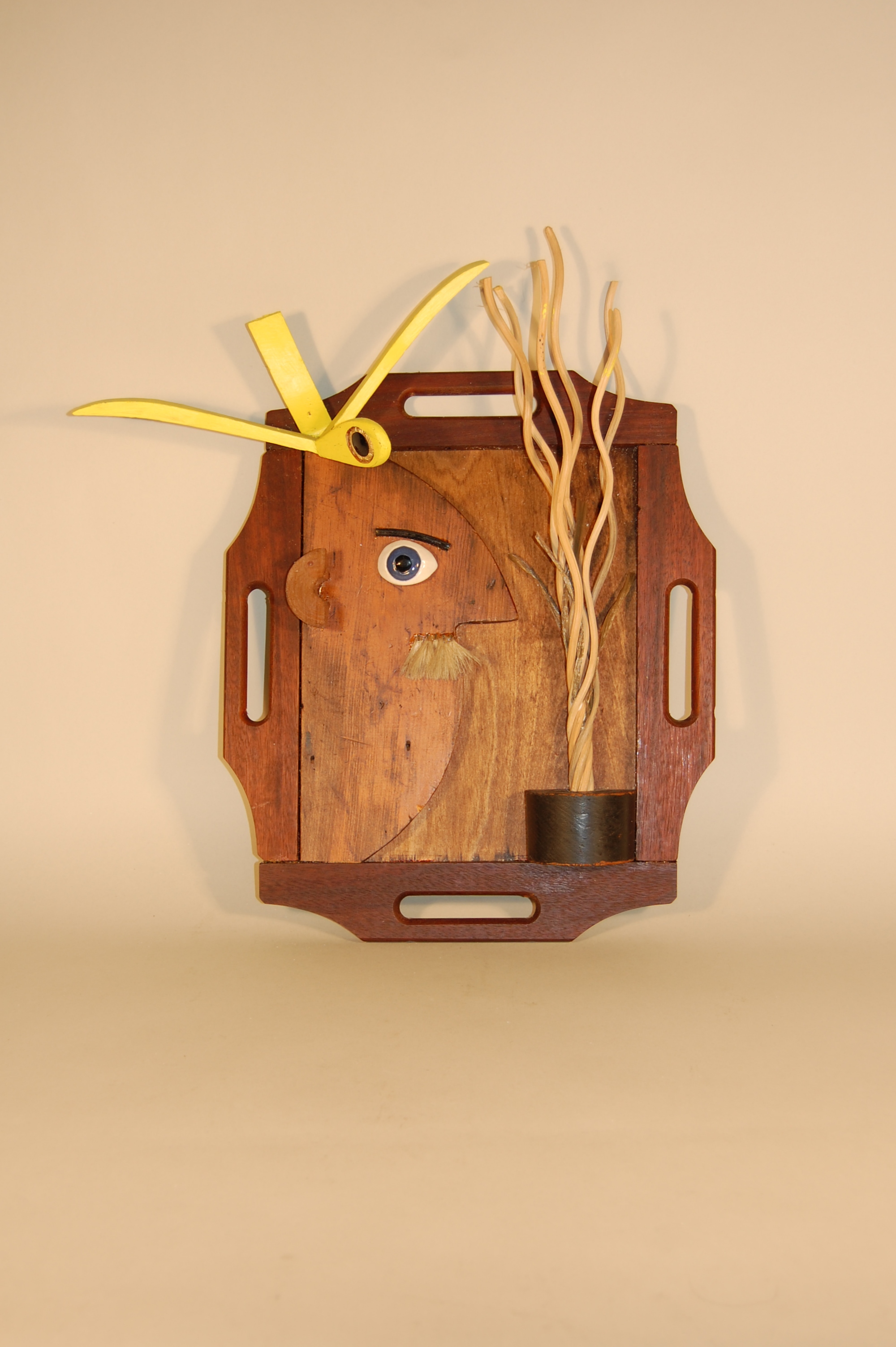 Description: Four wooden tray handles frame a vertically-oriented rectangular wooden form that serves as the backdrop of this scene. A wooden form occupying the left register of this piece represents the profile of a man’s face. A ceramic eye is attached to its surface. A black-painted curved fragment of wicker represents his eyebrow. Below the protruding nose of the face’s profile are beige acrylic brush bristles, representing his mustache. Attached to the top of the man’s head and the upper-left corner of the frame, is a yellow-painted wooden form with appendages extending in all directions, representing a bird. A black plastic button with a gold border is attached to the head of the bird, representing its eye. Occupying the lower-right register of this piece is a round wooden form painted black. A series of twisted strands of wicker are attached to the top of this form, extending upwards, representing a tree or a plant growing from a pot.