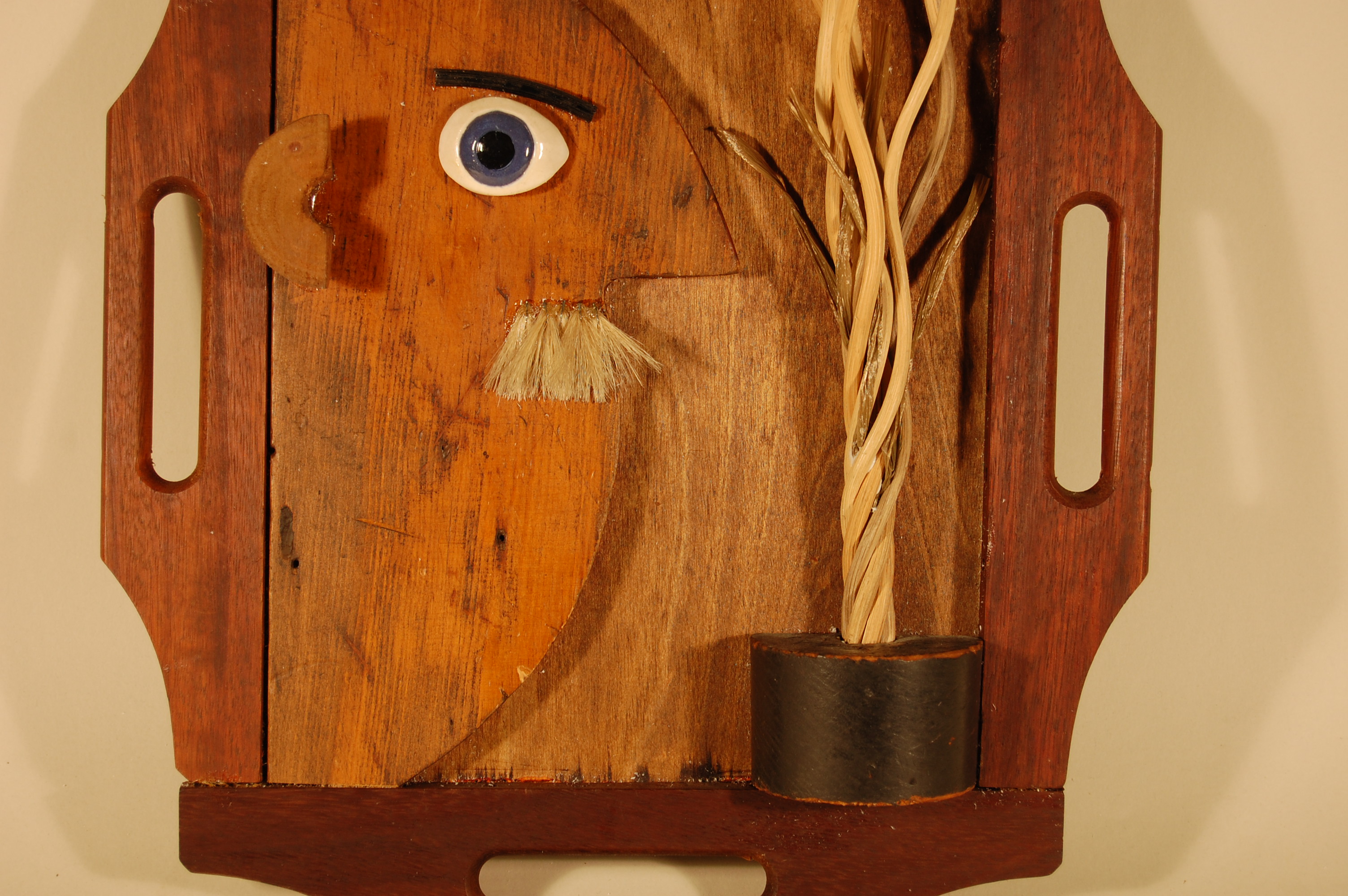 Materials and Techniques: Wooden forms, wooden tray handles, ceramic eye, black plastic button with gold border, black painted wicker, natural wicker, acrylic brush bristles