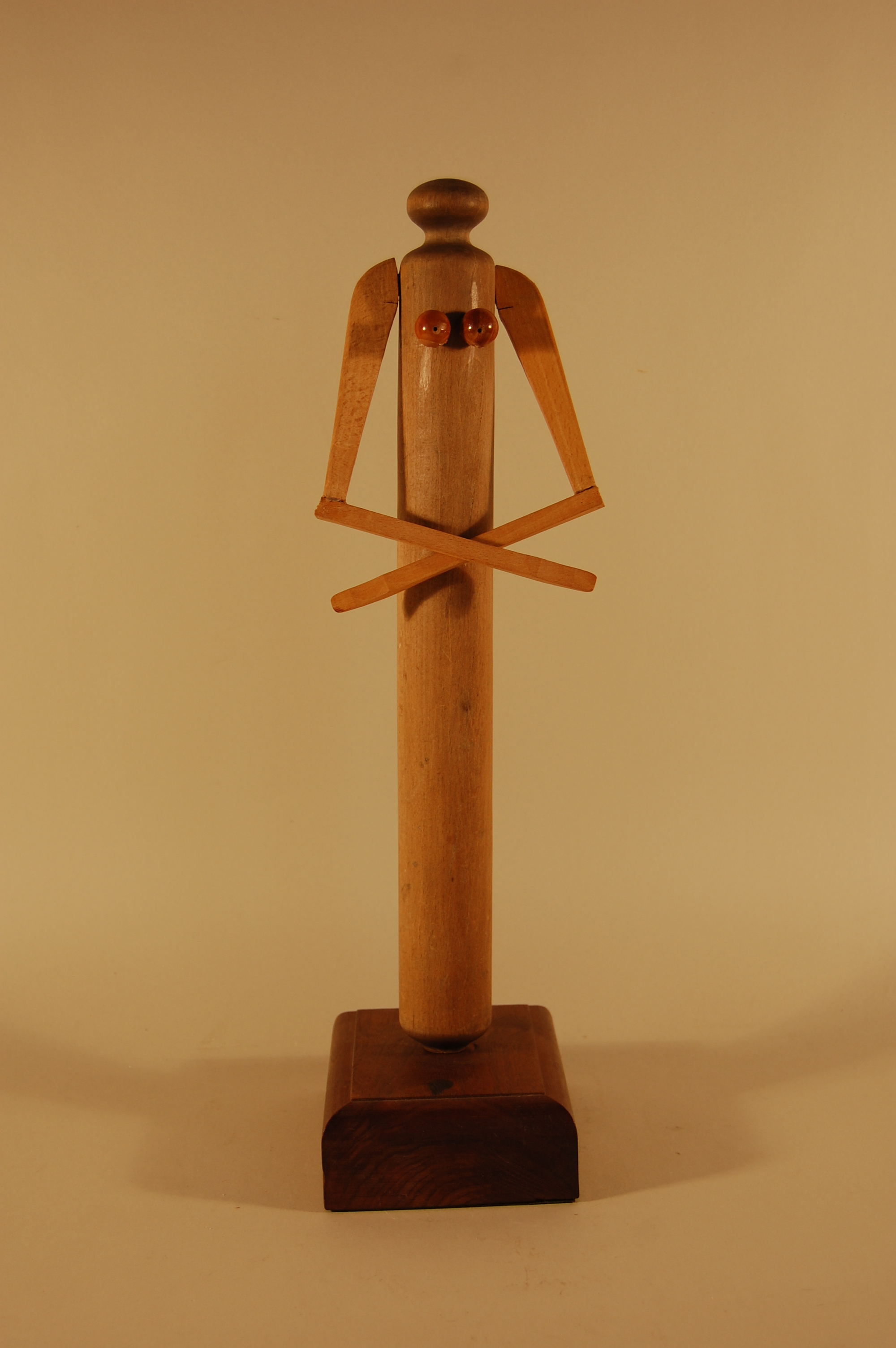 Description: A long, cylindrical wooden form with a rounded knob at its tip represents the body and head of a woman. Thin pieces of wood are attached to either side to form arms that appear in a rested position, folded across one another in front of her abdomen. Two small wooden beads are attached just below her shoulders, representing breasts. The piece is anchored on a dark wooden block.