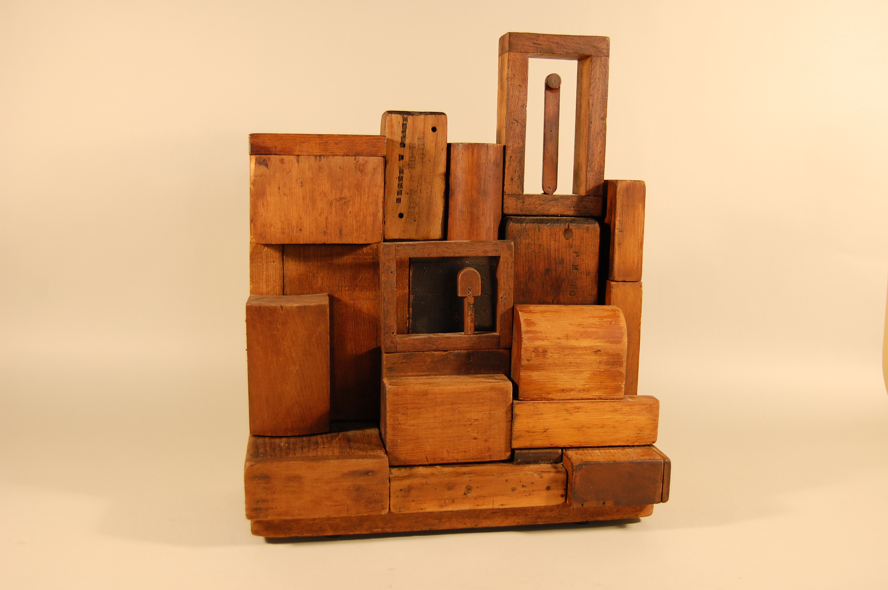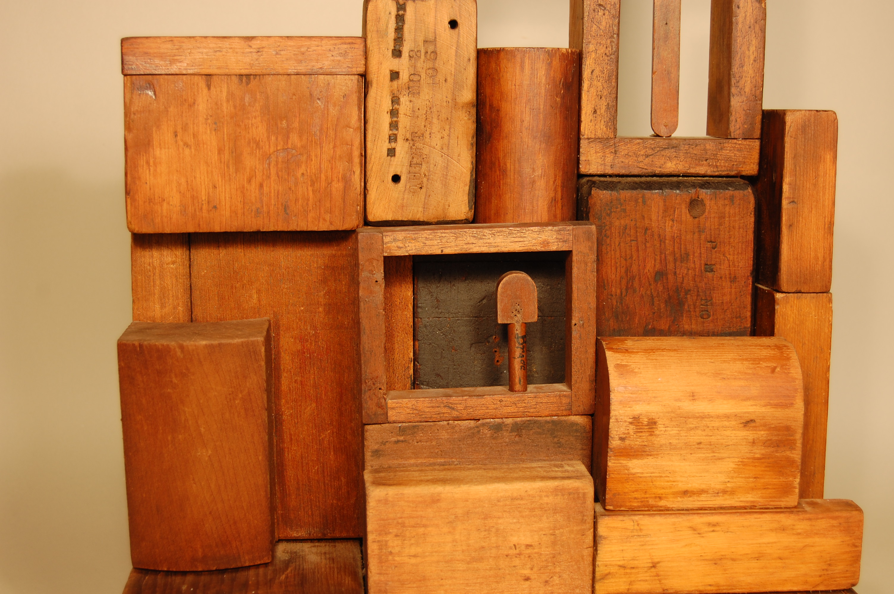 Description: This collage is formed by a series of wooden forms. Within this collage are two small, thin wooden forms that are each placed within larger wooden frames. The remainder of the collage is an assemblage of thick wooden boxes, blocks and forms.