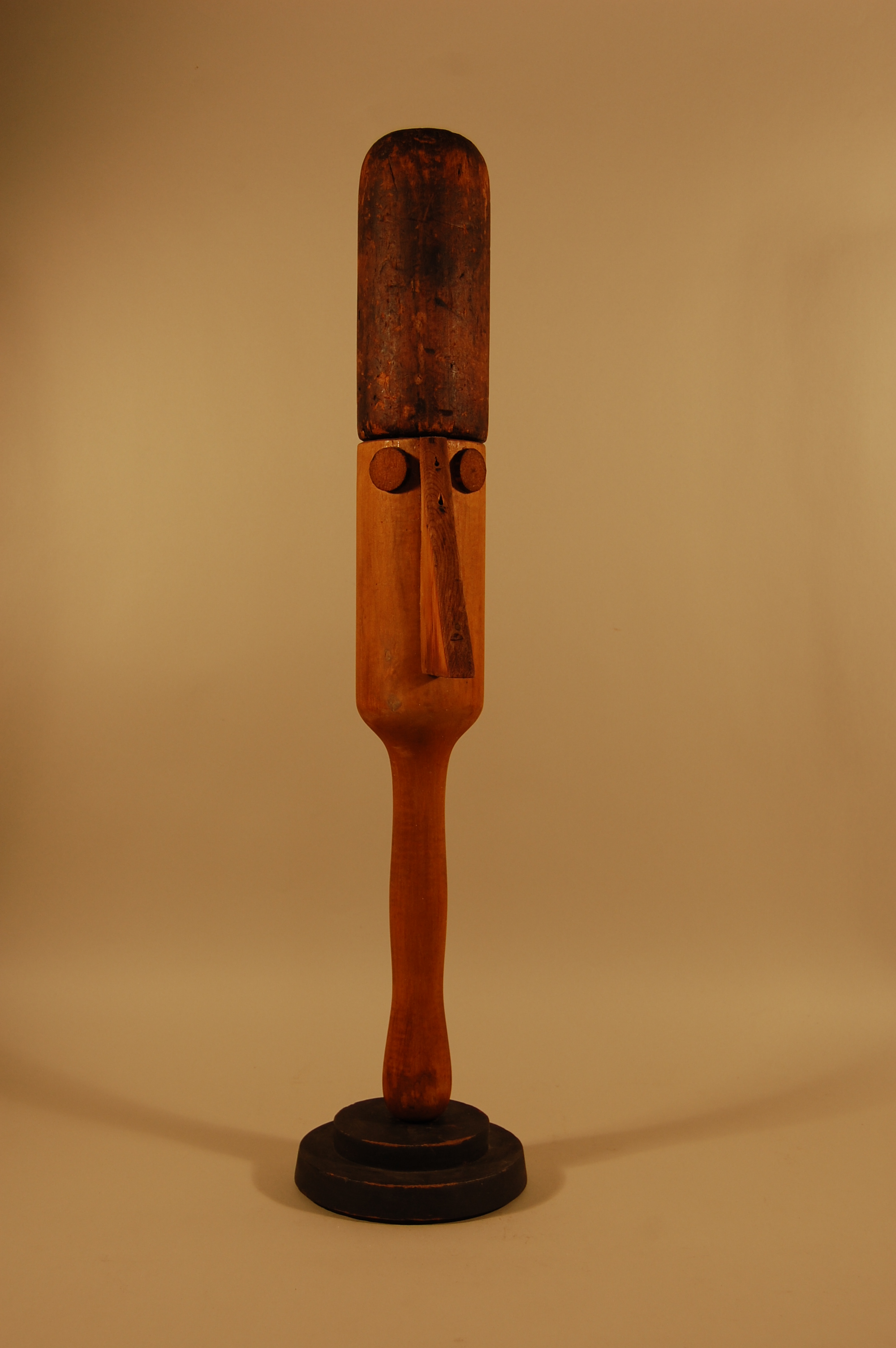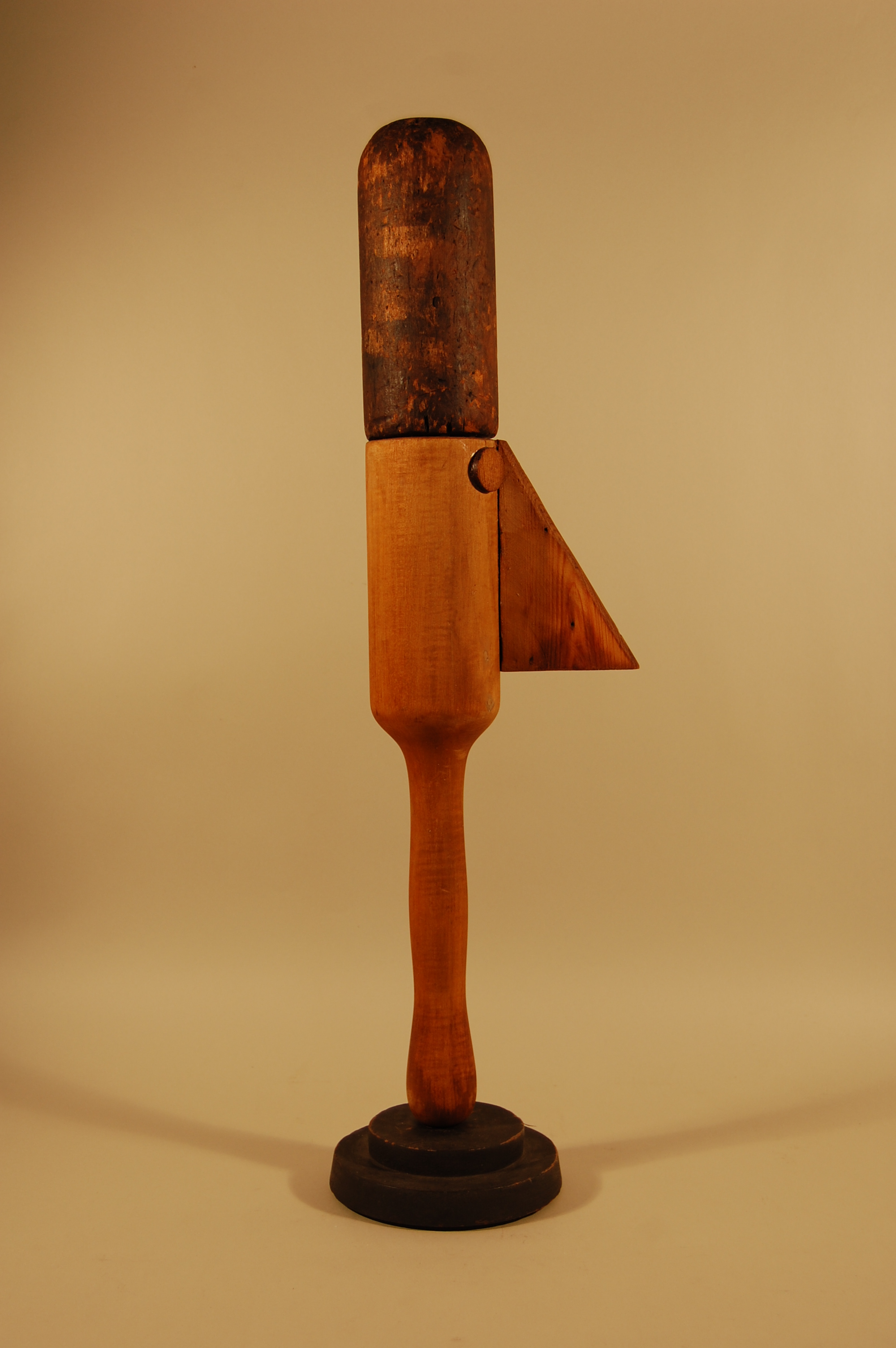 Description: A cylindrical wooden form is situated vertically on a round, painted black disc. The vertical cylinder tapers as it approaches the base, representing a head and neck. An additional wooden cylinder is attached on top of the head. This form is painted black, and represents his hair. Wooden forms are attached to the figure’s face: two round discs represent his eyes and a very large triangular form protrudes from the surface of his face, representing his nose.