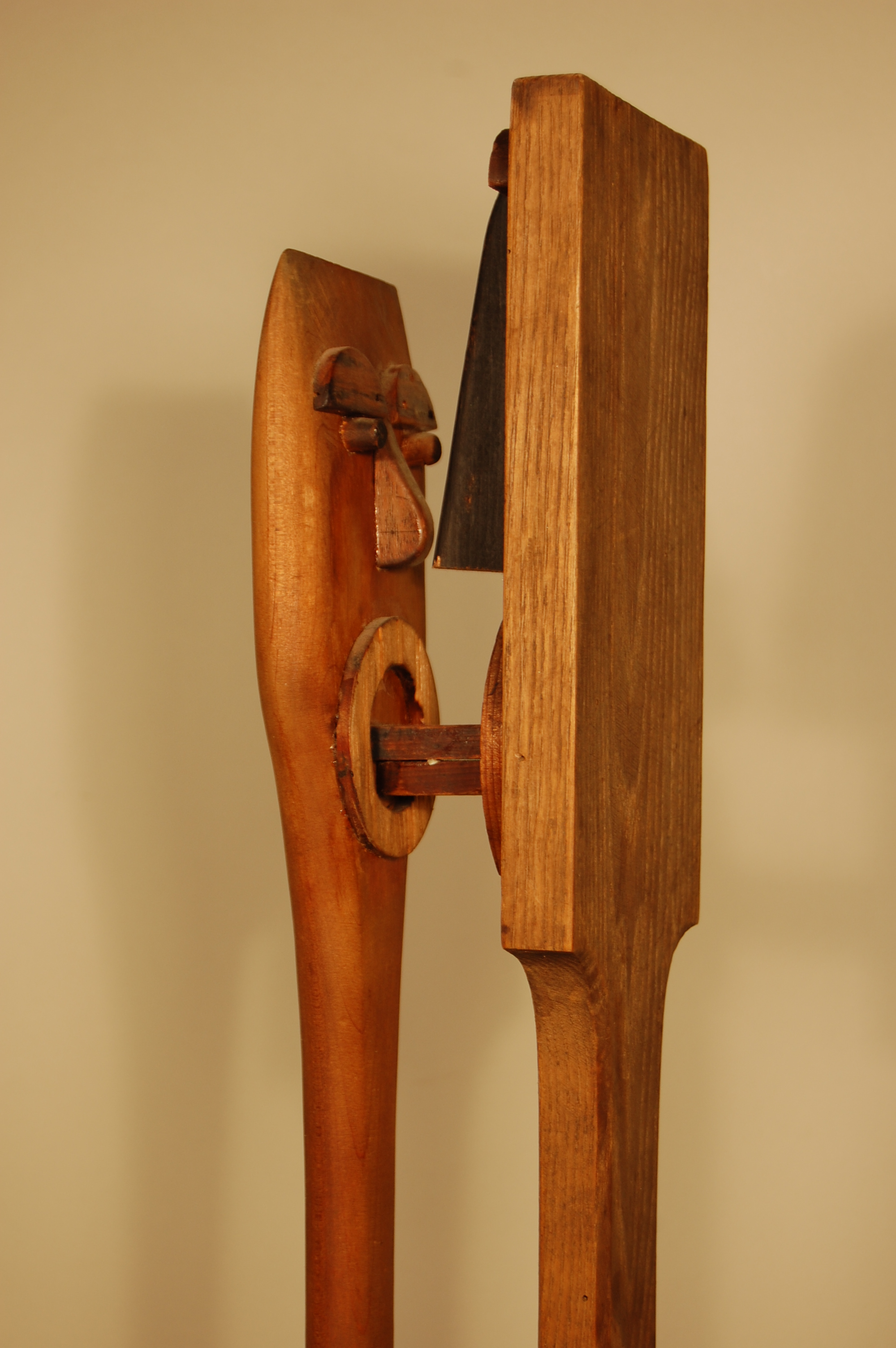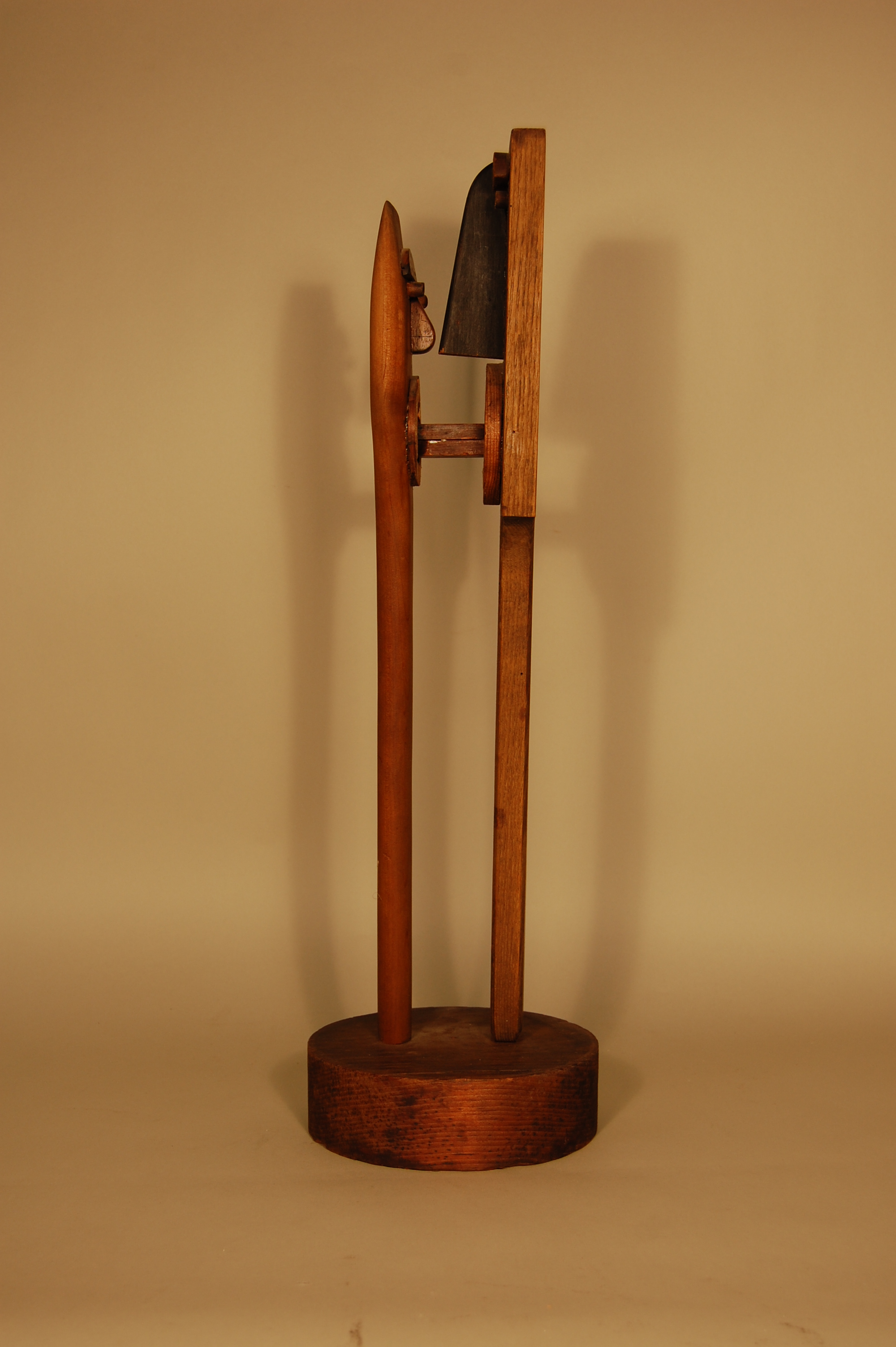 Description: Two wooden kitchen utensils of different size are attached to a thin, cylindrical wooden base, as to stand upright and face each other. Both utensils are articulated with small wooden forms that represent facial characteristics such as round forms for eyes, arched forms for eyebrows, and triangular forms for noses. Both of their mouths are represented with wooden forms in the shape of a ring. Two identical rectangular wooden forms connect both of their open mouths, representing their tongues.