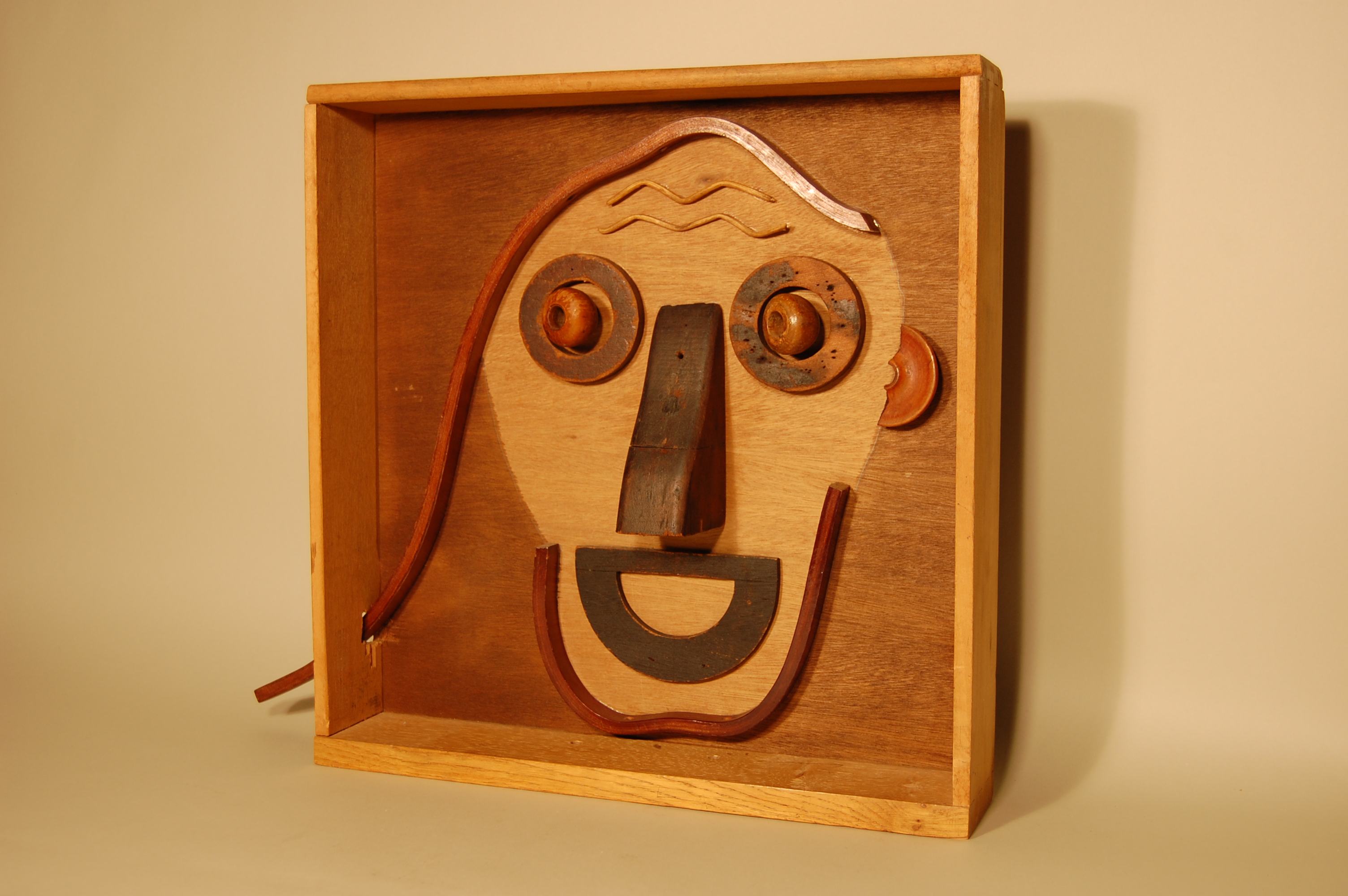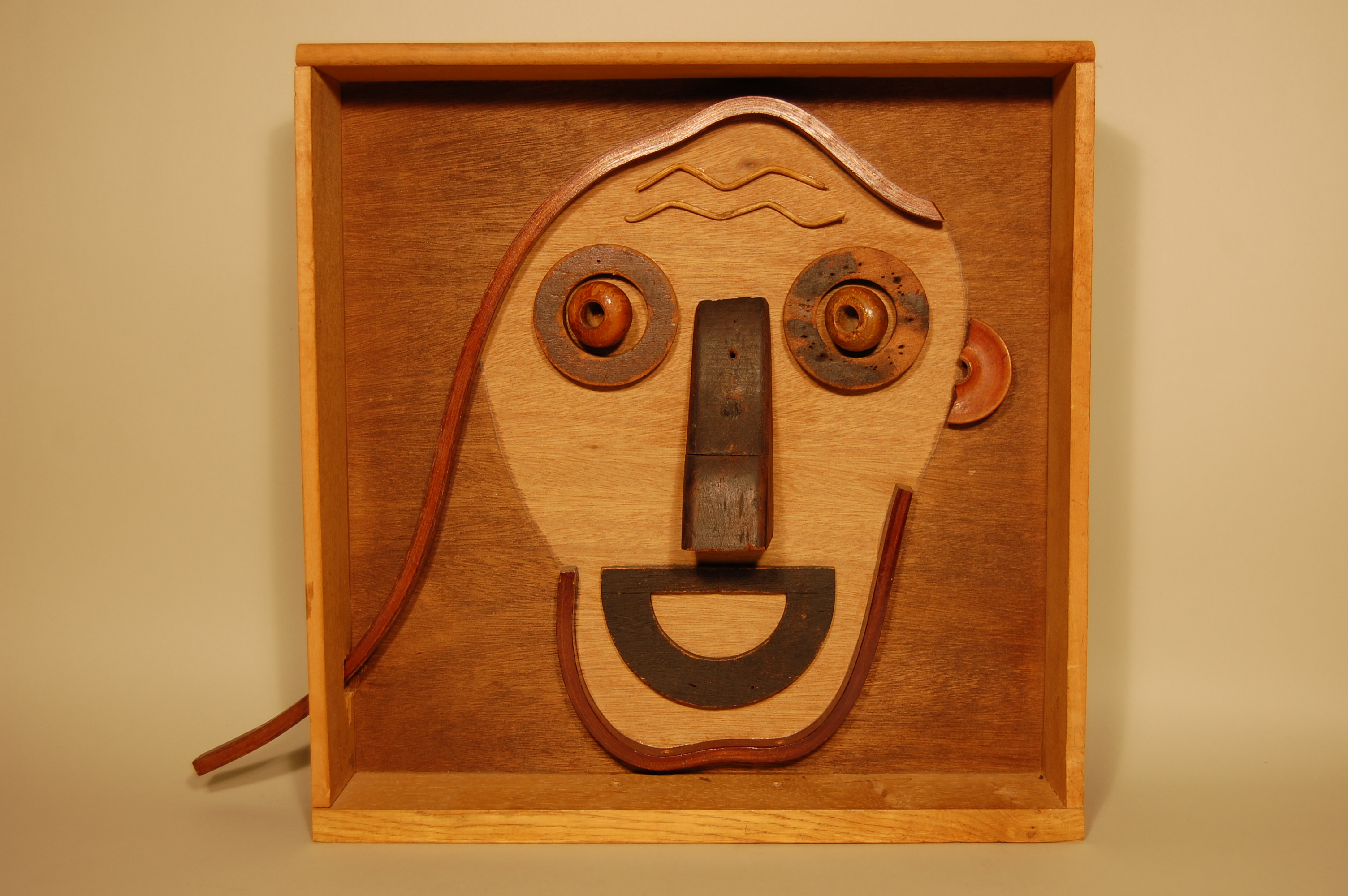 Description: Within the frame of a square-shaped wooden box is the image of a woman’s face. The shape of her face is outlined with a wood stain and a curved piece of wood also outlines her chin and cheeks. A variety of wooden forms represent her facial features. A wooden form painted black protrudes from the surface of the box, representing her nose. Another black wooden form in the shape of a protractor represents her smiling mouth. Two wooden rings with faded black paint represent her eyes and within these rings, two hollowed-out wooden balls further articulate the features of her eye. Two strands of horizontal, curved wicker are attached on her forehead, representing lines in her skin. A long, curved wooden form, representing her hair, extends from one side of her head to the other, draping down the left side of her face, and emerging from her box frame.