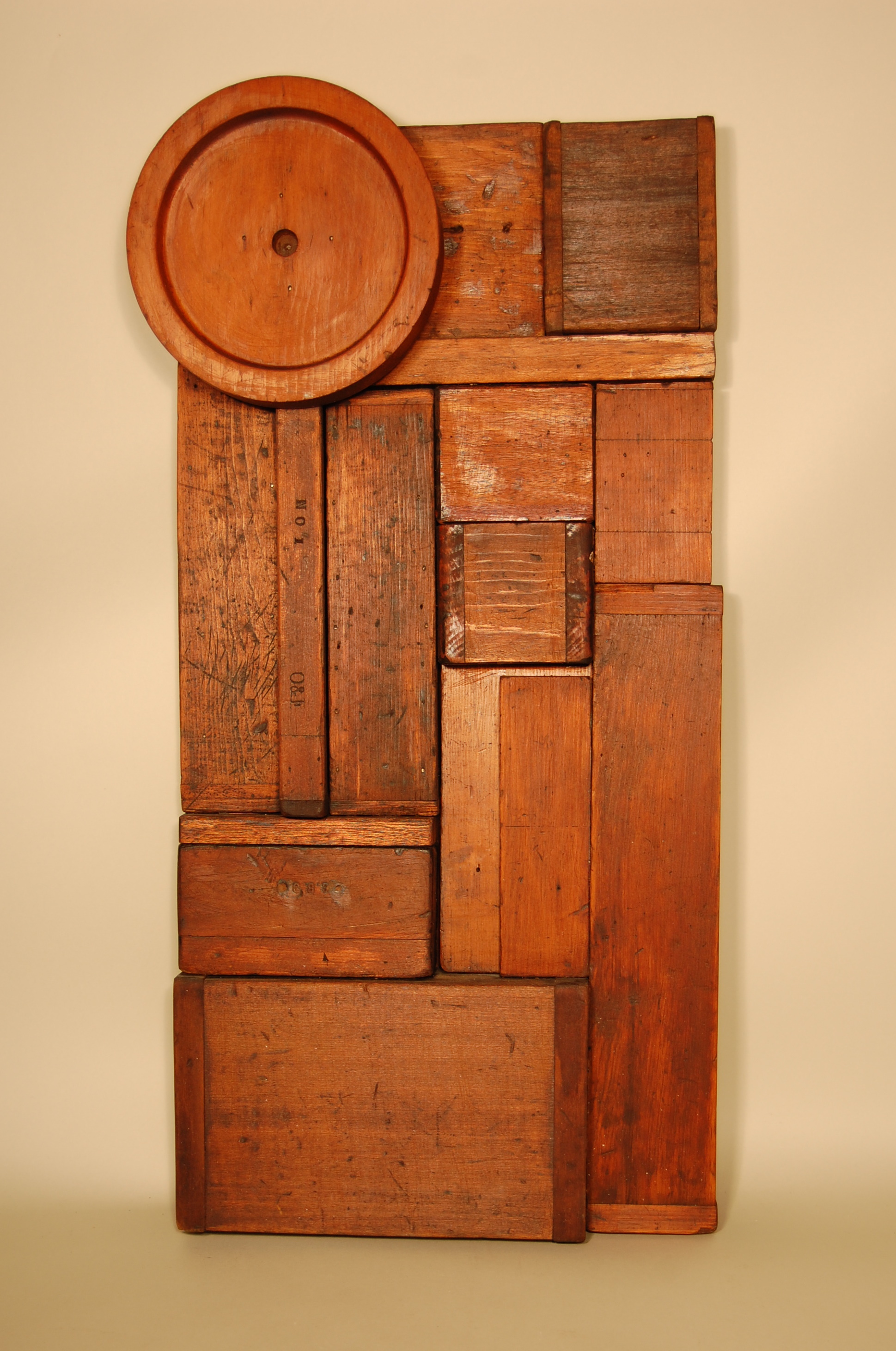 Description: A variety of rectangular wooden forms are mounted onto a vertical, rectangular backing. The forms are of varied depths and create an uneven surface. A round wooden form is mounted onto the upper left corner.