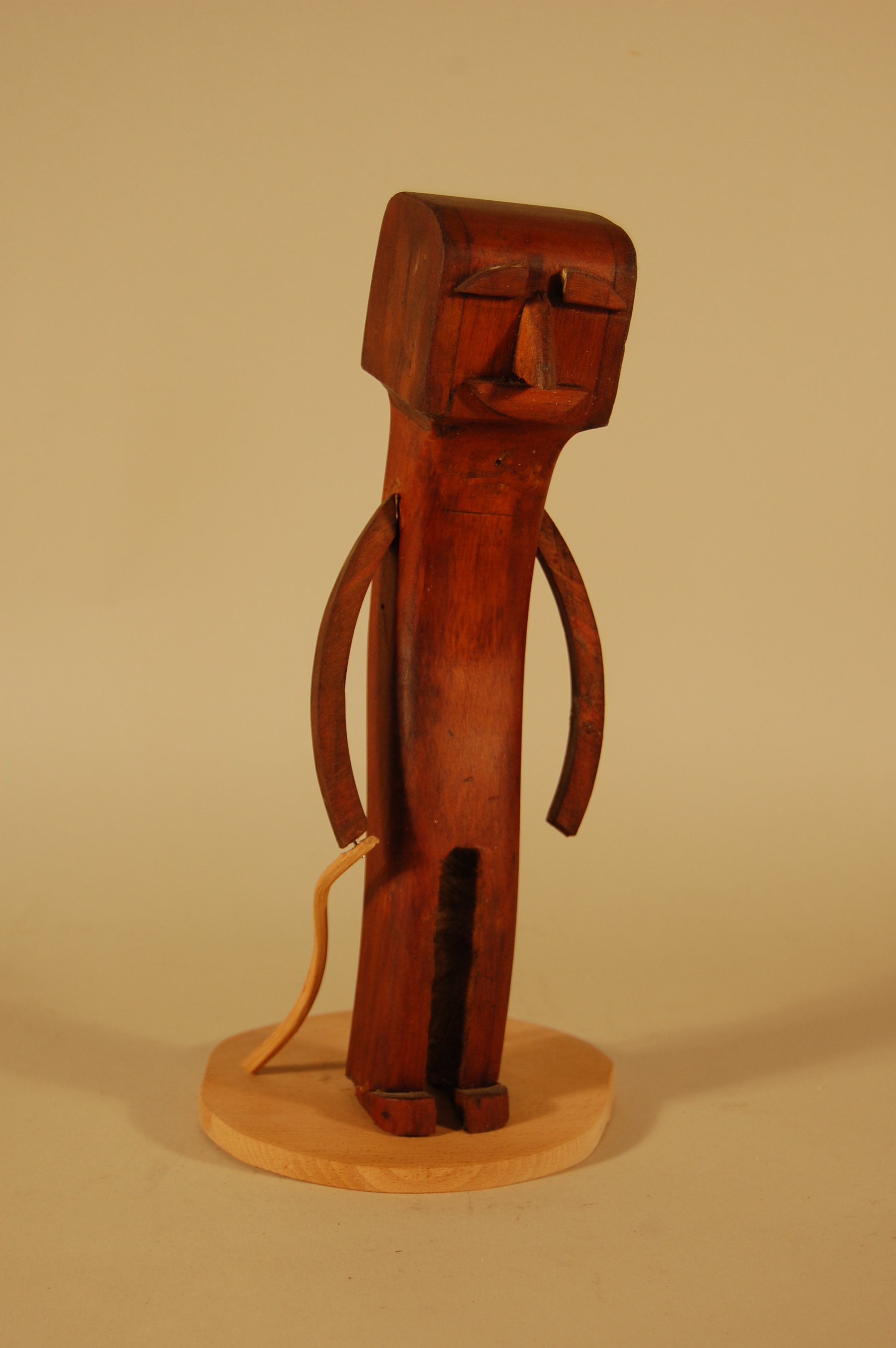 Description: Attached to a thin, round wooden base is the form of an elderly man standing with his head bent forward with a curved cane in hand that trails behind him. A singular wooden form represents his entire body. Two curved wooden forms are attached on each side, representing his arms that hang at his sides. Two wooden forms, each the shape of a quarter of an oval, represent his tired, forlorn eyes. A triangular form represents his nose, and a half oval shape represents his mouth. A strand of wicker is attached to his right arm, representing his cane.