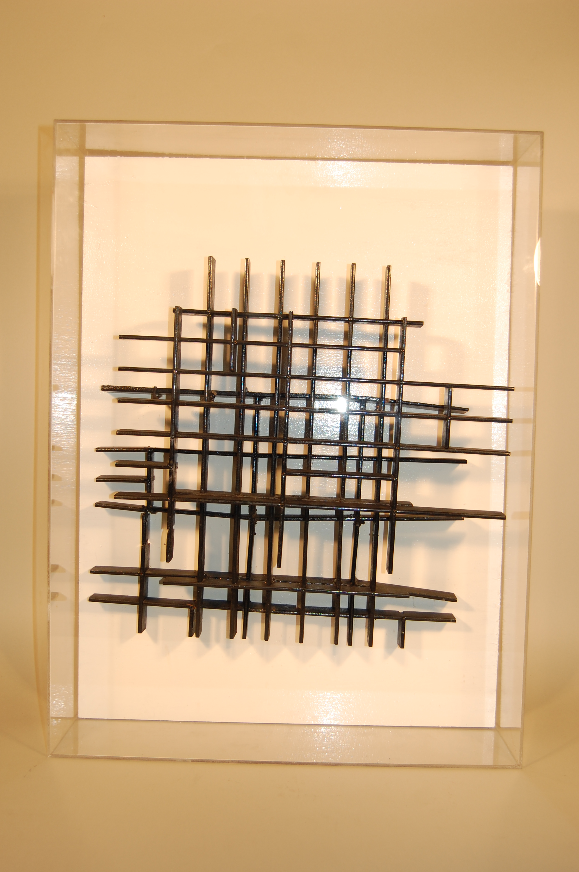 Description: A wooden board painted white serves as the background for three layers of black painted wooden forms that are arranged in a grid formation. A Lucite frame surrounds this abstract piece on five sides.