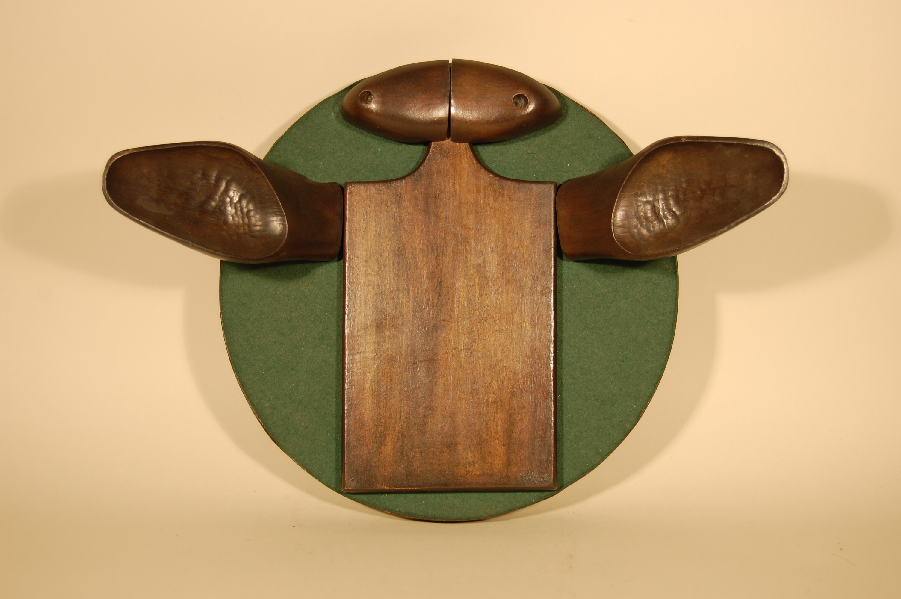 Description: A green felt-covered wood panel provides the base for a figure depicted with its arms outstretched. A bronze patinated wooden cutting board represents the form’s torso. A fragment of its handle represents the neck. Two bronze patinated wooden shoe lasts flank the torso, the arch of each shoe last facing upwards, representing open arms. Two identical patinated bronze rounded forms with small holes have been drilled on either side of the round forms. These have been placed side by side on top of the neck, representing a face with eyes. Shoe tree lasts have been modified and inverted, installed on either side of the torso to depict outstretched arms.