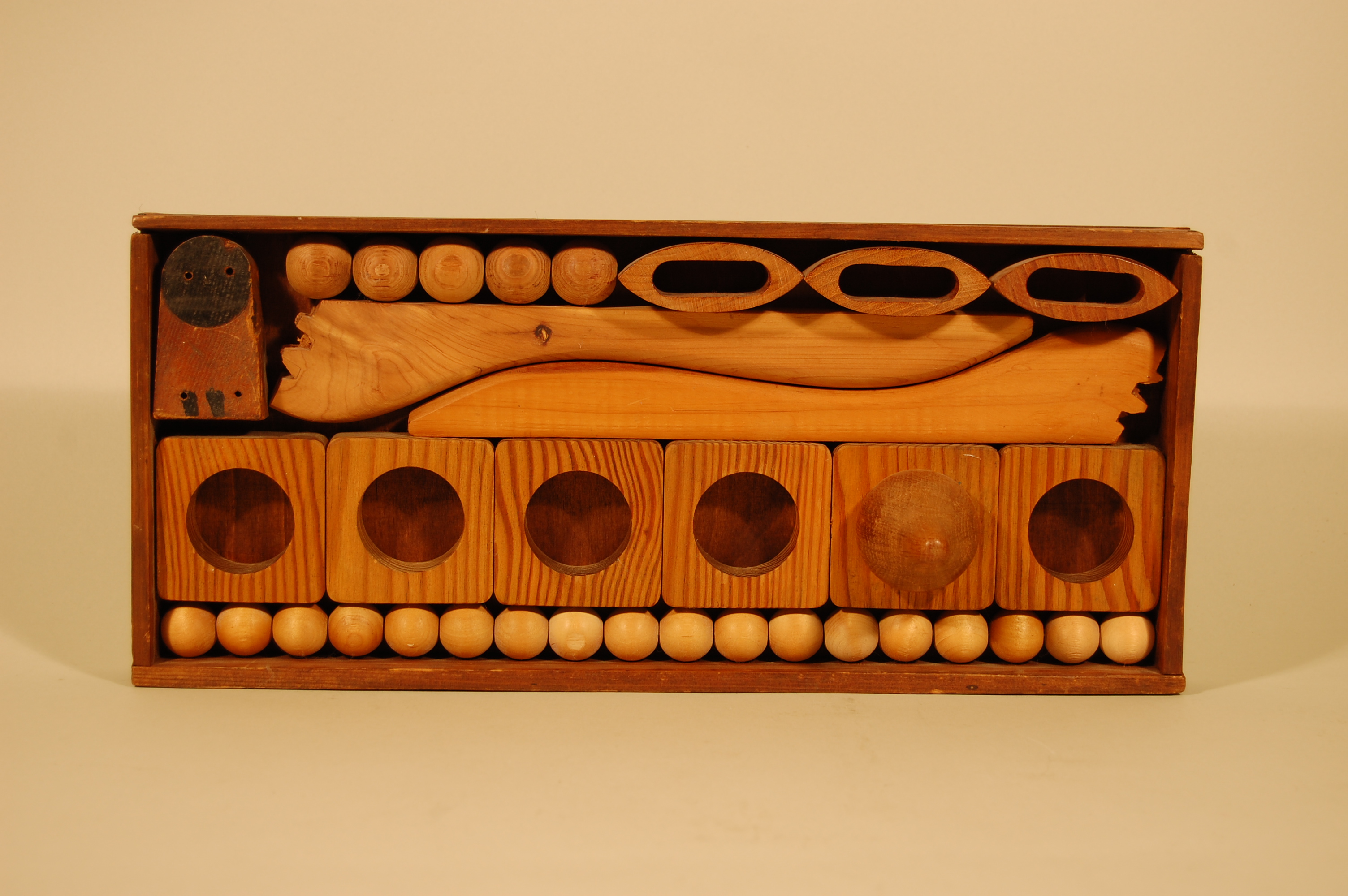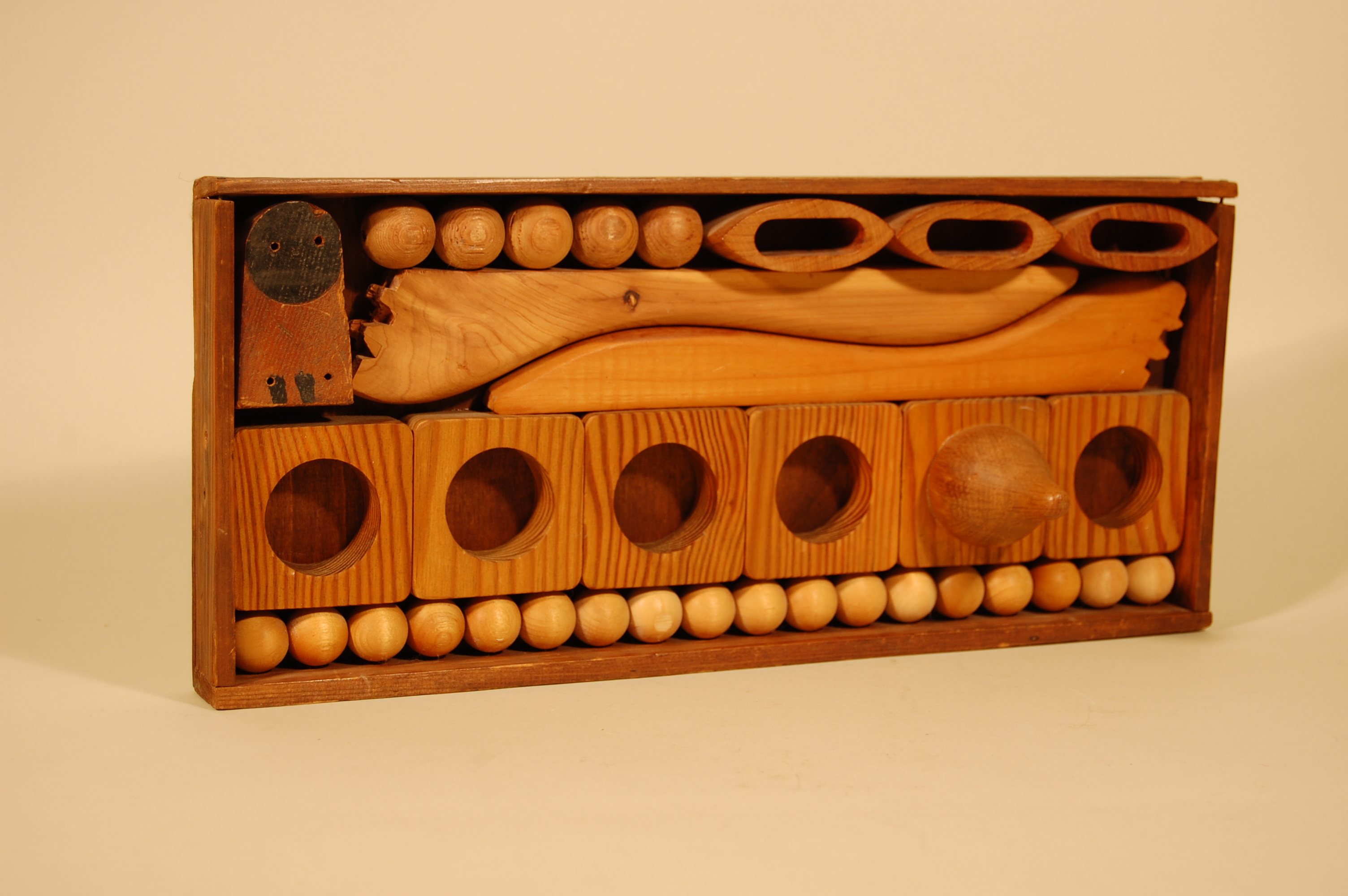 Description: A horizontal wooden box frames this abstract image. Small wooden balls line the lower inner perimeter of the frame. A line of six square wooden forms with a circular hole cut through each of their centers is placed above them. A circular, rounded wooden form with a pointed tip is placed inside the hole of the fifth square. Two large wooden forks with their teeth broken off are placed opposite one another horizontally above this. To the left, a wooden form articulated with black paint represents a living form. The round area painted black represents a head and two black lines painted on the lower portion of the form represent feet. To the right of this, lining the upper inner perimeter of the frame is a line of pointed ellipse-shaped wooden forms with oval holes. To their left more wooden balls are aligned.