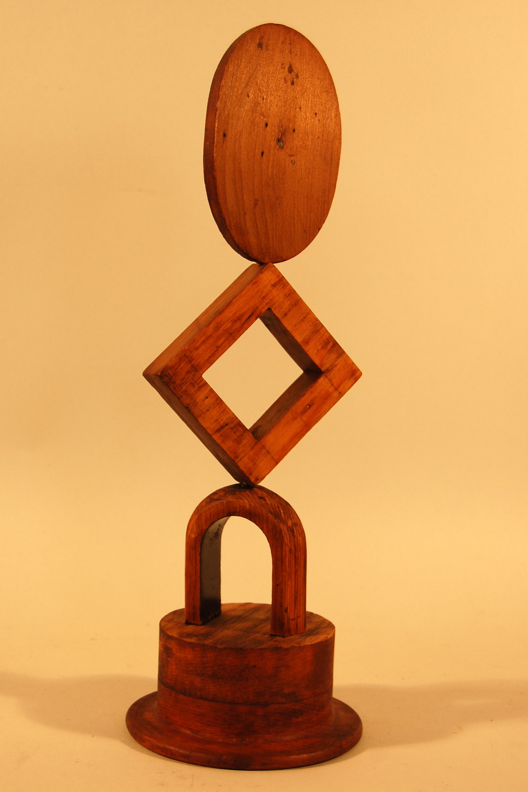 Description: Three geometric wooden forms attached vertically represent a human figure. The top wooden form is a flat oval shape, representing the head. The shape in the middle is a hollow diamond, representing the torso with elbows pointed and hands resting on the waist. Below this, a wooden form the shape of a horseshoe represents the legs. This figure stands on a round, thick wooden base with a rim.