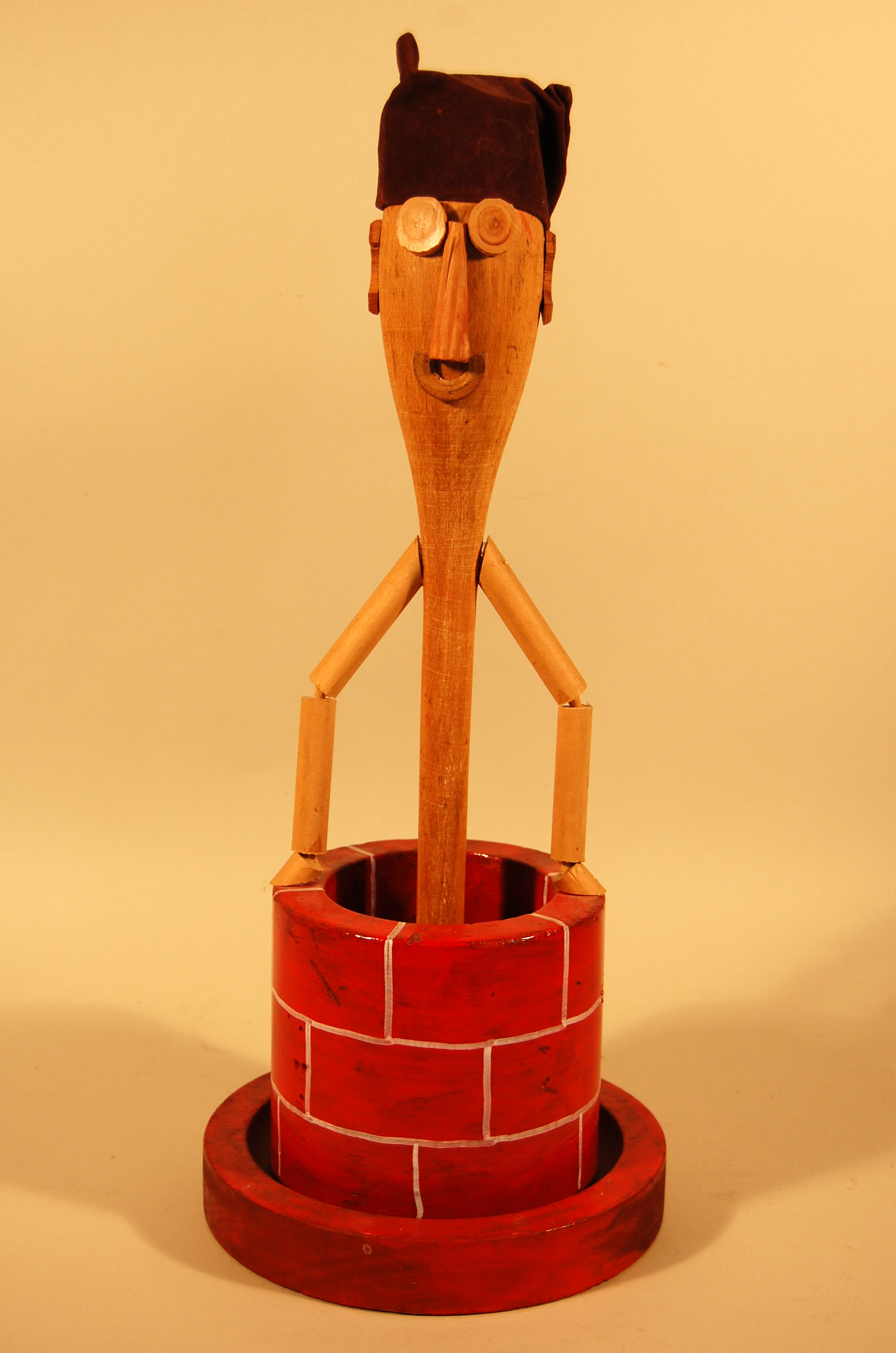 Description: A hollow, wooden cylinder is painted glossy red with white lines, in the pattern of a brick well. A wooden form shaped like a rounded cone with a handle projects from inside of the well. The top of the form that is shaped like a rounded cone is articulated with smaller wooden forms to represent a man’s face. Two round forms represent eyes, a triangular wooden form represents a nose, and a half ring shape represents his smiling mouth. Two other wooden forms shaped like half rings are attached to the sides of his head, representing ears. On his head rests a brown felt cap. Wooden forms that represent his arms and hands extend from the upper handle portion of his body and rest on the rim of the well.