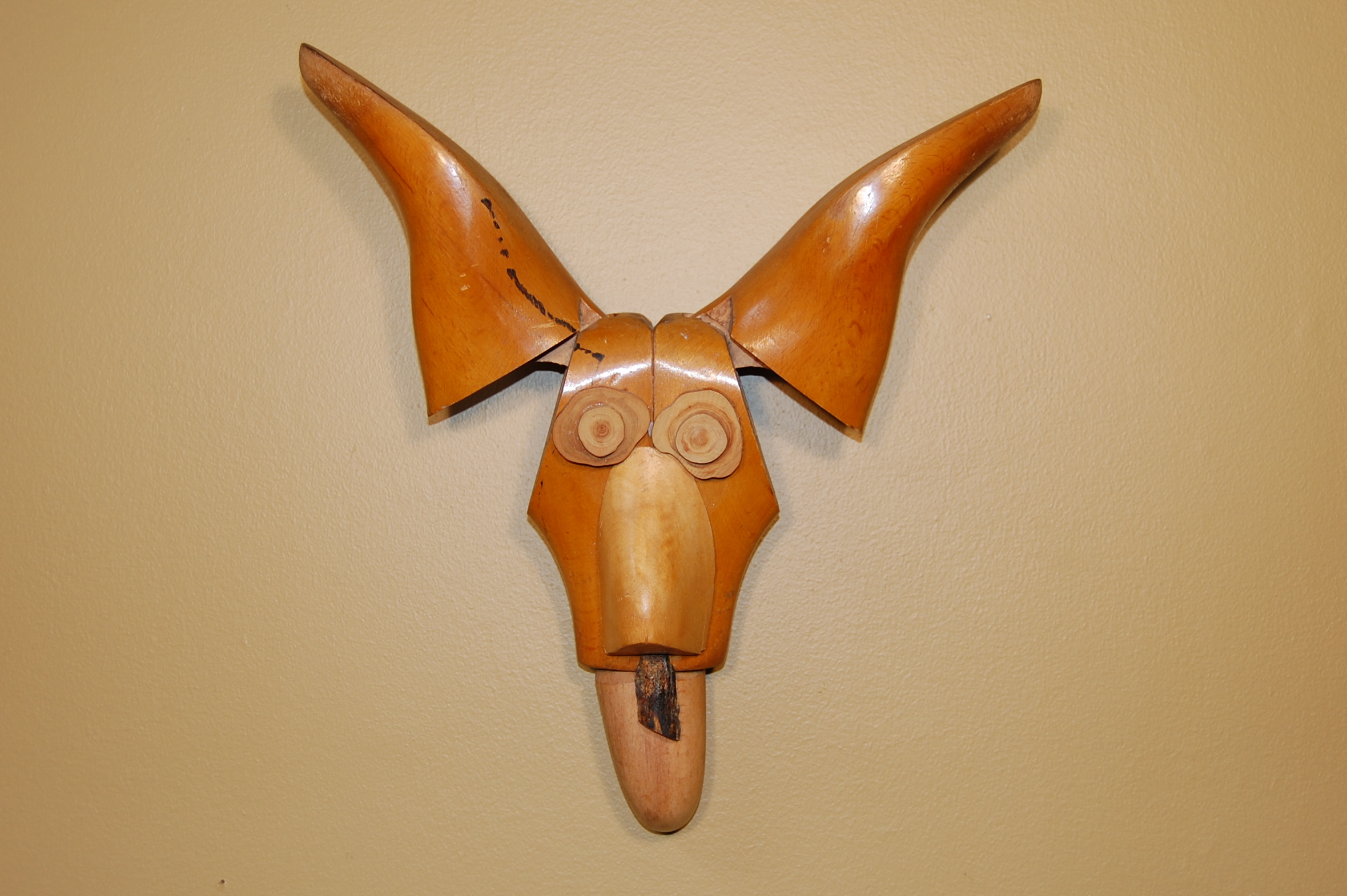 Description: Two wooden shoe lasts represent the face and ears of a dog. The heel and ankle portions of both shoe lasts are attached back to back, representing the dog’s face. The toe portions of the two shoe lasts point upwards, representing the dog’s ears. Attached to the surface of the dog’s face are wooden forms, representing the dog’s eyes and nose. A wooden form is attached below, representing the dog’s tongue, which hangs from his mouth. A small piece of bark is attached below the dog’s nose.