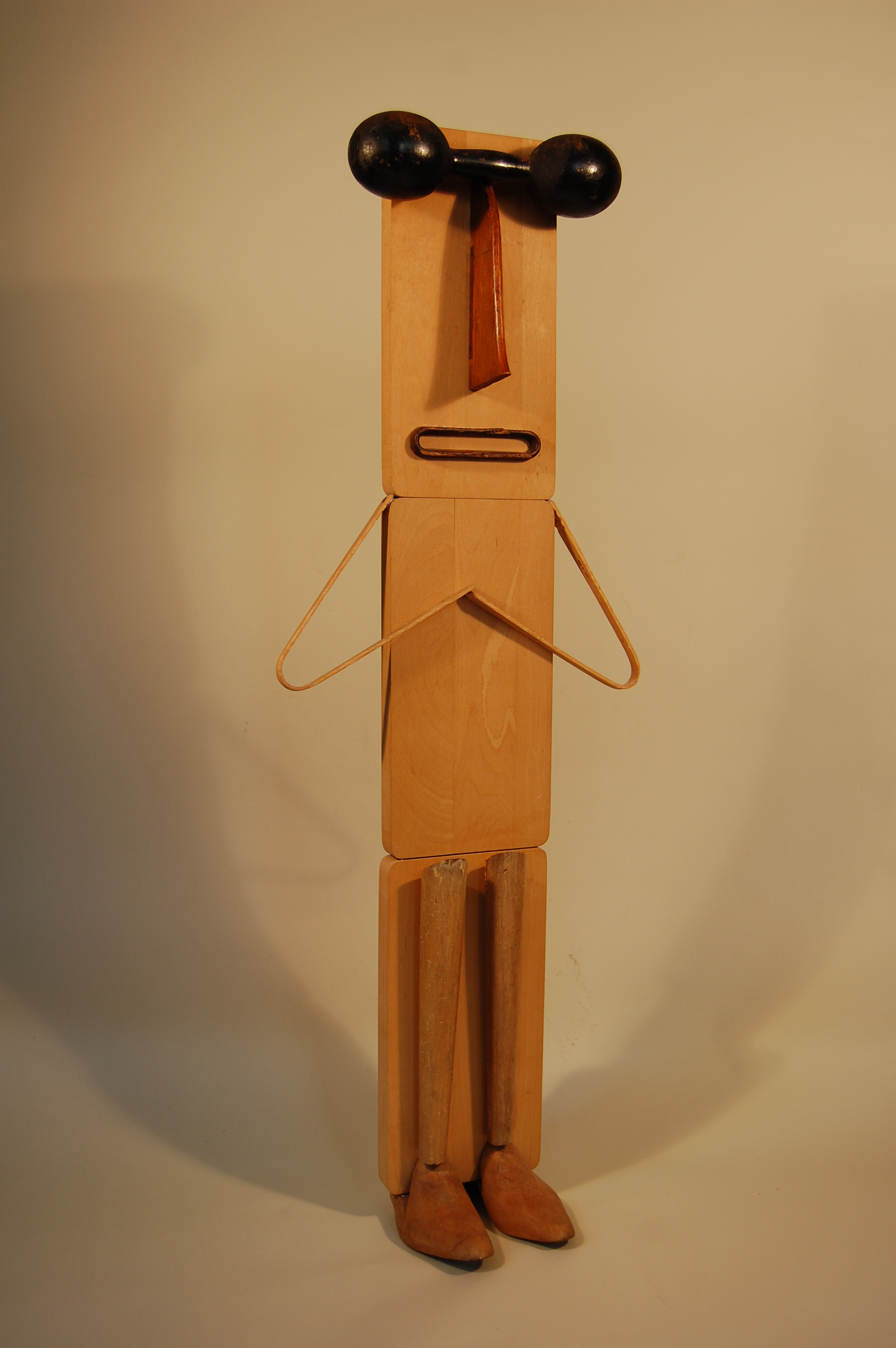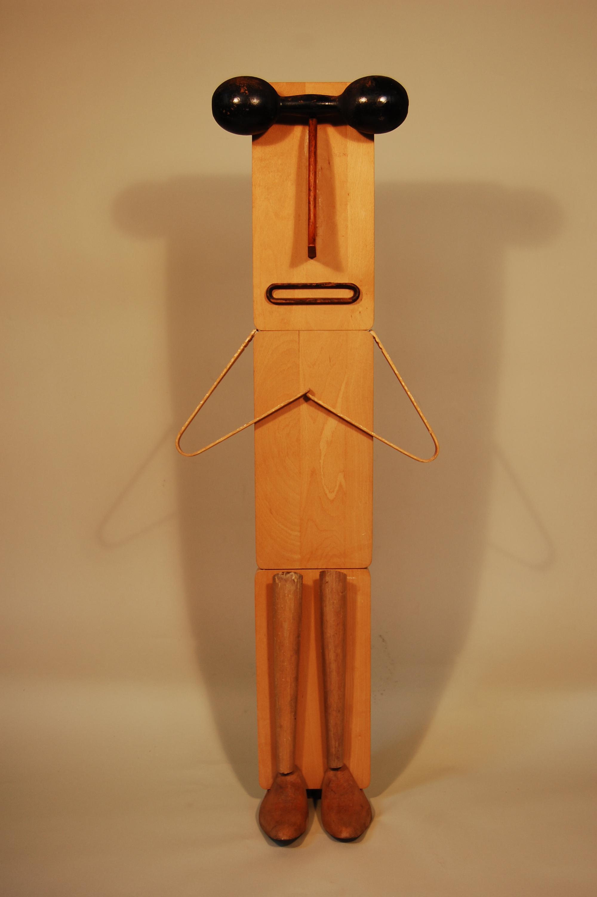 Description: Three vertical wooden boards are attached to form the body of this man. The top board, which represents his head, is detailed with wooden forms that represent facial features. A wooden dumbbell painted black represents his eyes, a triangular wooden form protruding outward represents his nose, and a narrow, horizontal, oval wooden form represents his mouth. The second wooden board represents his torso. Two wooden forms that resemble tongs flank his torso, representing bent arms that are drawn to his chest. Two cylindrical wooden forms are attached to the surface of the third wooden board, representing legs. Two wooden shoe lasts are attached below, representing feet.