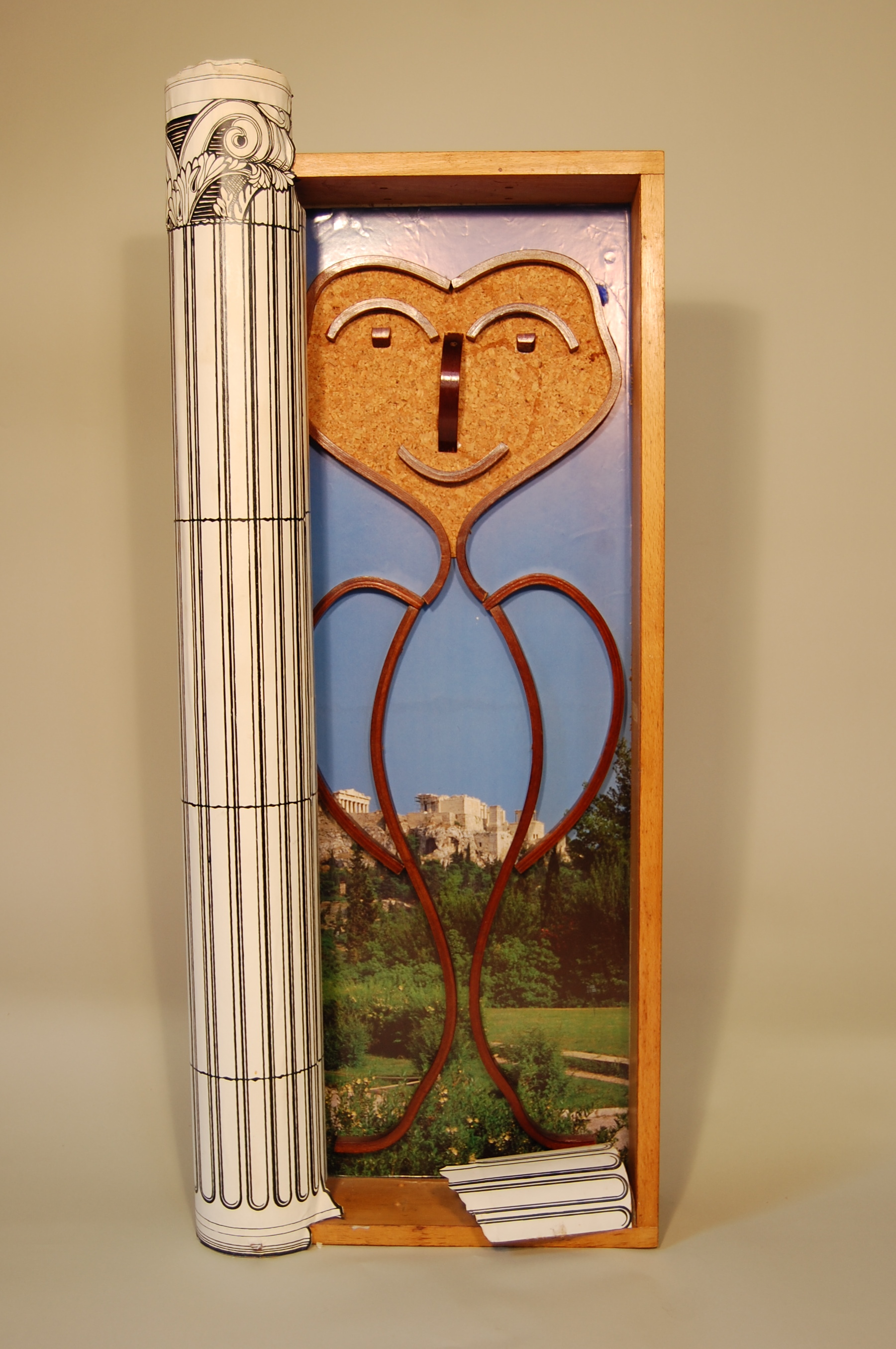 Description: A large box stands vertically, framing the image of a tourist visiting the Forum in Rome. Curved, dark wooden forms outline the body of the tourist, who stands with his arms at his waist. Cork board fills in the outline of his face. More curved, dark wooden forms represent his eyes, nose, and smiling mouth. A photograph of the Roman Forum lines the frame behind him. A paper representation of a Classical column is attached vertically along the left side of the box, extending slightly above the box’s top. A fragment of a Classical column, representing a ruin, rests at the tourist’s feet on the right side of the box.