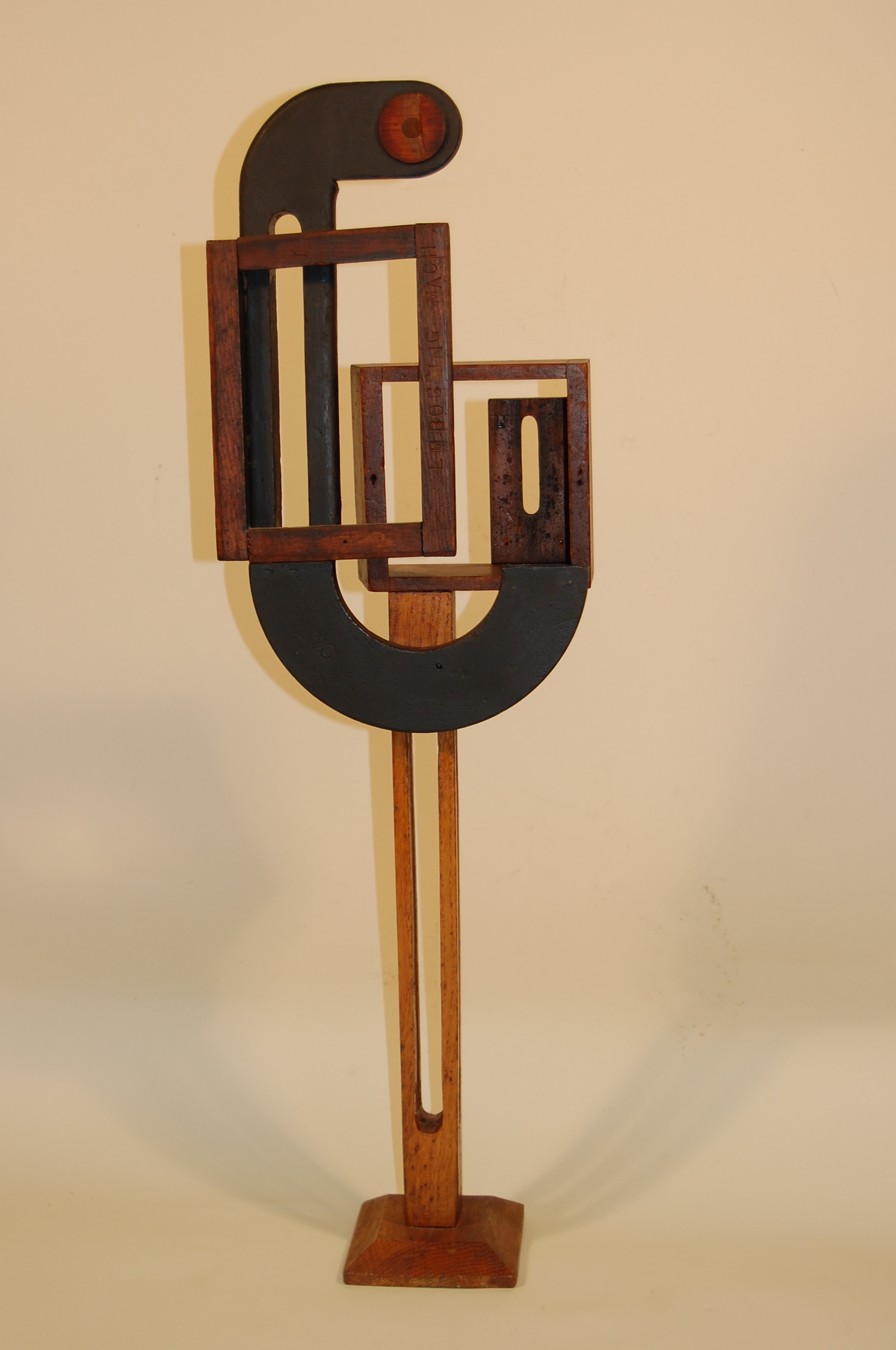 Description: This piece is inspired by Constructivist artist Picasso. Attached to a square wooden base is a hollow rectangular wooden form that supports two wooden boxes that partially overlap. Curved wooden forms painted black are attached to this abstraction.