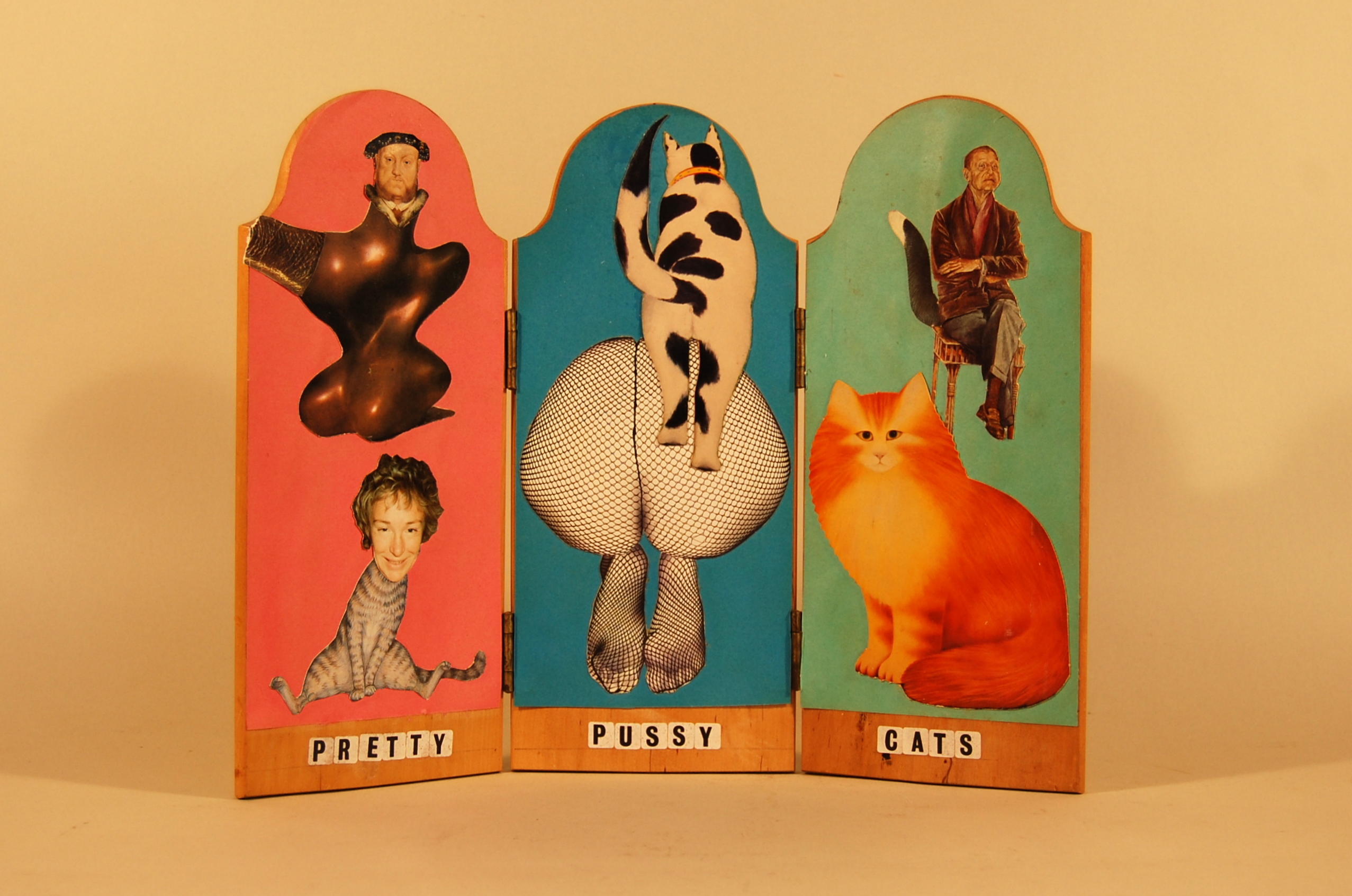 Description: Three identical wooden panels are attached with metal hinges, creating a triptych. Each panel is vertical and rectangular with arched tops. Each panel is covered with construction paper of a different color, which serves as a background for cutout images of cats, men, and women. The left panel, covered in pink construction paper, is embellished with a collage of images. The top collage combines the image of a metal sculpture with the image of the painted head of King Henry VIII. Below, a photograph of a woman’s face, identified as Patricia Lloyd, is attached to a cutout image of a cat’s body in a seated position with legs spread. At the bottom of the panel, the word “Pretty” is formed with black letters printed on white paper, cut into square shapes that are lined up like horizontal words on a Scrabble board. The middle panel, covered in blue construction paper, is embellished with the cutout of an image of a walking cat viewed from behind as well as the image of a nude woman’s body viewed from behind as she is bent forward on her knees while wearing only black fishnet stockings. The word “Pussy” is communicated at the bottom of this panel in the same manner as the first panel. The third panel, covered in green construction paper, is embellished with a cutout of the image of a large, seated orange cat. Above this image is a cutout of a man seated on a chair with his arms folded. A cutout of a tail is attached to his behind. The word “Cat” is affixed to this panel.