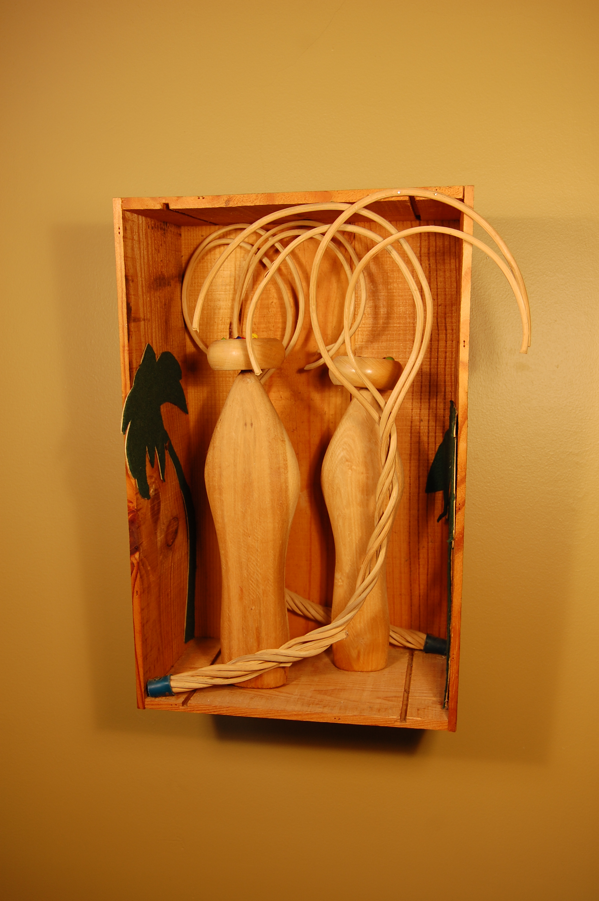 Description: Encased in a vertical wooden box is an outdoor scene of two women carrying goods on their heads. Two curved wooden forms are located at the center of the scene, representing the two standing women. Round wooden forms, each with a hollowed-out center, sit on their heads, representing baskets. Inside these baskets are colorful wooden beads, representing the goods that the women are transporting. Two palm tree silhouettes crafted from green felt are attached to the left and right inner walls of this scene. Two woven clusters of wicker frame this scene, representing two swooping palm trees. One is located at the rear of the box. The other is located at the front of the box; its palm leaves extend beyond the confines of the box.