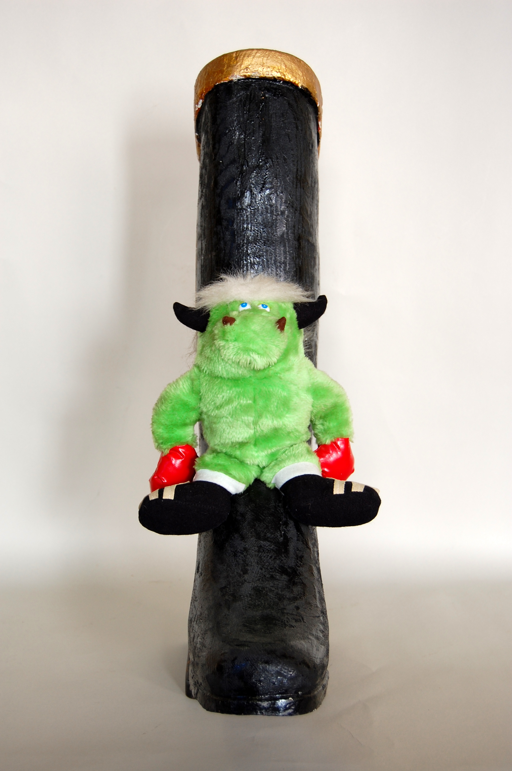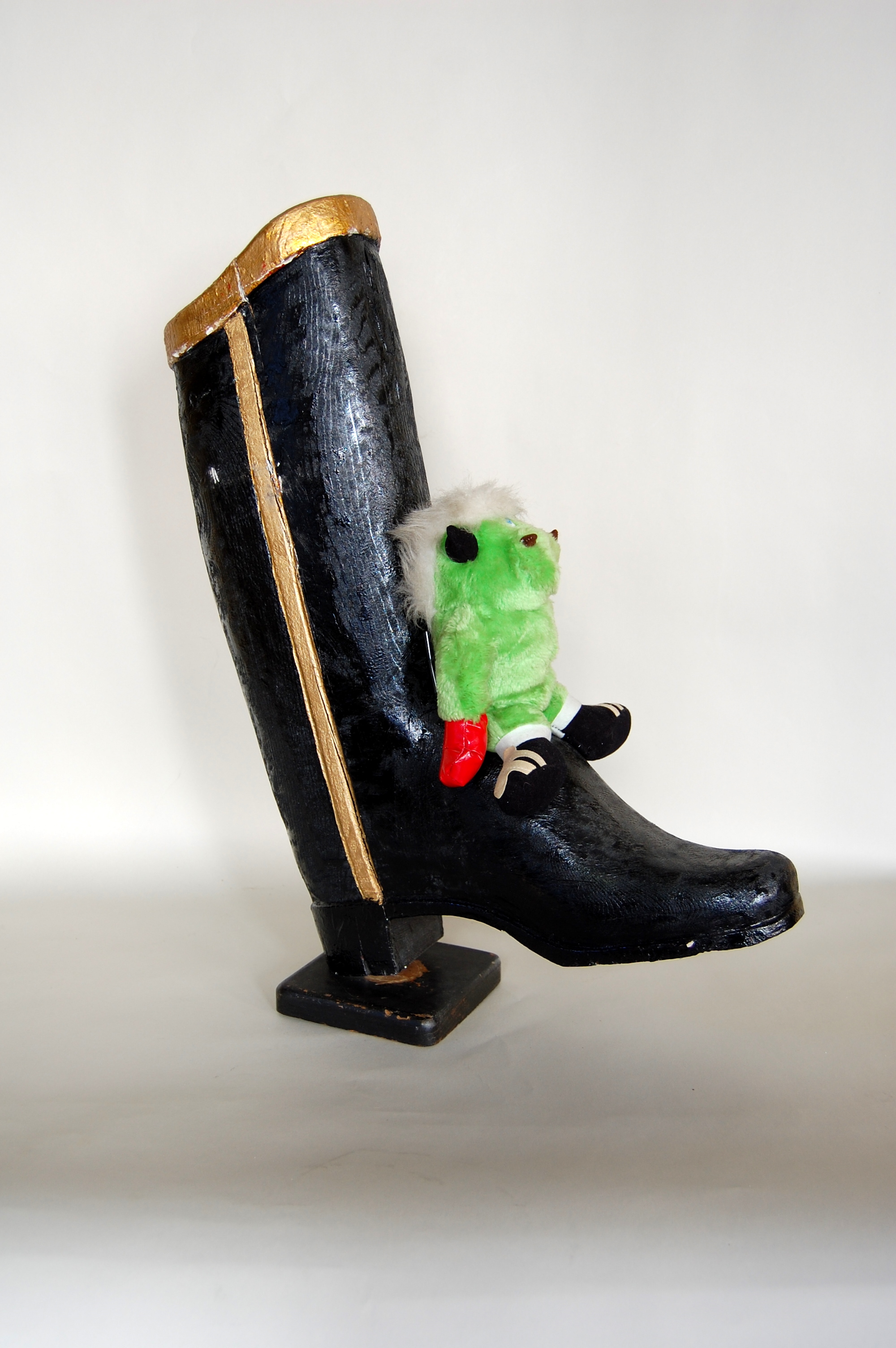 Description: A large wooden boot is painted with glossy black paint and detailed with gold paint. The toe-portion of the boot is pointed slightly upwards at 45 degrees from the floor. A plush green toy resembling a horned monster with red boxing gloves and black shoes sits on the front arch of the boot.