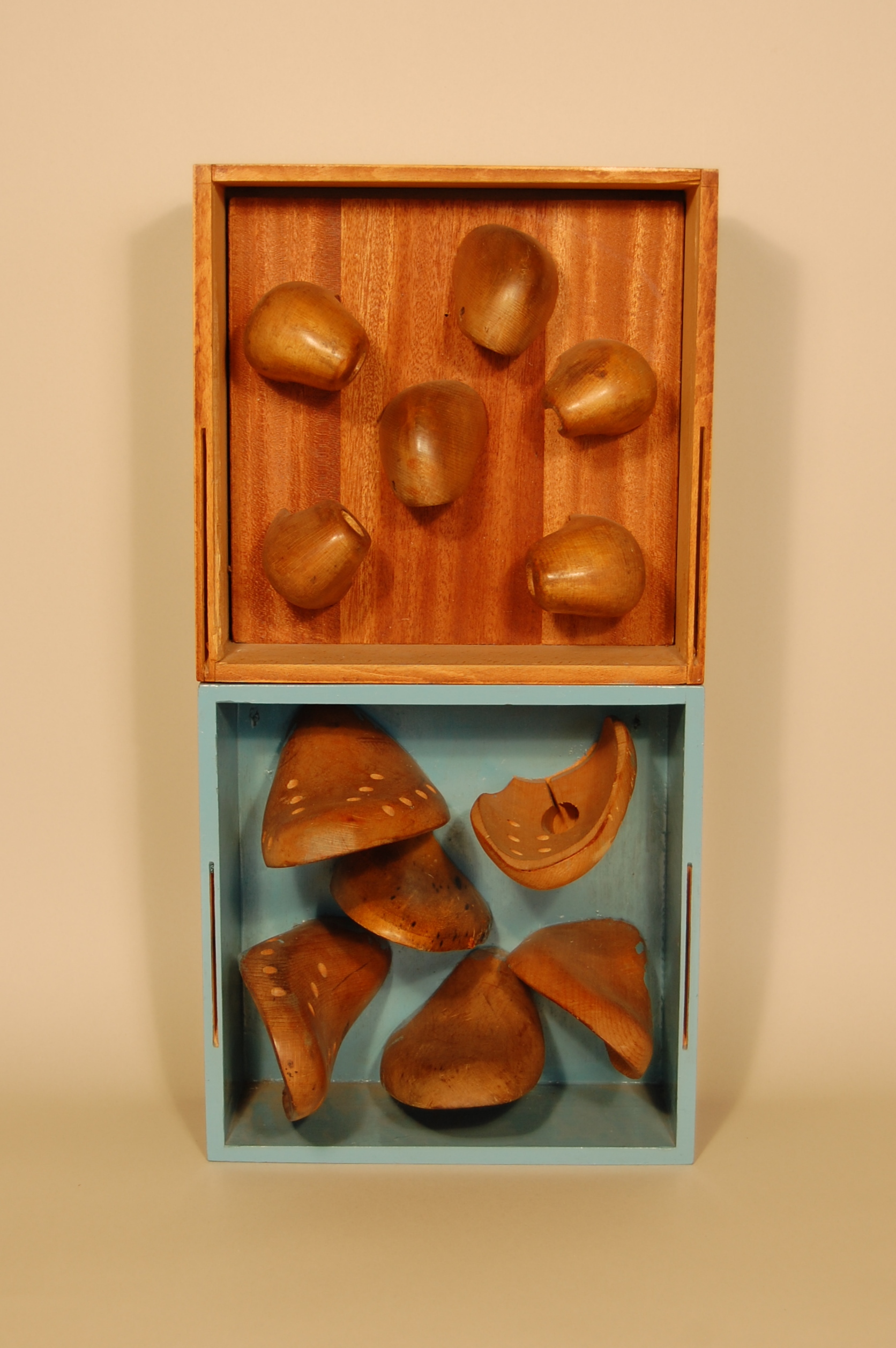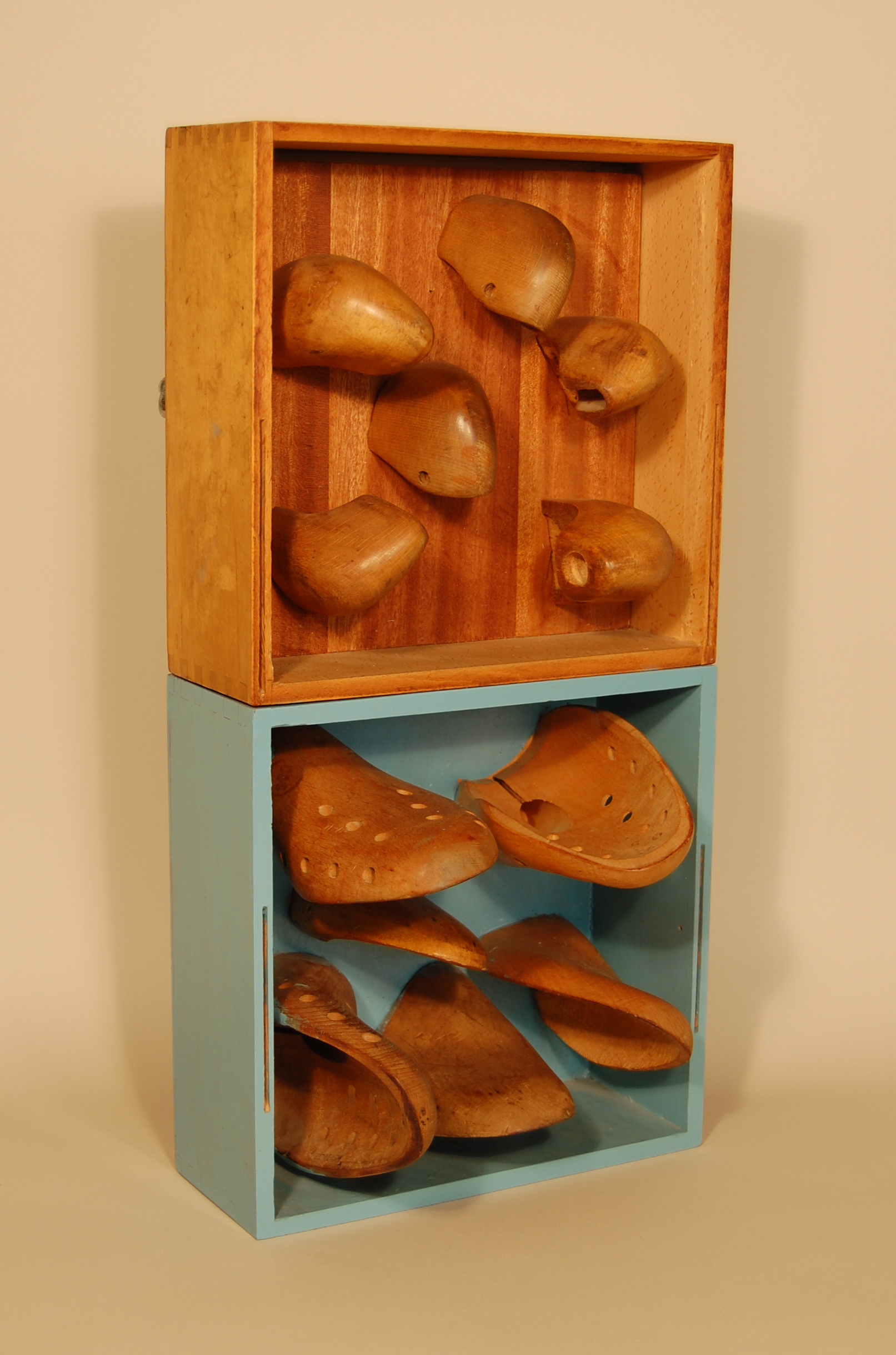 Description: Two shallow boxes of the same size are stacked on their sides, one on top of the other. Six heel portions of shoe lasts are attached to the back wall of the upper box, creating the appearance that the toe portions of the shoe lasts have been pushed through the wall of the box. The lower box is painted blue. Six toe portions of shoe lasts emerge from the back wall of the box, creating the impression that they have been pushed through the wall of the box.