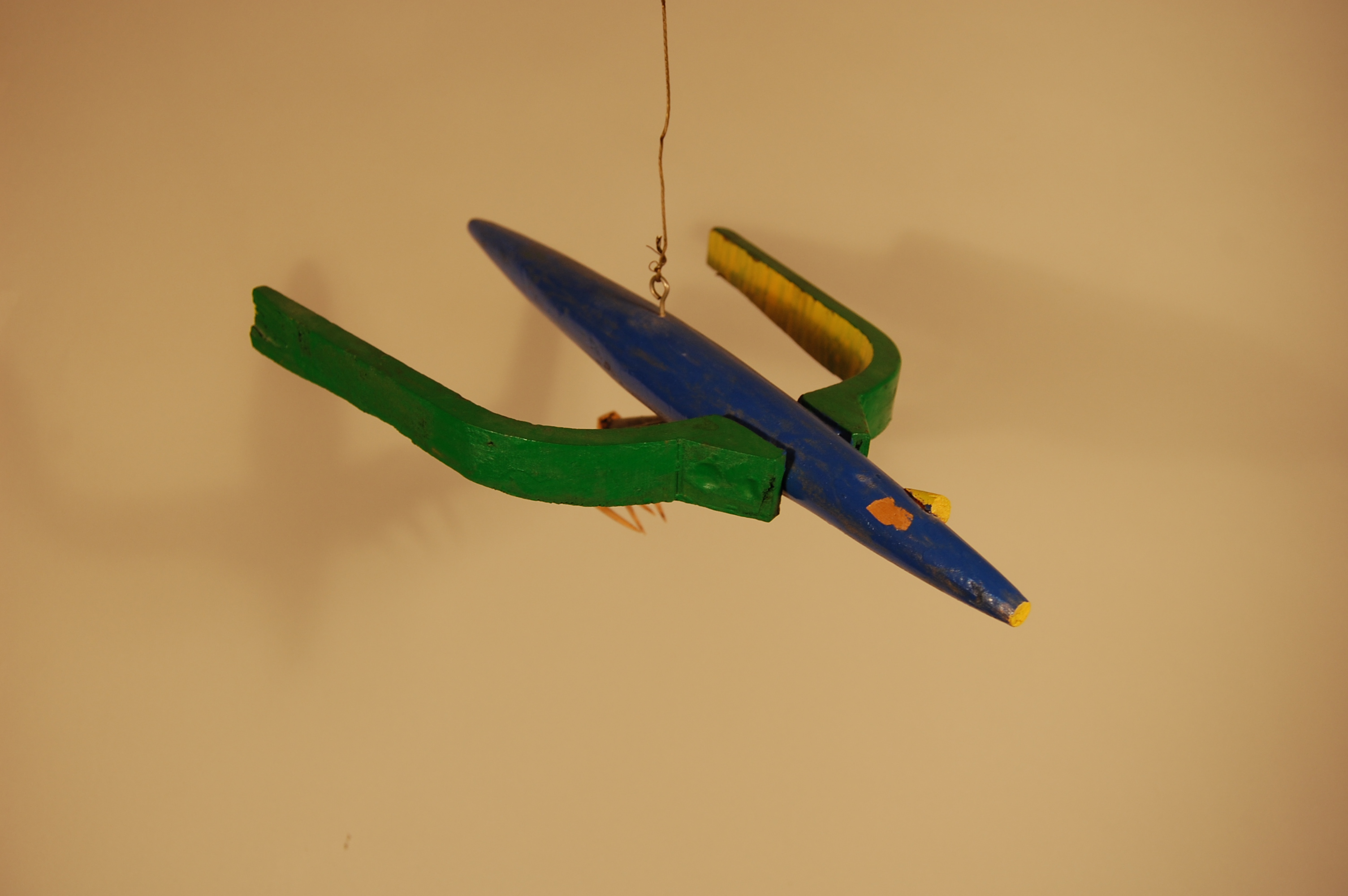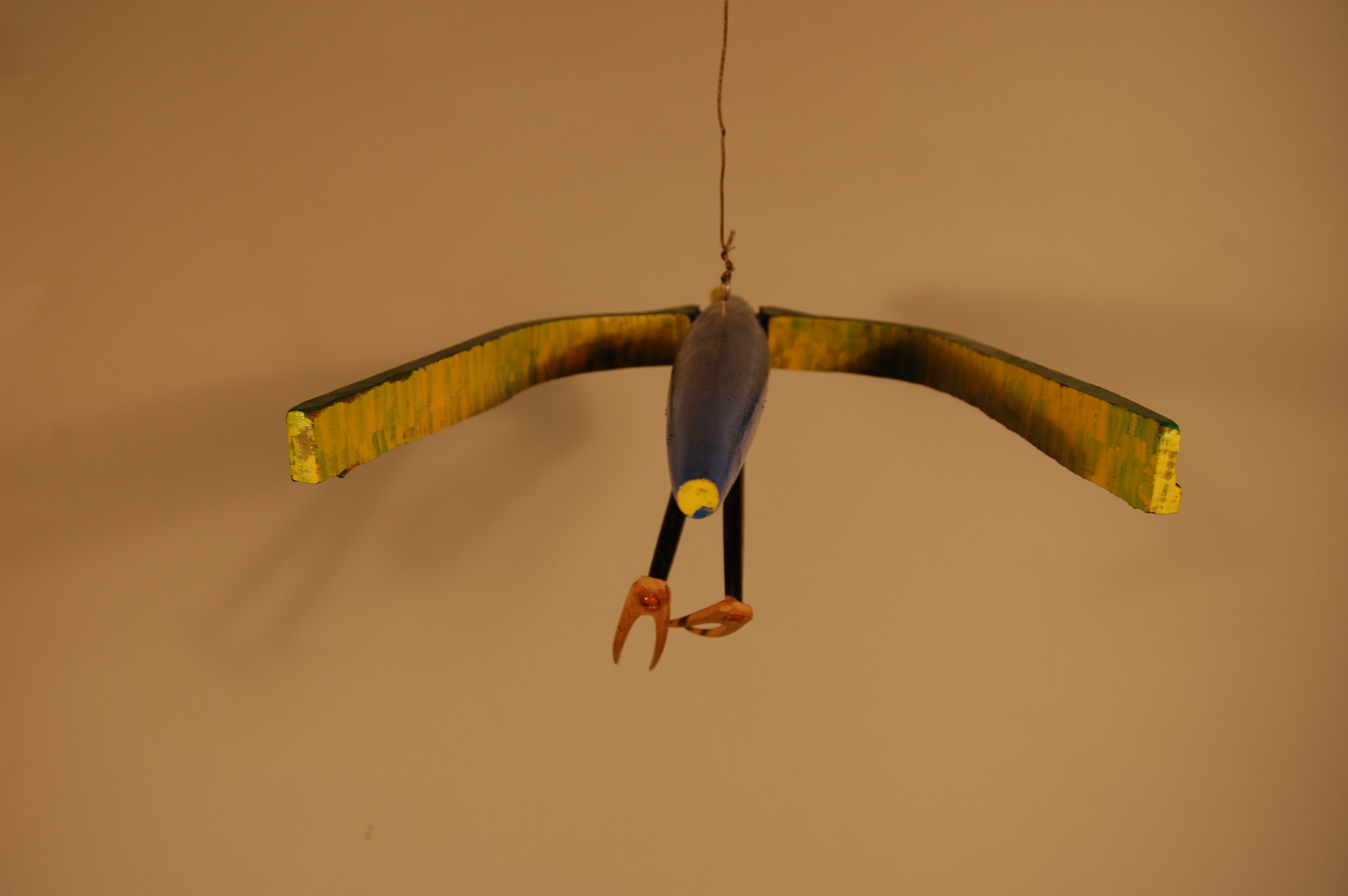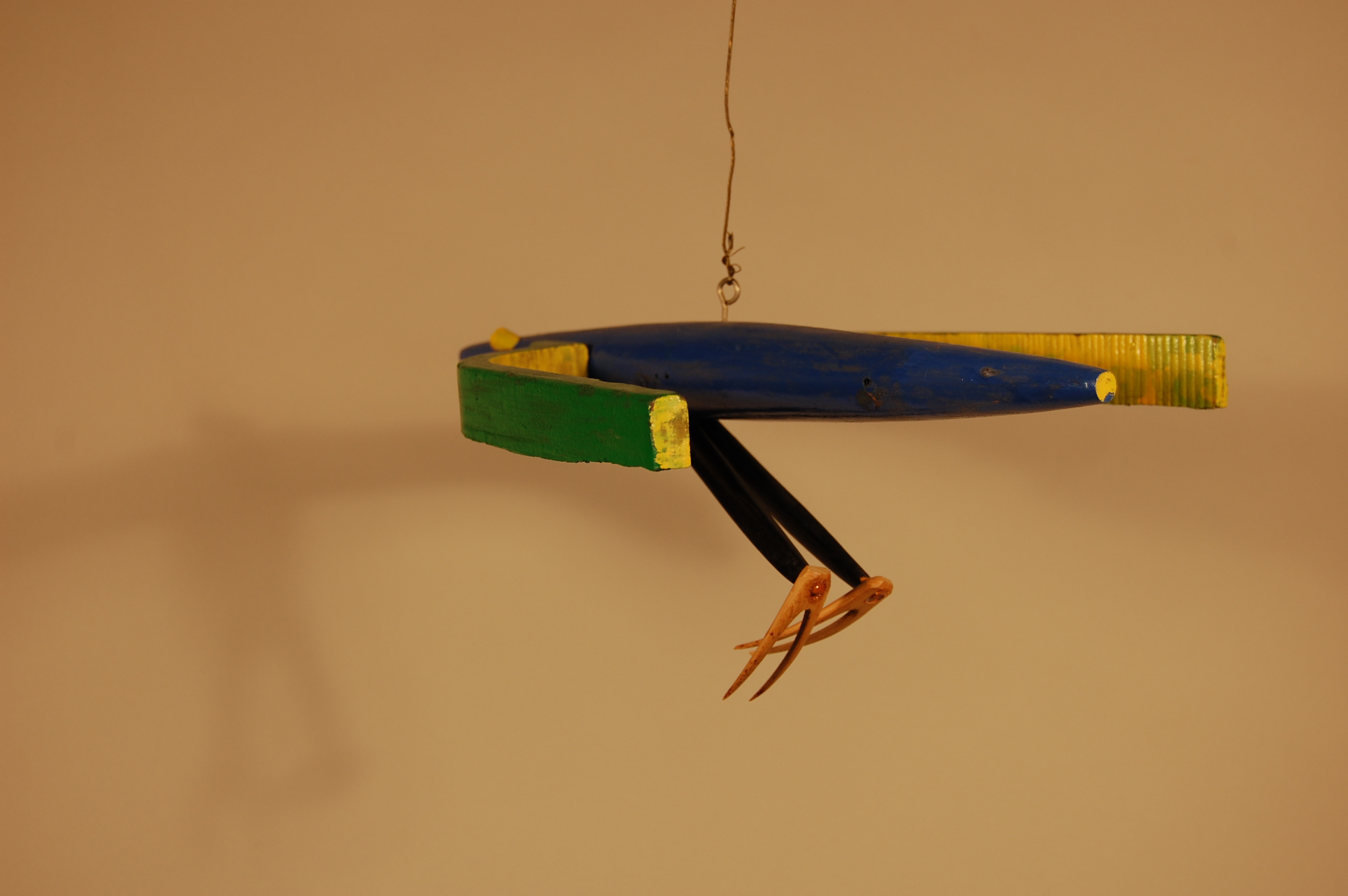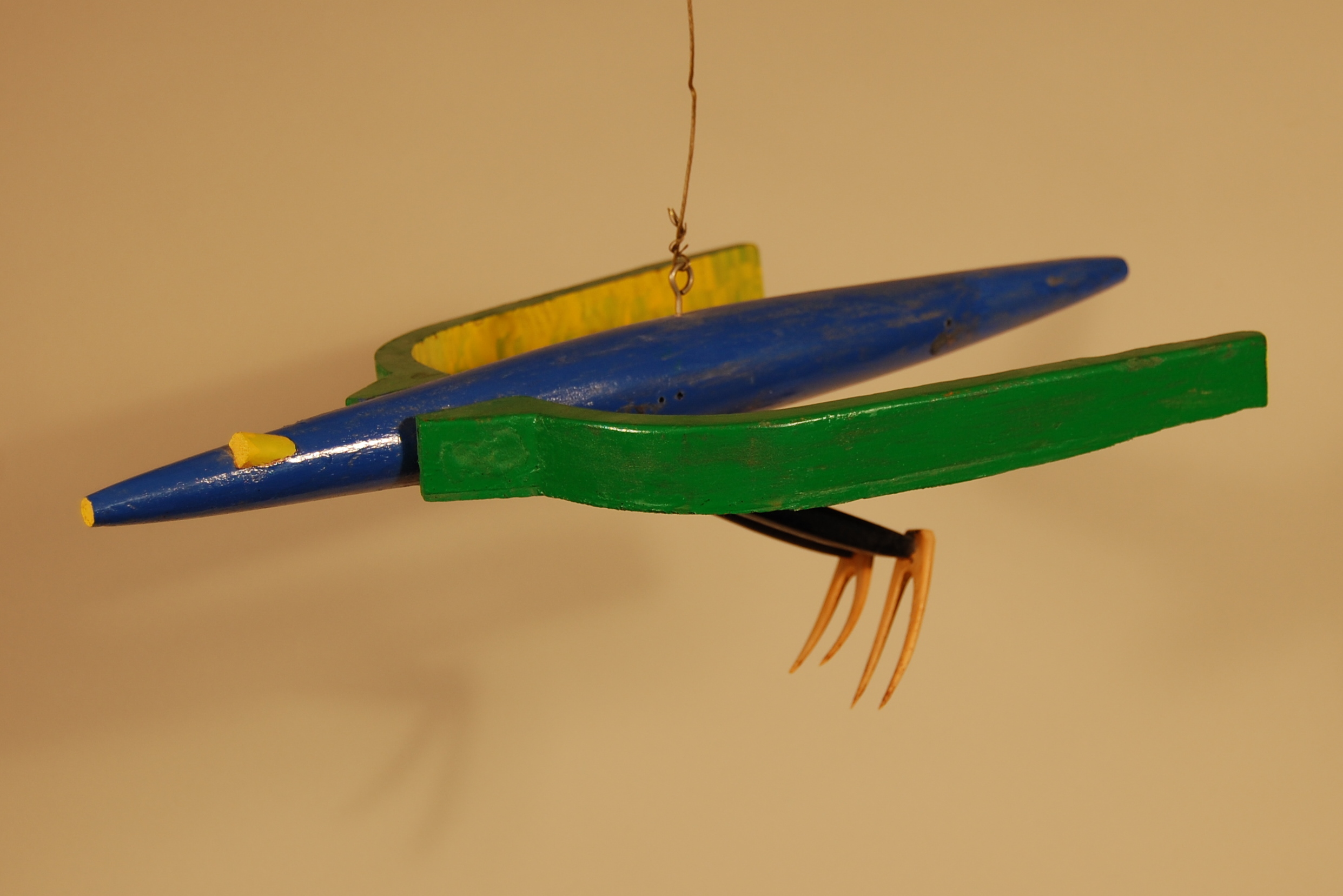 Description: One long, narrow, pin-shaped wooden form painted blue represents the body of this flying bird. Two small wooden forms painted yellow were attached to the front of the bird’s body, representing eyes; one eye remains. The tip of the bird’s face and tail are both painted yellow. Two identical arched wooden forms painted green flank the bird’s body, representing spread wings. The inner sides of the wings are painted yellow. Extending below the bird’s body are two thin, cylindrical wooden forms painted black that represent the bird’s legs. Attached to the end of each leg is a wooden form, each with two prongs, representing the bird’s feet. A metal loop has been inserted into the bird’s back, allowing the piece to hang.