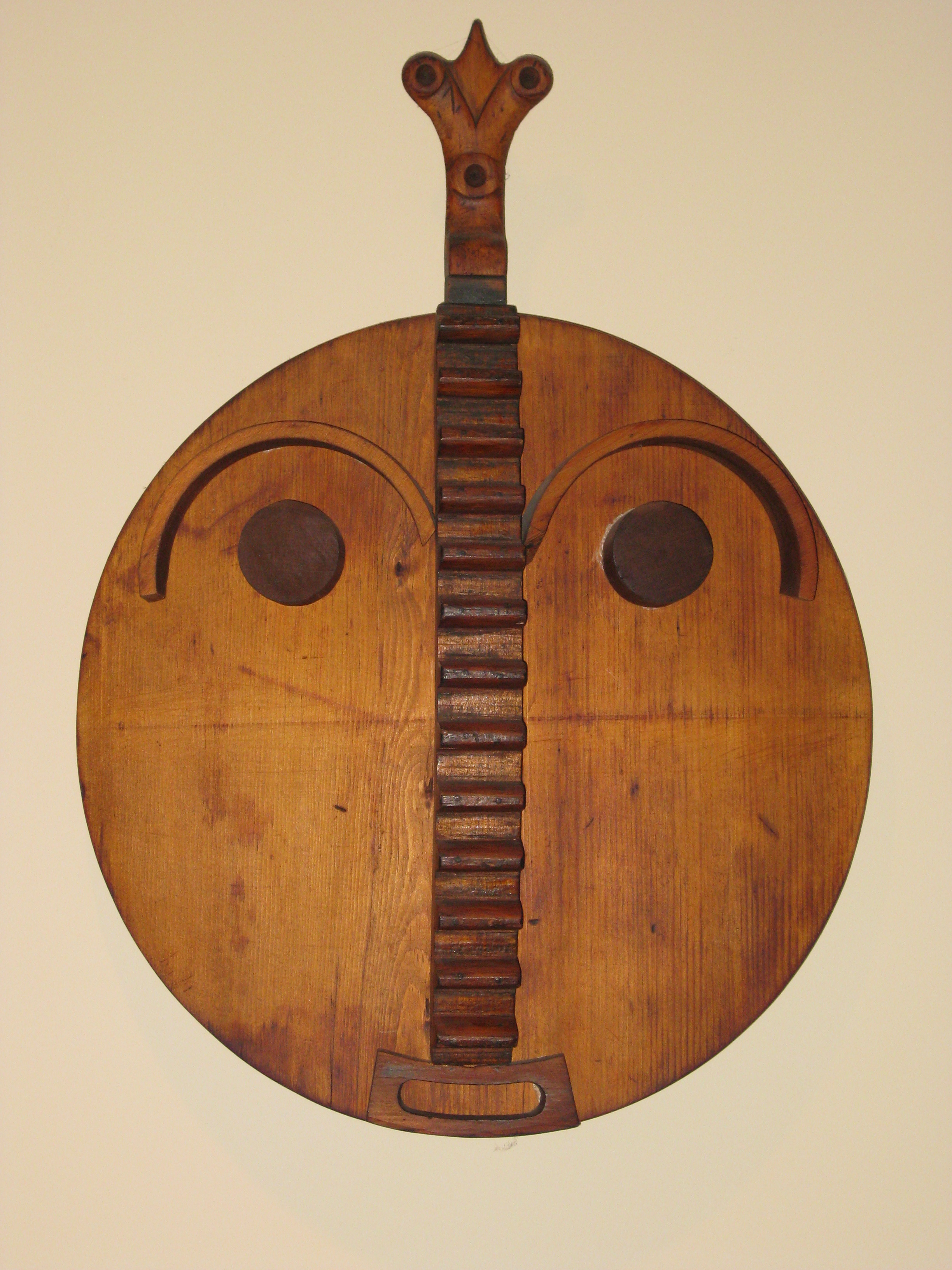 Description: A large wooden disc serves as the base for this hanging piece. Wooden forms are attached to its surface, representing facial features. A wooden guitar neck extends vertically across the center of the mask, representing the nose. Two identical circular wooden forms represent eyes. Curved wooden forms frame them from above, representing eyebrows. A wooden saw handle represents an open, smiling mouth.