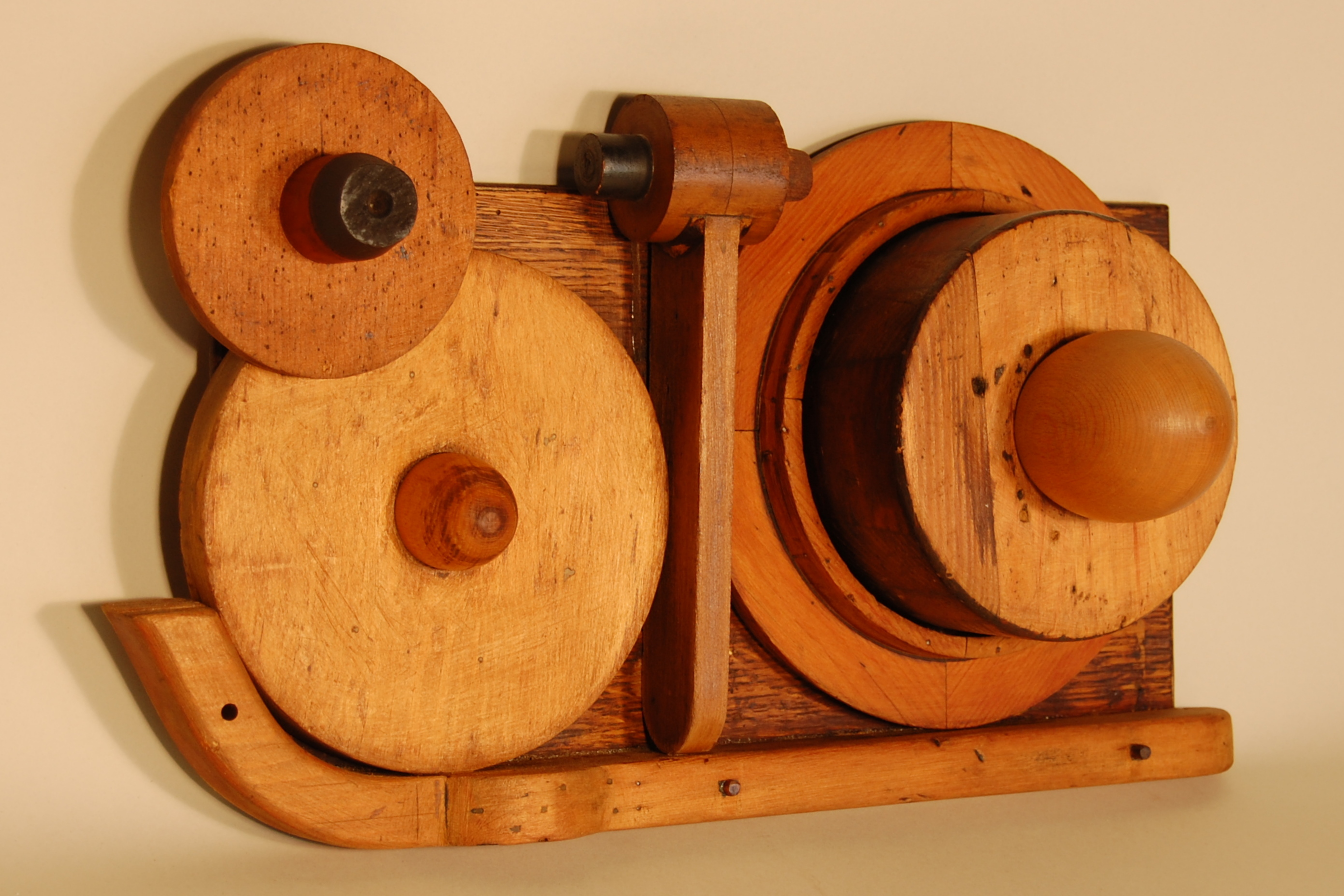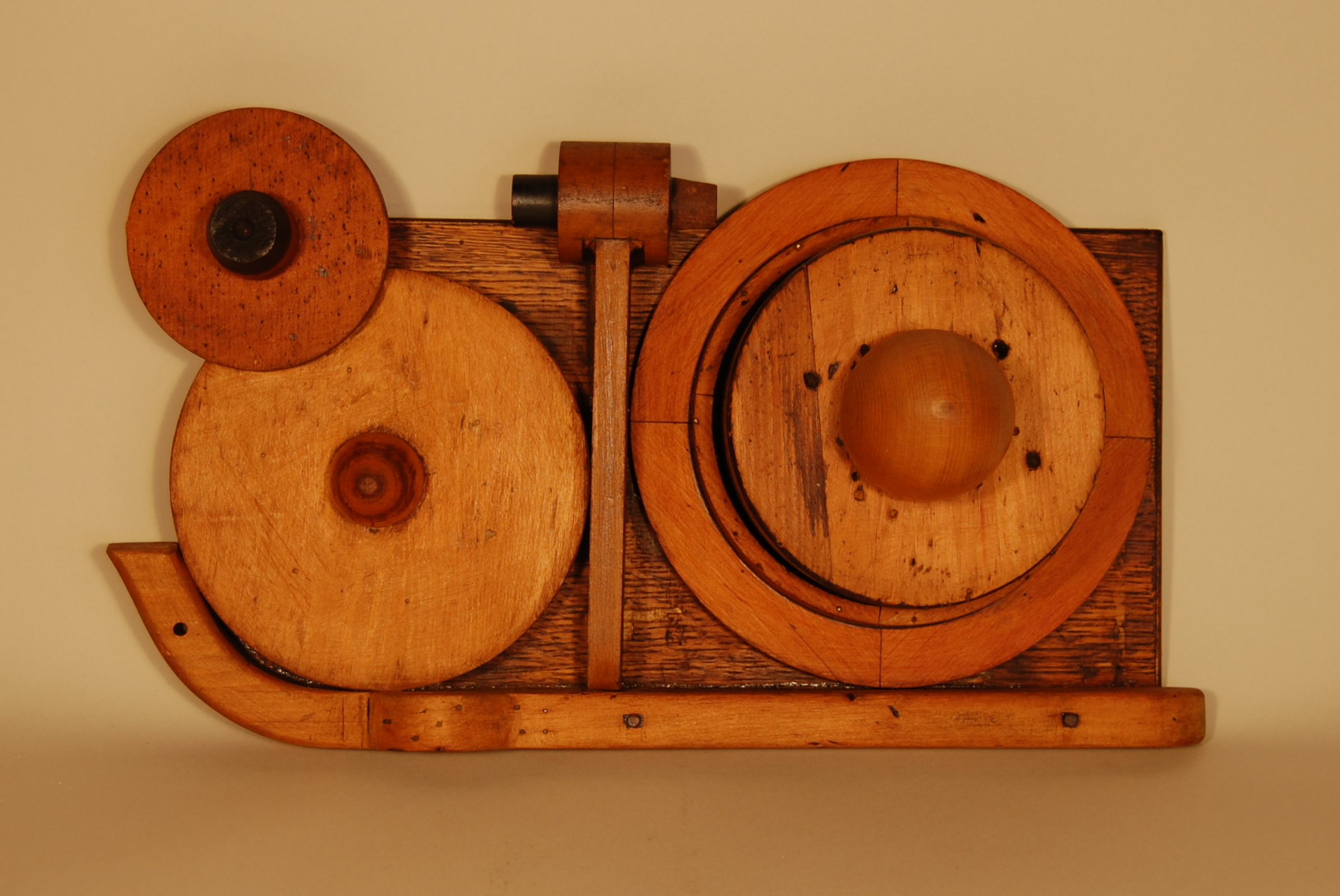 Description: A variety of wooden forms are attached to a horizontal wooden board that serves as its base. This abstraction features three groups of concentric circular wooden forms that give the impression of three large floating bubbles. In the center of this piece is a tall, narrow wooden form with a rounded form at its tip. The bottom edge of this piece is framed by a wooden form that extends from the right edge of the piece and curves around to the midpoint of the left side of the piece.