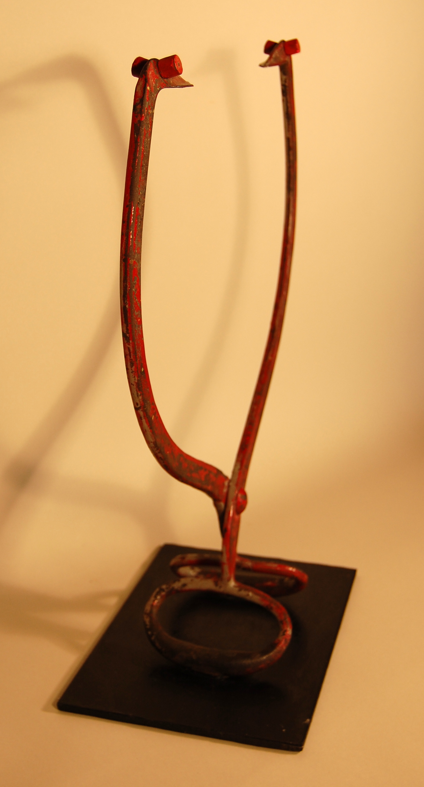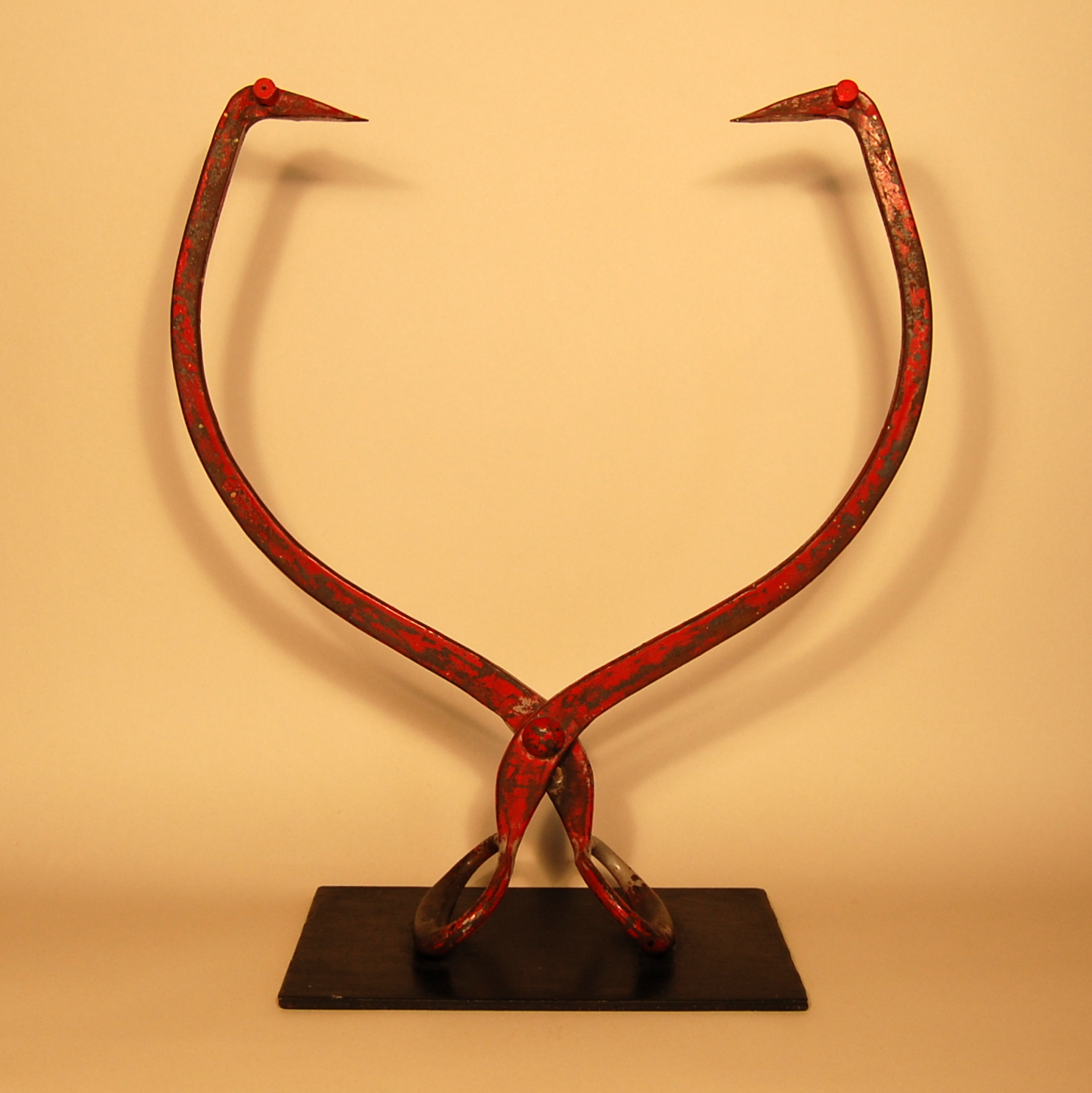 Description: An antique metal pair of ice tongs with red-stripped paint represents two mongooses. The ice tongs are placed upside down, with the tongs spread open and the handles secured to a rectangular metal plate. The pointed tips of each tong represent the head of a mongoose. A red-painted small circular magnet is attached to each side of the mongooses’ heads to represent eyes. The curve of the tongs represents the mongooses’ slender bodies.