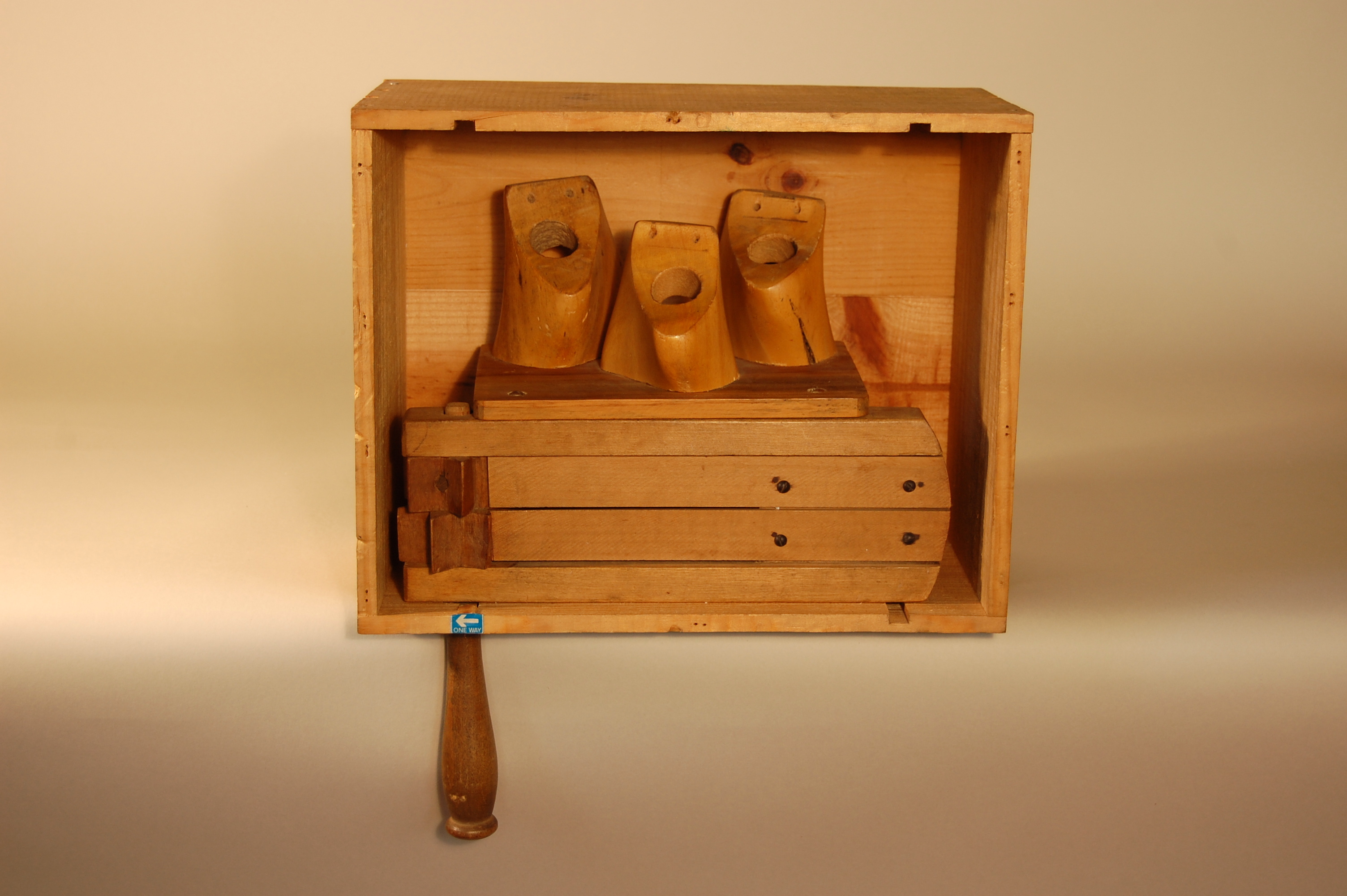 Materials and Techniques: Wooden box, wooden shoe lasts, wooden noise maker, paper sign