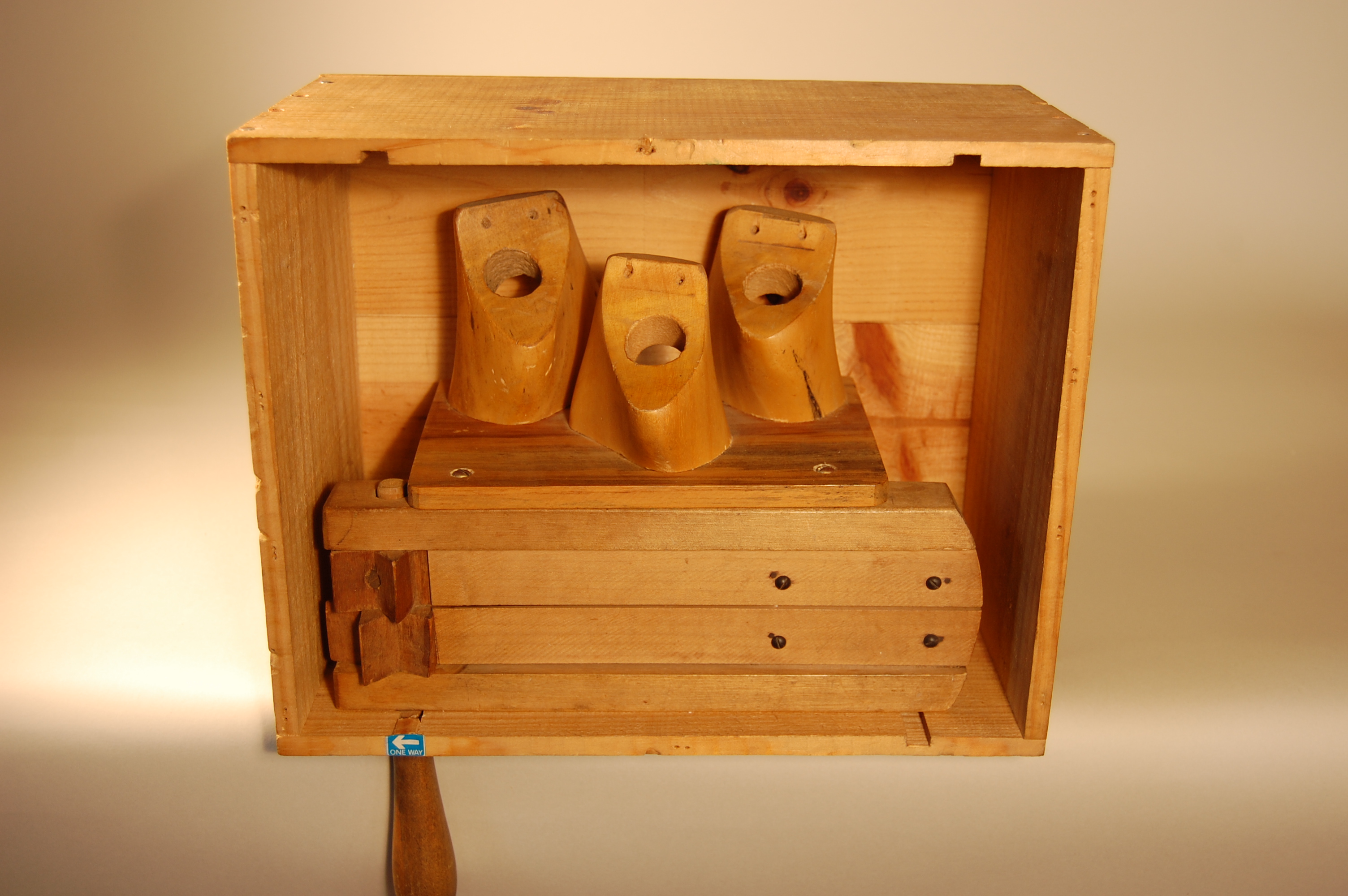 Description: A horizontal wooden box encloses this assemblage of three choir singers and a wooden noisemaker. The noisemaker rests on the bottom wall of the box, but its handle extends through the wall so that it projects downward outside of the box. A blue paper sign reads “Turn ß,” instructing the viewer to turn the handle of the noisemaker in order to make noise. Within the box, three identical portions of wooden shoe lasts rest on top of a wooden board that rests on the noisemaker, as though it is a stage. Two small, preexisting drilled holes appear in each shoe last, representing eyes. A pre-existing large circular hole appears in all three of the shoe lasts, representing open mouths positioned to project a large melodic sound.