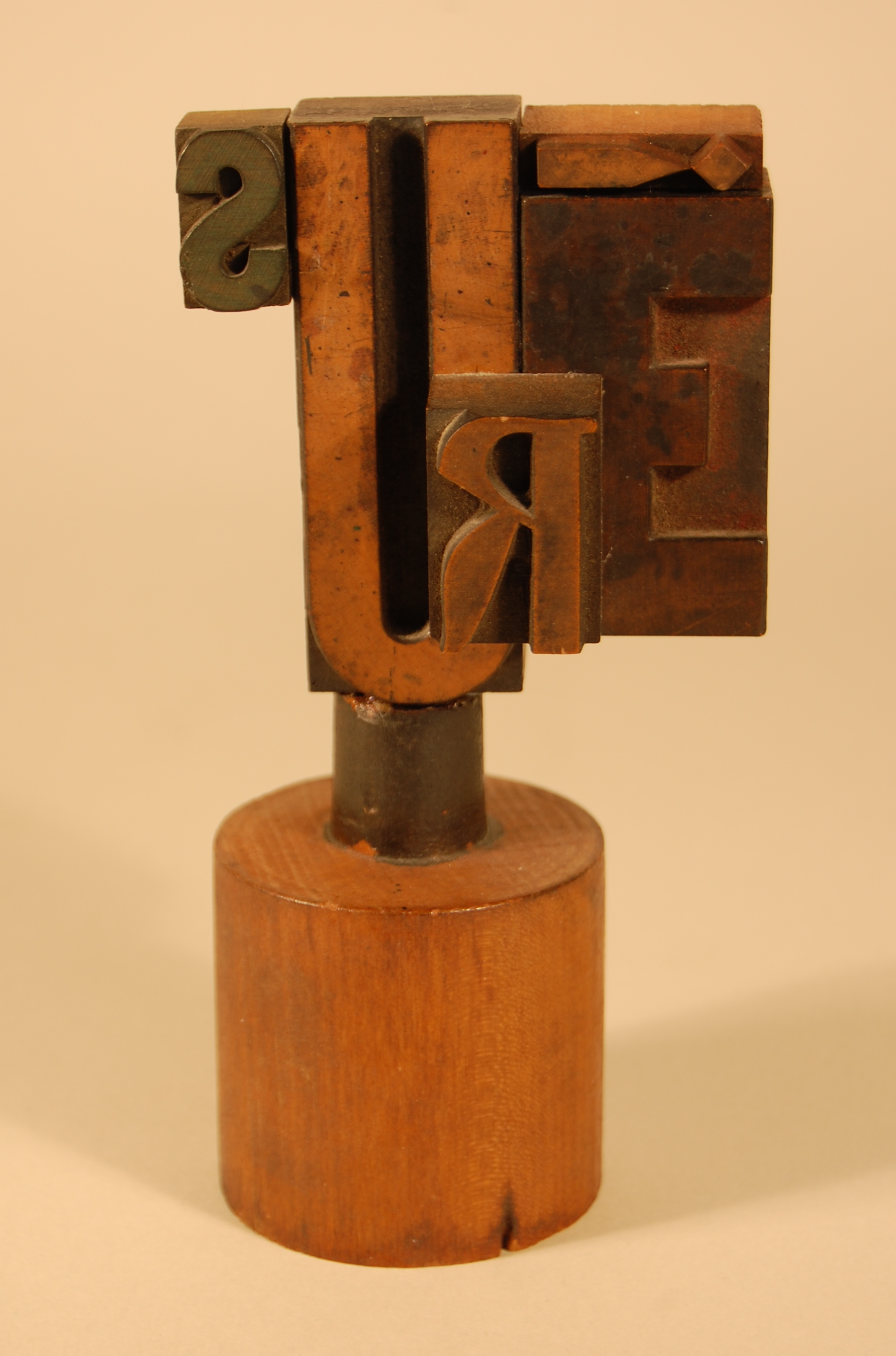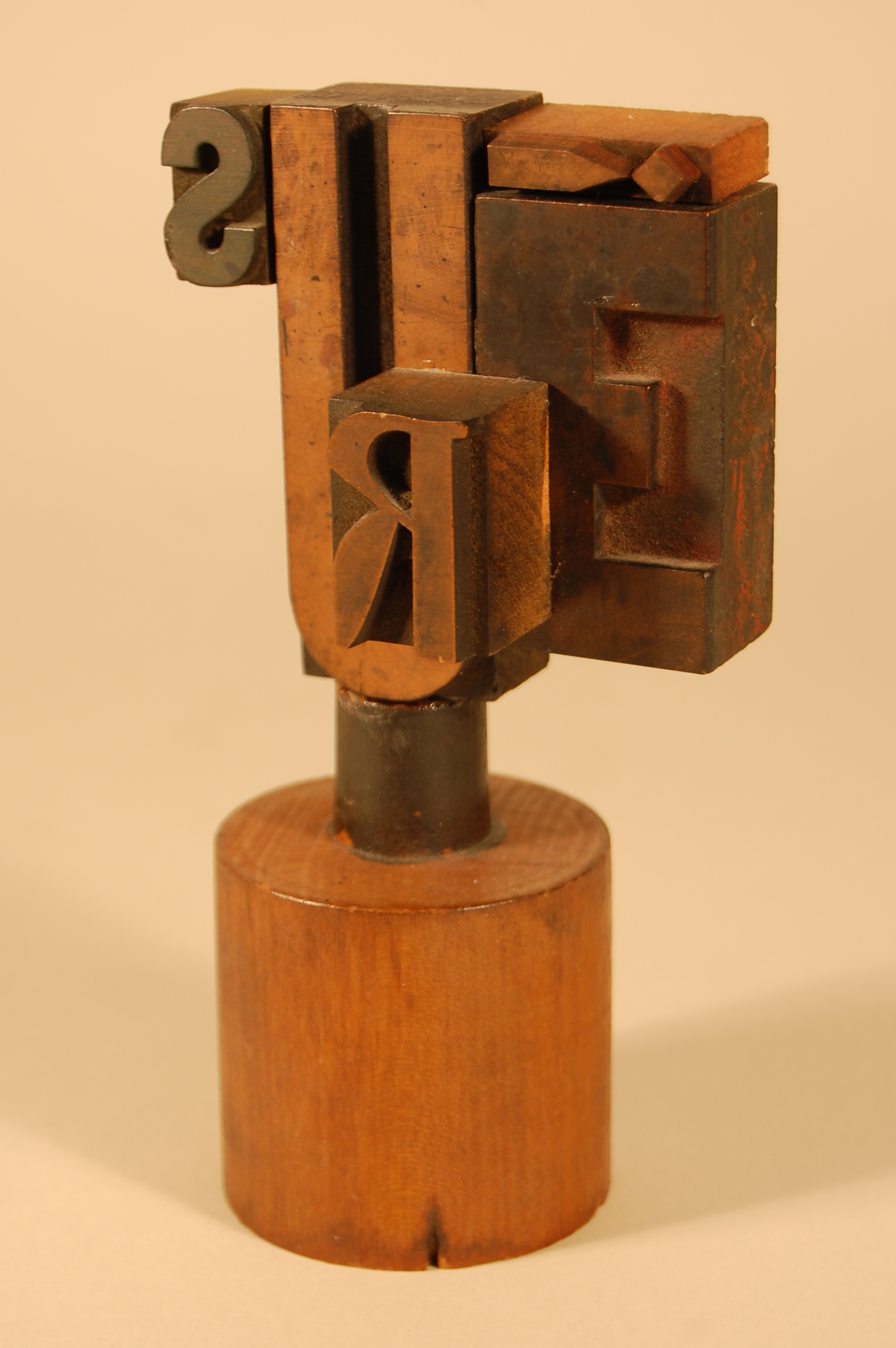 Description: Five wooden stamps with individual letters S, U, R, E, and an exclamation point are assembled and stacked to read “SURE!” The stamps with letters S, R, and E have a light black stain. The stamps with the letter U and the exclamation point are both a natural wood color. A small cylindrical black-painted wooden form attaches this assemblage to a larger cylindrical wooden form that serves as its base.