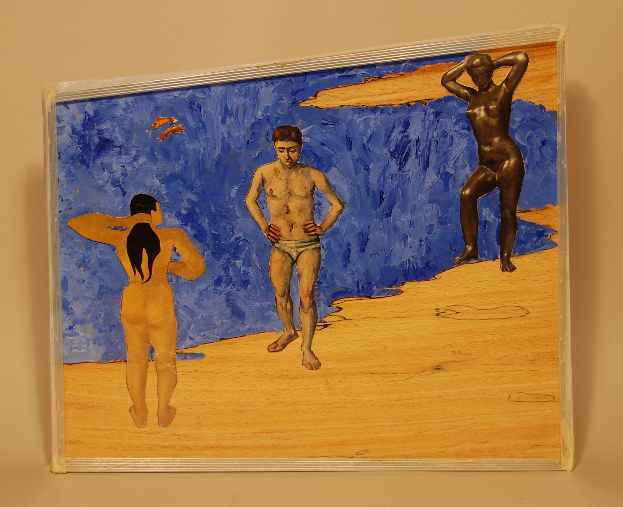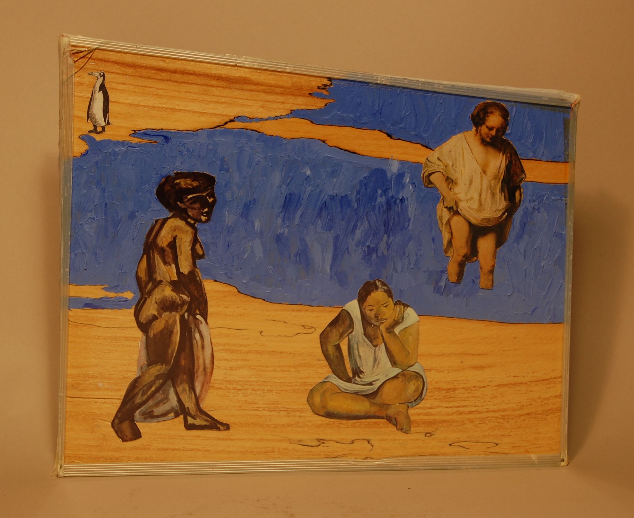 Description: Attached to the surface of a wooden board is a double-sided beach scene. Blue oil paint represents water and cutouts of figures and animals are placed into the scene. Front: A woman stands while holding her hair back in her left hand (Tahitian Women Bathing, 1892, Paul Gauguin, French, Paris 1848-1903 Atuona, Hiva Oa, Marquesas Islands, The Metropolitan Museum of Art), a boy stands with his hands on his waist (The Bather, 1885, Paul Cézanne, French, Aix-en-Provence 1839-1906 Aix-en-Provence, MoMA), and a woman stands to the right with her arms raised behind her head (Standing Woman Bather, 1900, Aristide Maillol, French, Banyuls-sur-Mer 1861–1944 Perpignan, The Hermitage). Two small fish swim in the water. Reverse side: A woman stands to the left (Standing Nude, 1907, Henri Matisse, French, Le Cateau-Cambrésis 1869–1954 Nice, Tate), a woman is seated on the sand with her legs folded (The Brooding Woman, 1891, Paul Gauguin, French, Paris 1848–1903 Atuona, Hiva Oa, Marquesas Islands, Worcester Art Museum), and a woman stands in the water and holds her garment in her hands (A Woman bathing in a Stream, 1654, Rembrandt van Rijn, Dutch, Leiden 1606–1669 Amsterdam, The National Gallery). A small penguin stands in the distance in the far left hand corner.