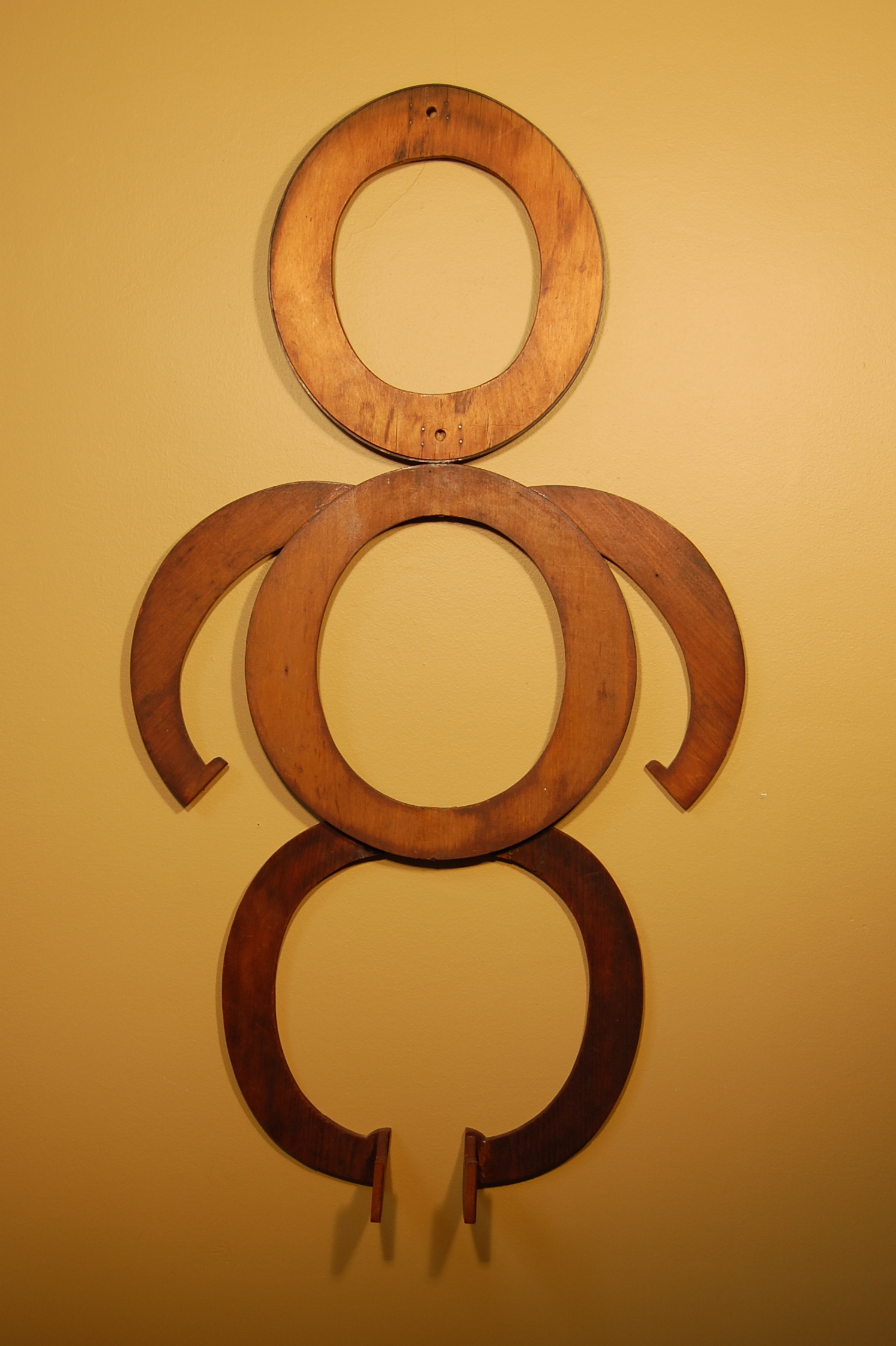 Description: This hanging piece is made with a variety of wooden forms that represent a man’s body. A ring-shaped wooden form framed by a thin metal bar represents the man’s head. An additional ring-shaped wooden form is attached below, representing his body. Attached on both sides are identical curved wooden forms with a small lip at their tips, representing arms and hands. Below, two identical half-ring shaped wooden forms represent bent legs. Attached to the ends of the legs are identical small wooden forms with a small lip that project from the wall, representing feet.