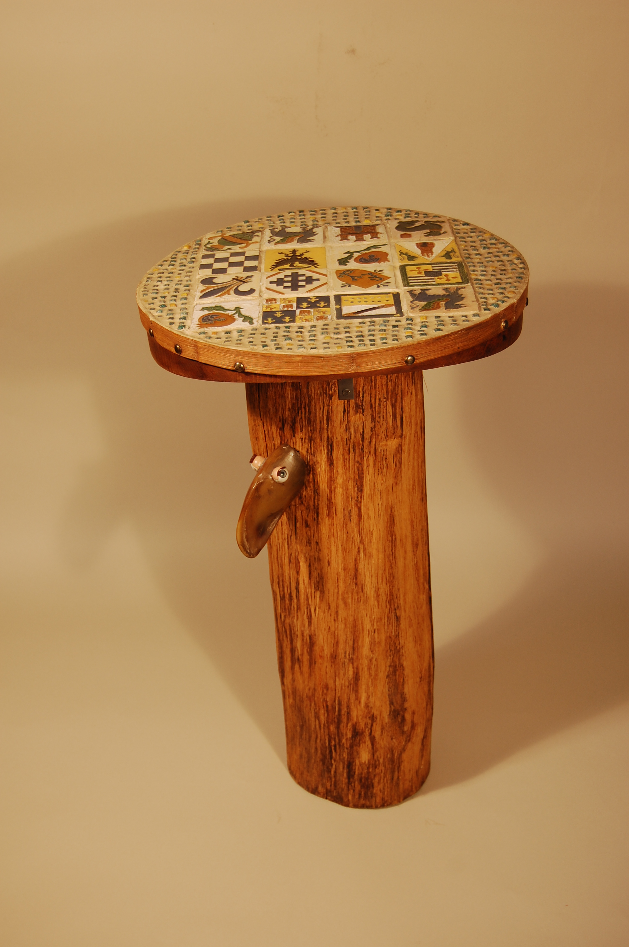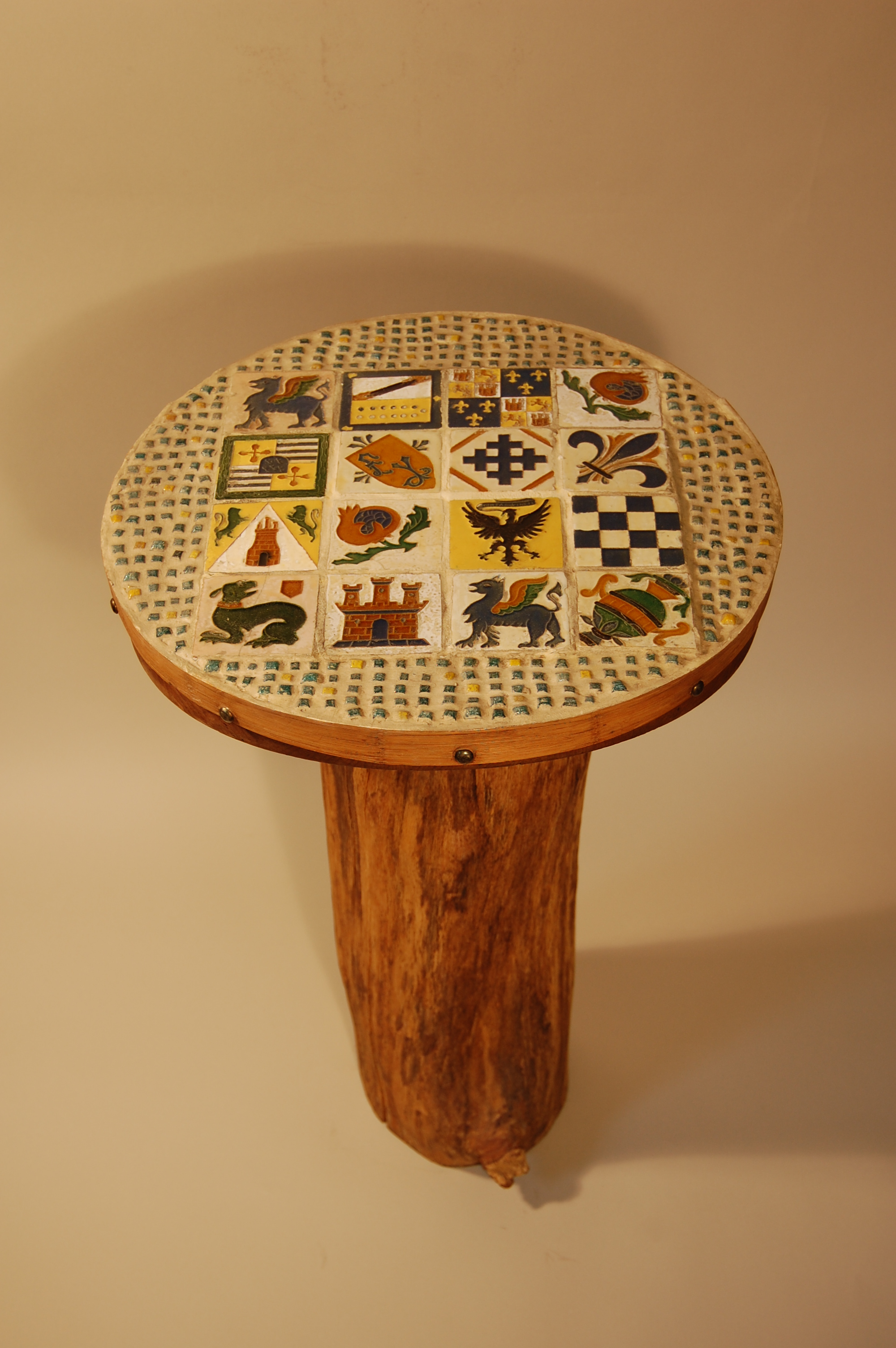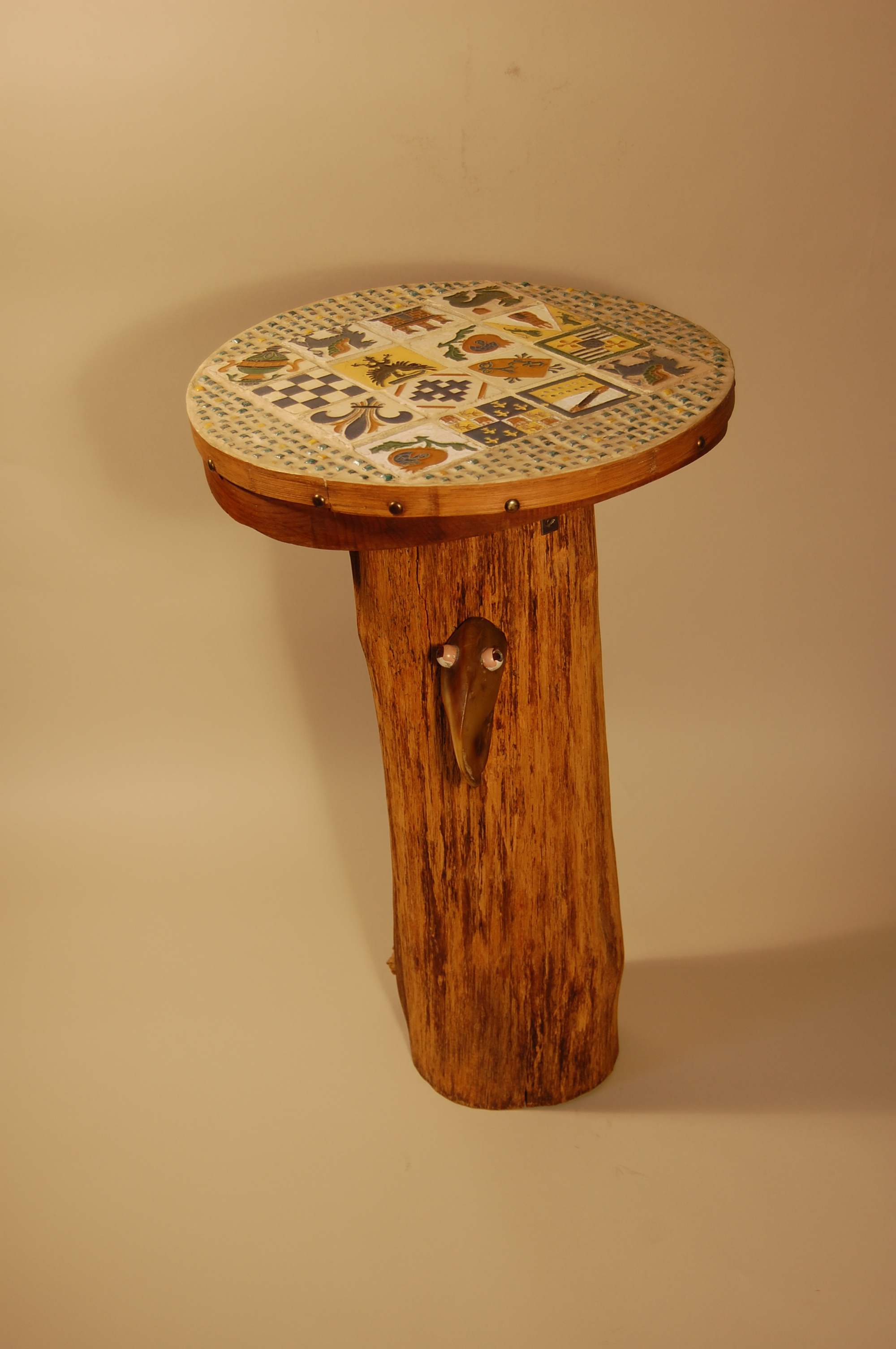 Description: A wooden tree stump serves as the base for this small table. The table’s round surface, supported by a round wooden form, is covered with a layer of a mosaic design contained within a thin round, wooden frame. Ceramic square tiles with coat of arms designs are aligned into a 4×4 square formation within the grout. Filling the remaining circular space are small turquoise and yellow Italian glass tiles. Attached to the mid-point of the tree stump base is a ram’s horn with two plastic eyes with eyelashes attached, representing an animal that is poking its head from within the tree trunk.