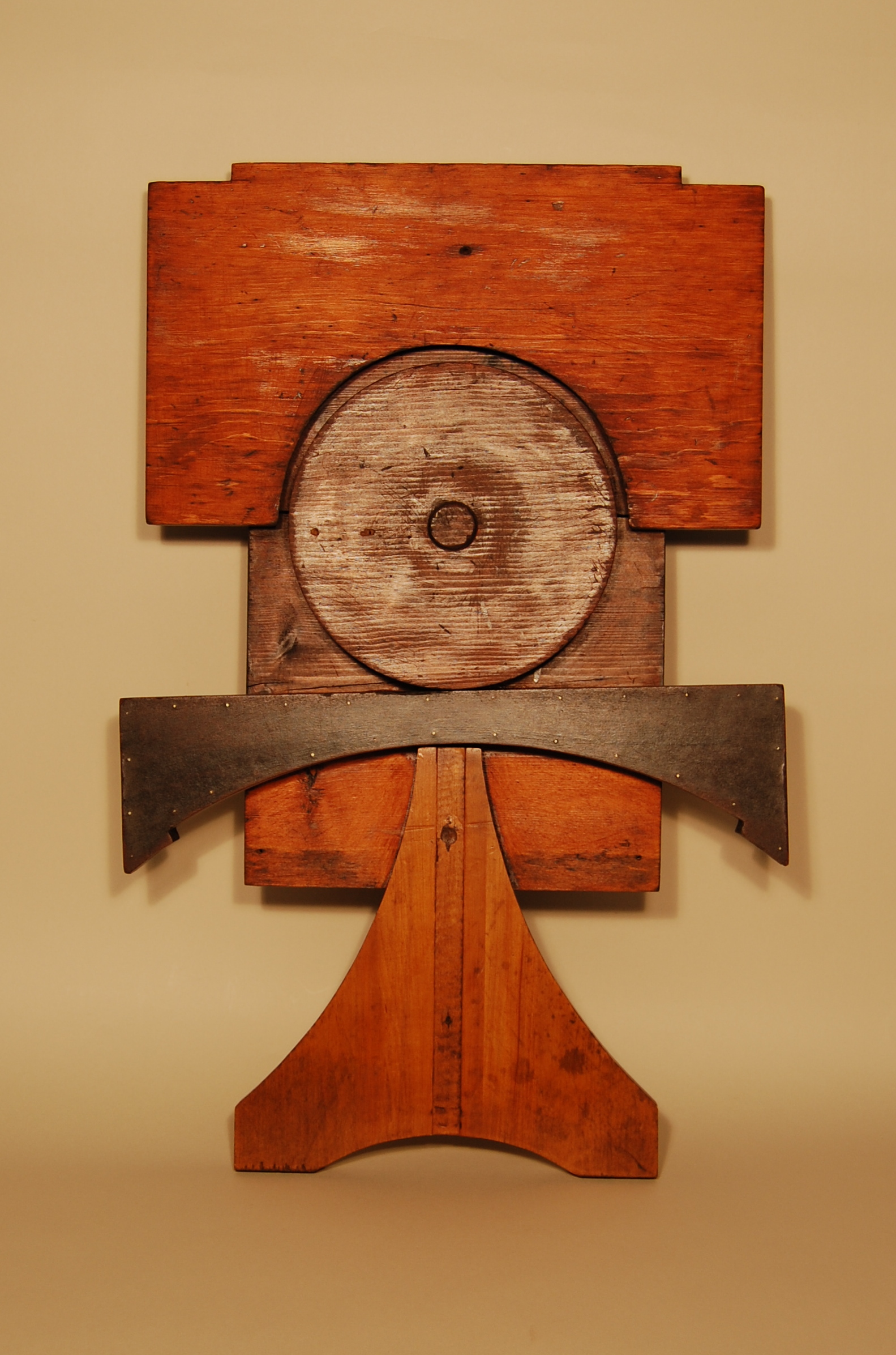 Description: A variety of wooden forms represent a person’s body. A round wooden form represents the head, an angular shape curves around the head to represent hair, an angular shape with a curved bottom represents arms, and a rounded triangular form represents the torso and legs. This figure is mounted against a vertical, rectangular wooden base.
