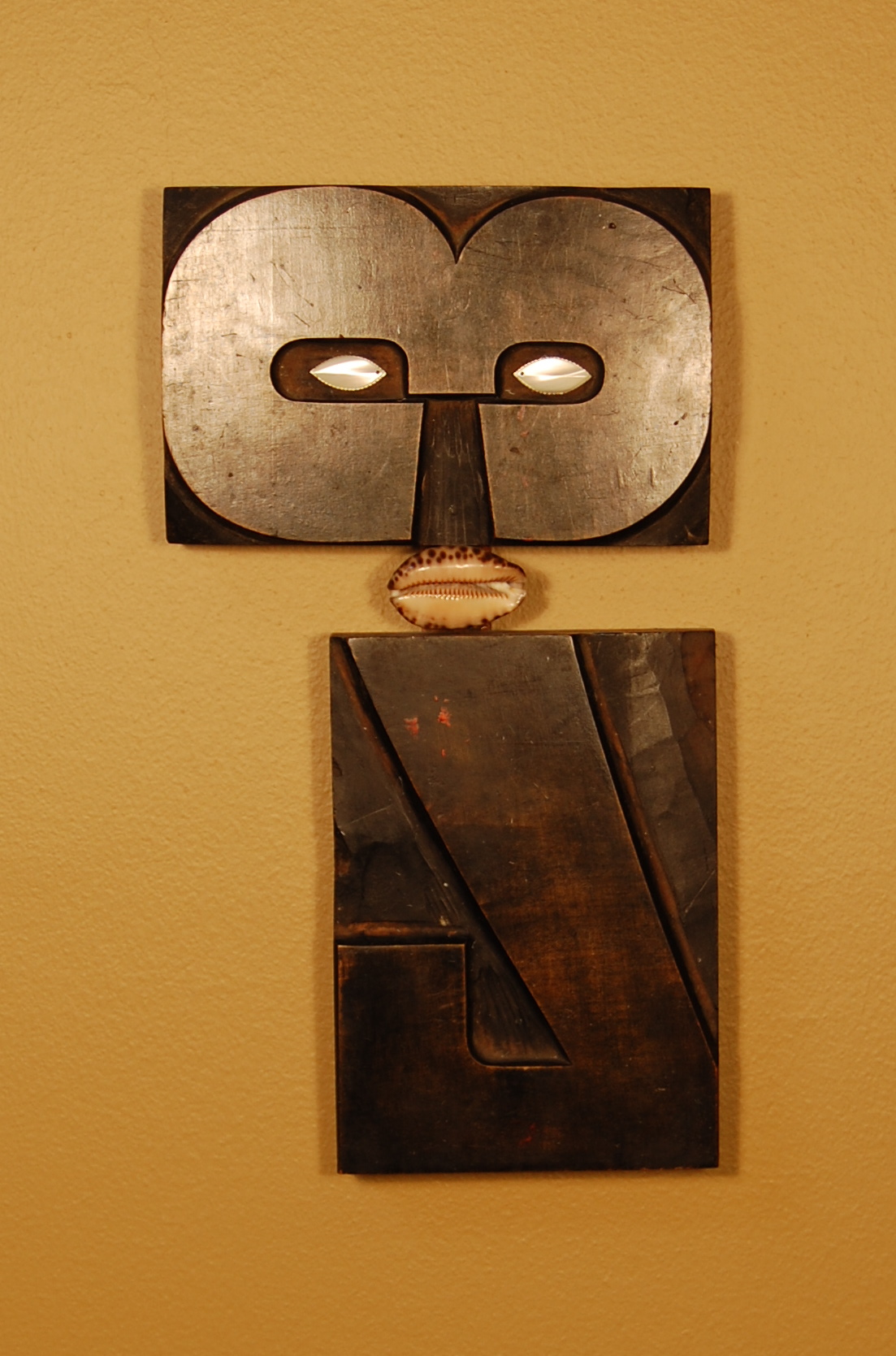 Description: A large wooden stamp of the number three is turned horizontally to form a face. The area within the two curves of the number three represent eyes. A small, white, plastic lemon-shaped bead is attached to the center of each, representing pupils. The space between the two sides of the number three represents the nose. Below the stamp, a seashell is attached, representing lips. The opening of the conch form an open mouth. Below this, an upside-down stamp of the number seven is attached. The leg of the number seven represents the neck and torso and the horizontal portion represents legs in a seated position.