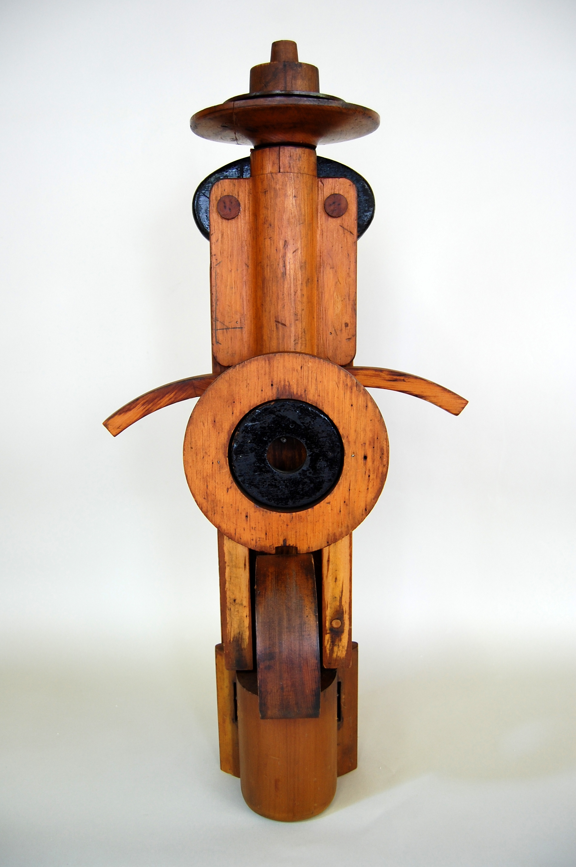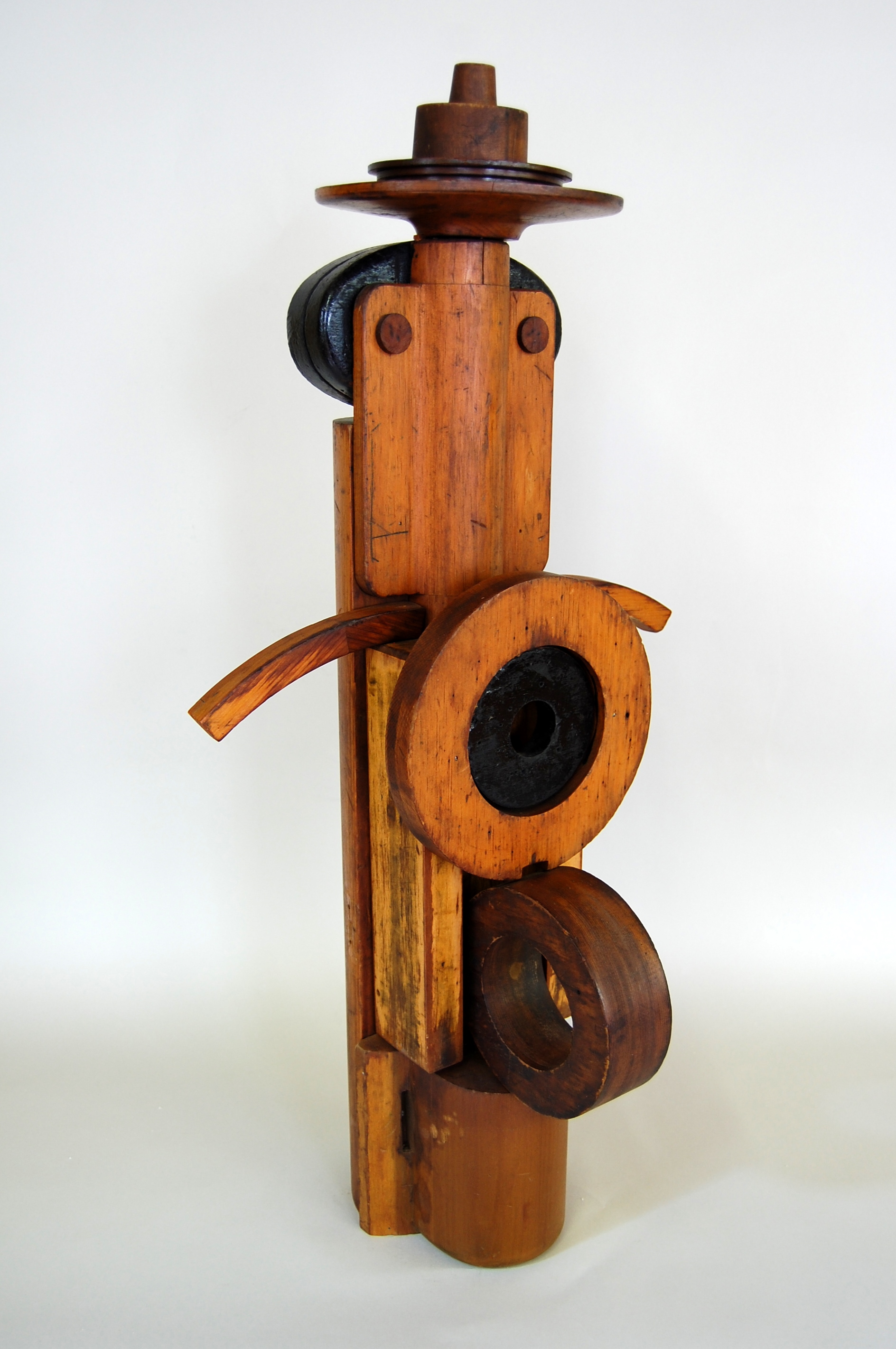 Description: A variety of wooden forms represent the form of a queen. Her crown is represented by a variety of concentric circular forms that narrow as they stack upwards. Cylindrical and rounded wooden forms represent a face and body and two wooden pegs represent eyes. Arched wooden forms are attached to the side of this form, representing two arms that are stretched out to their sides. Two thick, ring-shaped wooden forms are stacked vertically at the bottom of this piece.