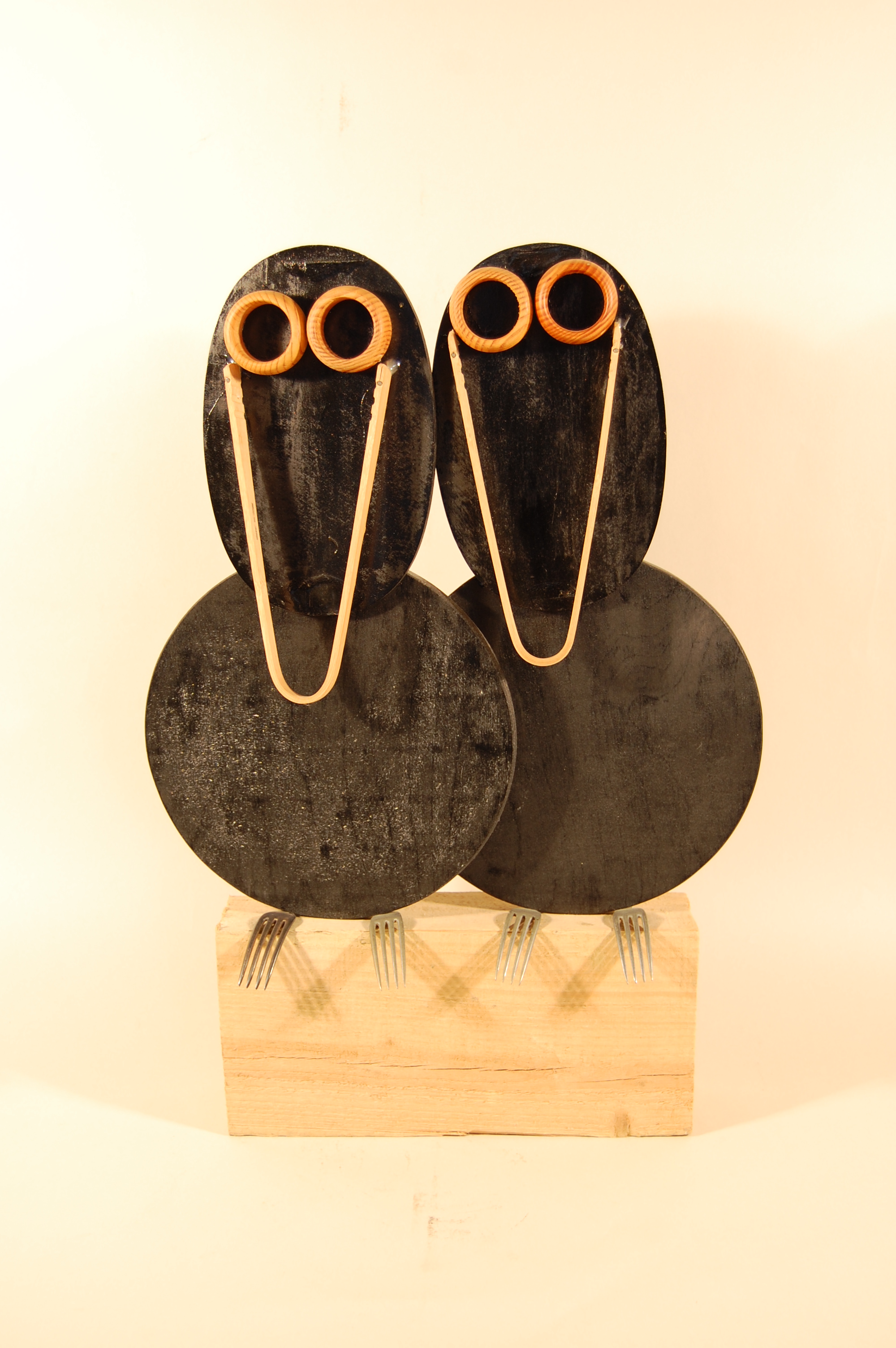Description: Two identical crows are each made from two wooden forms. A lower round form represents the body and an oval upper form represents the head. The forms are painted black and the two crows are perched side by side on a rectangular wooden block. Two metal forks are attached below each crow, their prongs projecting forward, representing their claws. Wooden forms attach to the surface of the crow’s faces to represent facial features. Wooden rings represent eyes and an upside-down wooden tong represents a beak.
