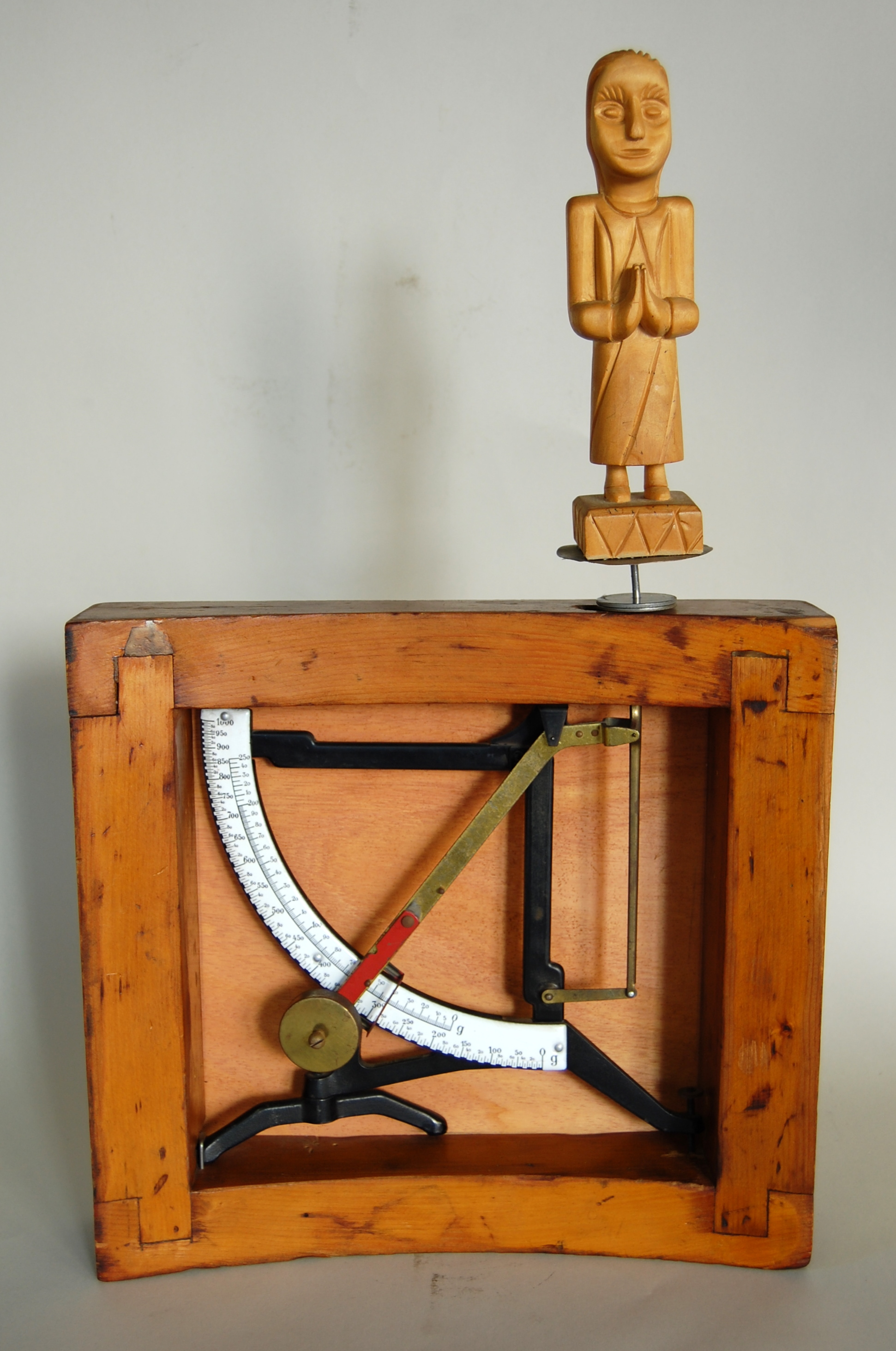Description: A square-shaped wooden form frames a metal balance scale on five sides, with an open side exposing the scale. A hole is drilled through the top of the frame, allowing the weight-bearing portion of the scale to stand outside of the frame. Resting on the surface of the weight-bearing platform is a wooden etched sculpture of a person standing in a posture of worship.