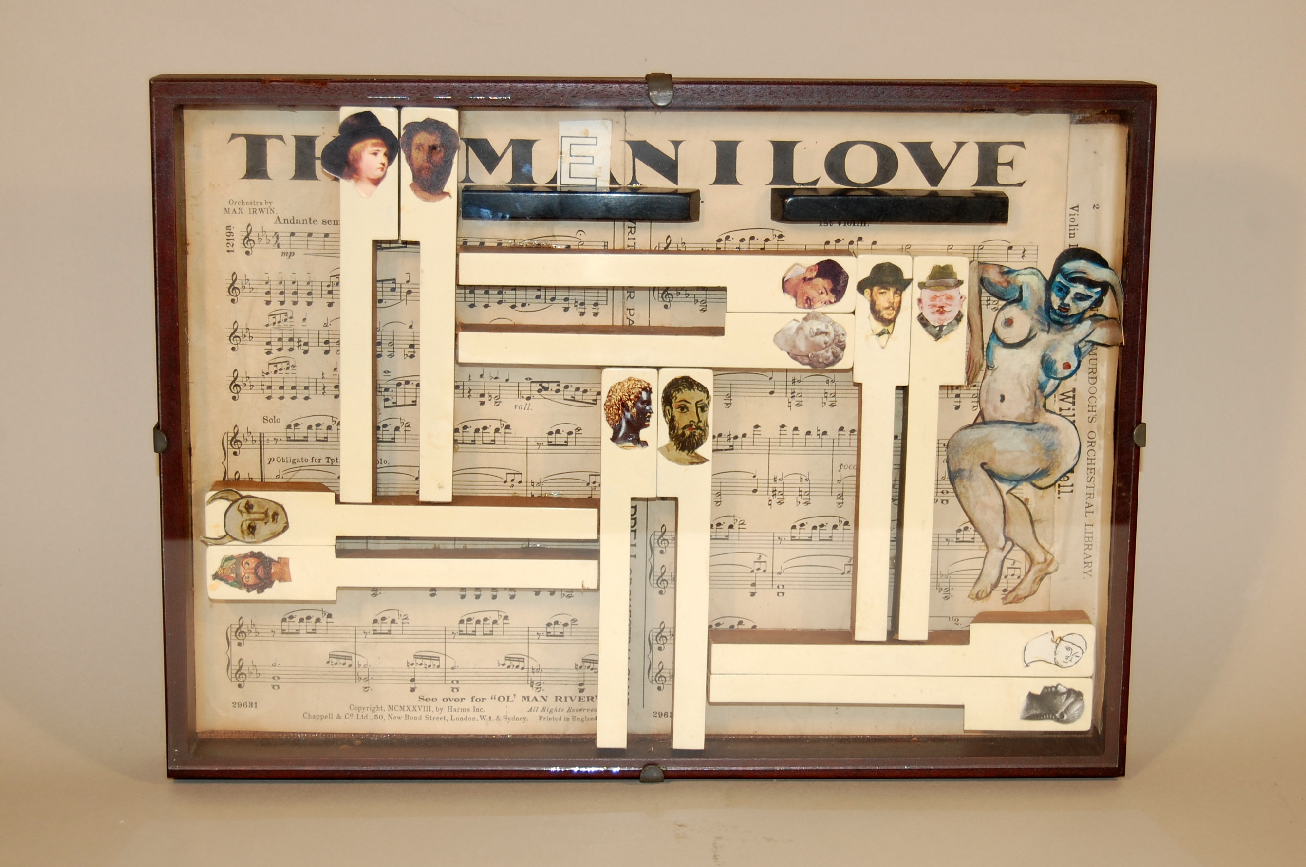 Description: A wooden form frames holds a collage protected with a glass panel. The wooden frame is lined with sheet music, entitled “The Man I Love.” However, the letter “A” in “Man” is covered with the letter “E,” so that the word reads, “Men.” Piano keys are attached to the sheet music. One black piano key is attached horizontally beneath the word “Men” and another black key is attached beneath the word “Love.” Twelve white piano keys are attached throughout the image in groups of two. Attached to each key is a cutout of a man’s face, all from various works of art. A cutout of a reclining nude woman (Blue Nude, 1907, Henri Matisse, French, Le Cateau-Cambrésis 1869-1954 Nice, Baltimore Museum of Art) is located on the right side of the scene.