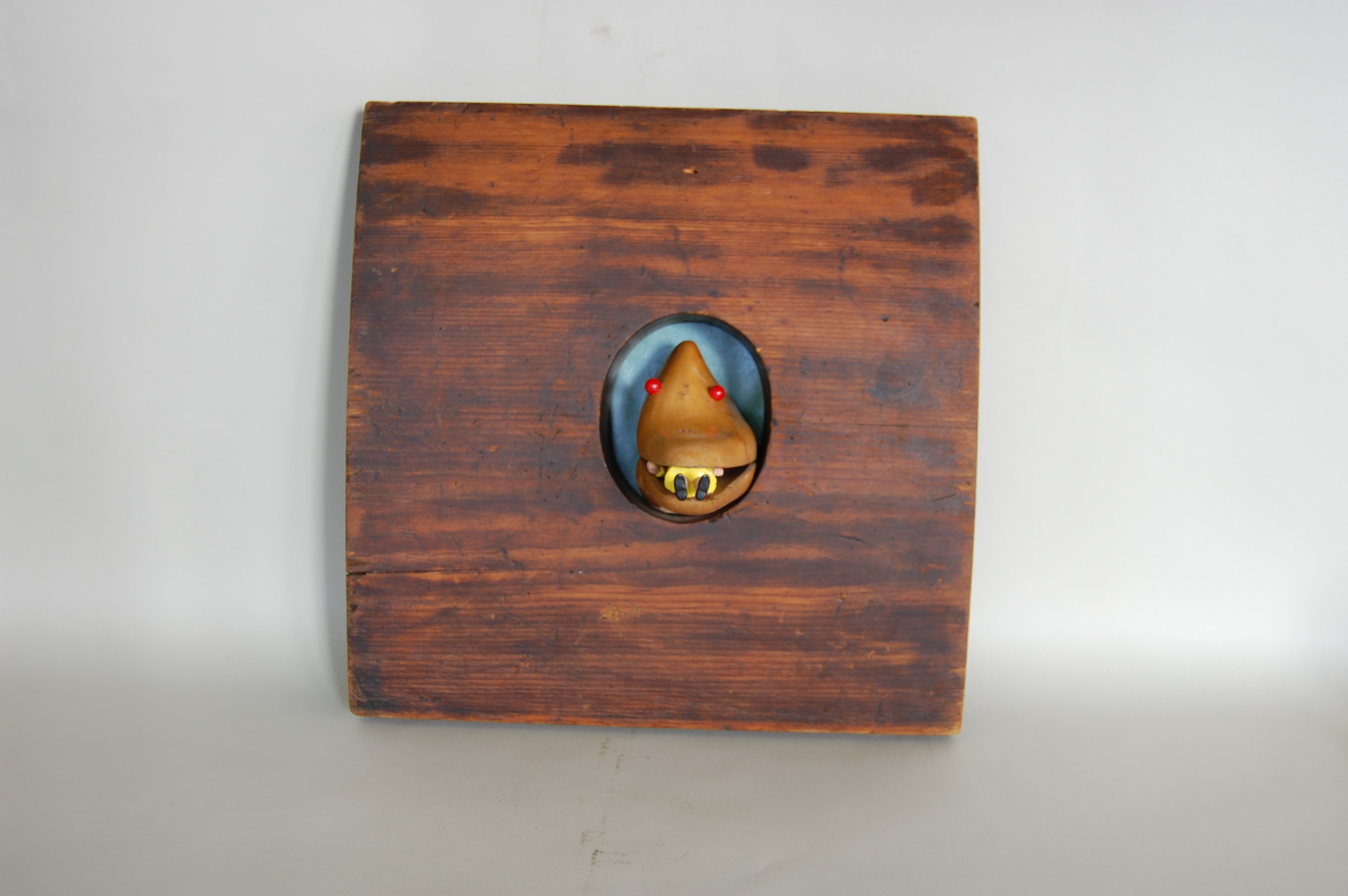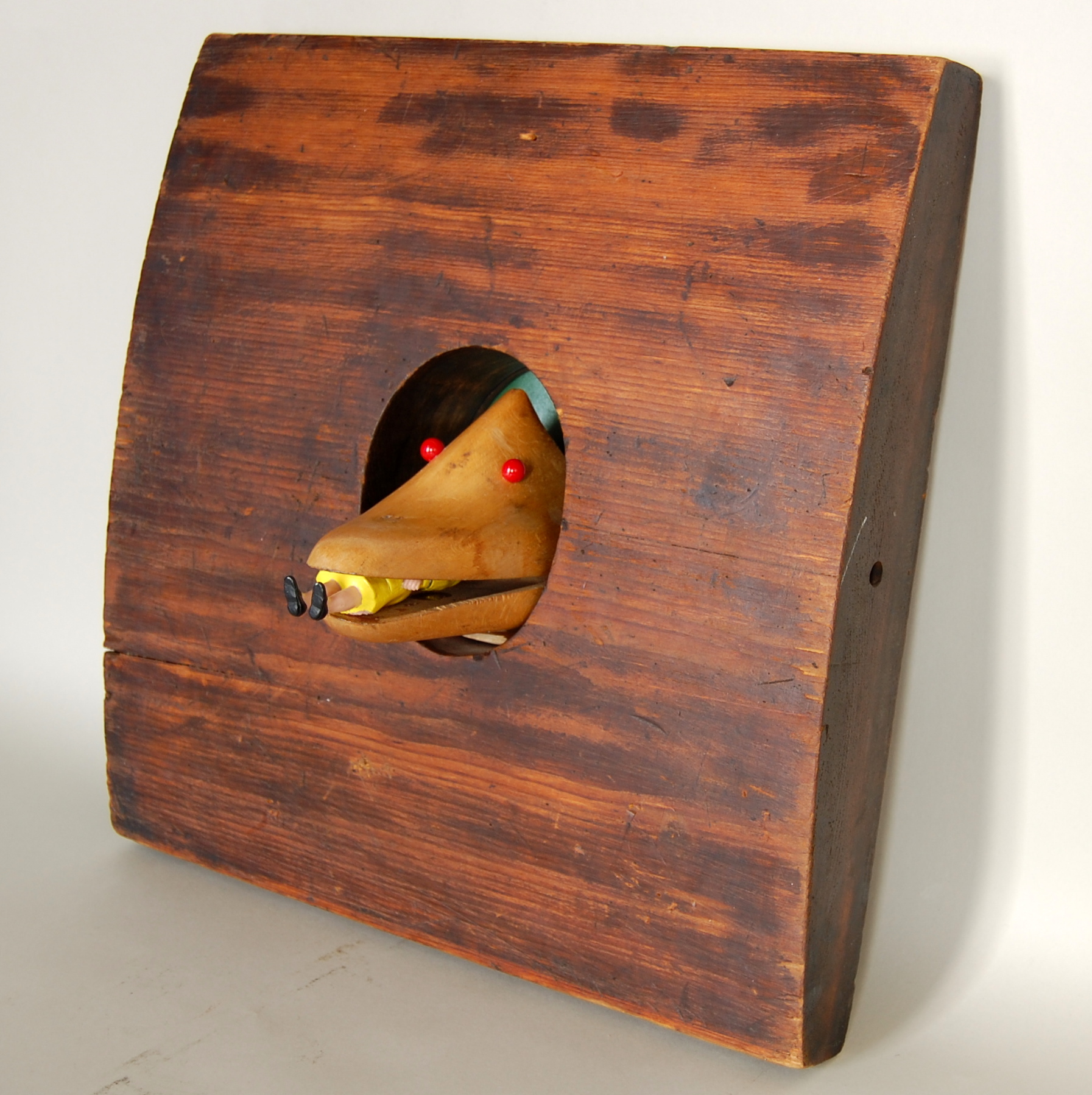 Description: A creature sticks its face through a hole in the center of a square-shaped wooden form. The creature’s face, represented with two wooden shoe lasts with their bottom surfaces touching and their toe portions pointing outward, has two red plastic beads attached, representing eyes. In the creature’s mouth is a rubber toy woman. Her feet poke out from the front of the creature’s mouth.