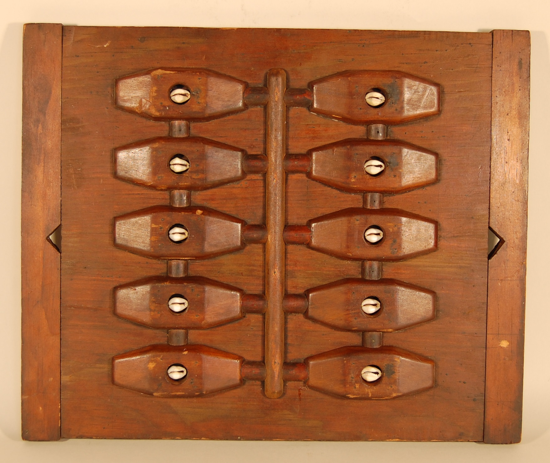 Description: A wooden form with a symmetrical motif is attached to the surface of a flat, rectangular wooden form. Included in this motif are circular incisions in which a seashell is placed. Two parallel edges of the side are reinforced with attached, flat, rectangular forms with small triangles cut from the centers of their inner-facing sides.