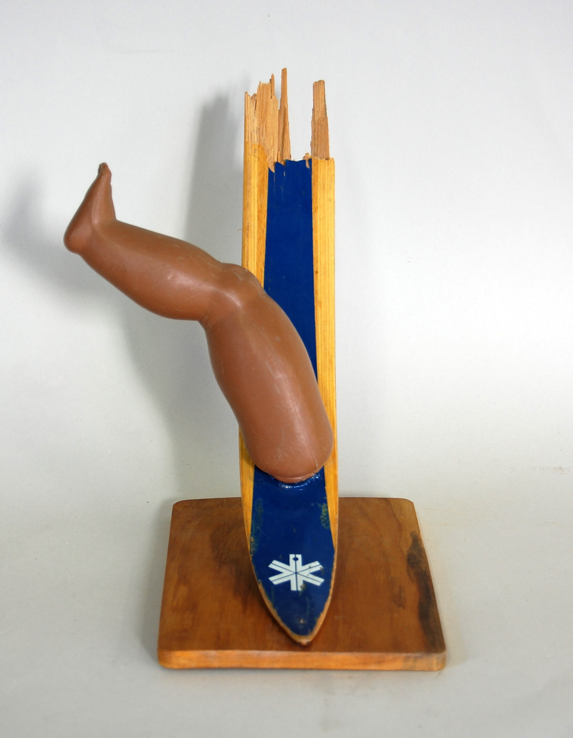 Description: A thin rectangular wooden form serves as the base onto which a broken blue and yellow colored ski fragment is attached. The ski’s broken jagged edge is pointed upwards and the front portion of the ski points forwards. A plastic doll’s leg is attached at the point of the doll’s thigh to the surface of the ski. Its foot extends upwards, to the side of the ski, with toes pointed upwards; a posture that suggests a precarious moment.