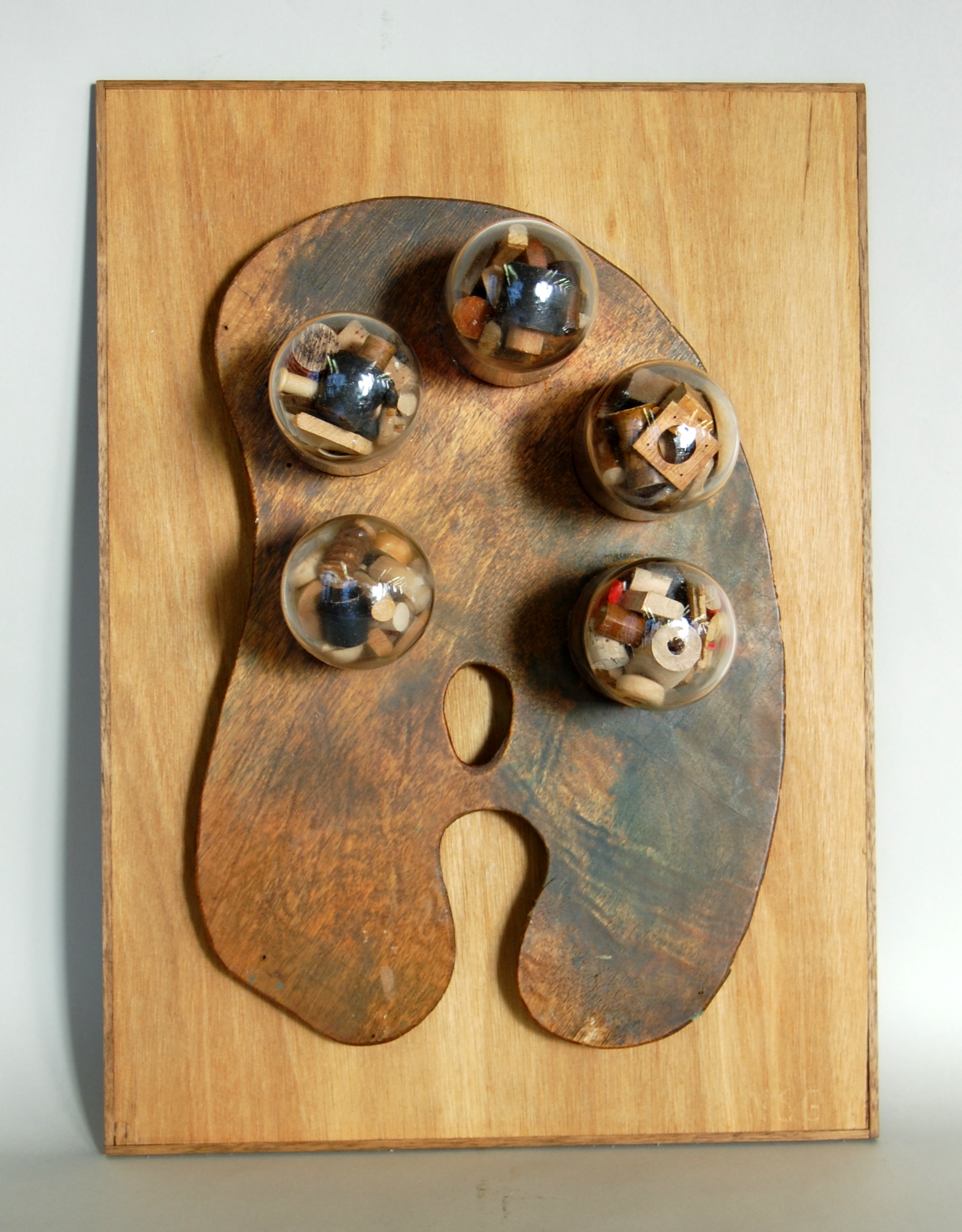 Materials and Techniques: Wooden board, wooden painter’s palette, glass domed forms, small wooden forms, small metal forms