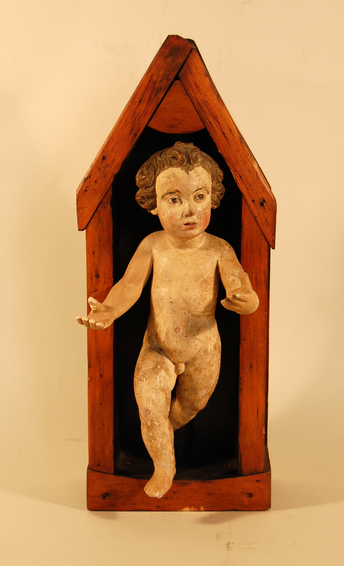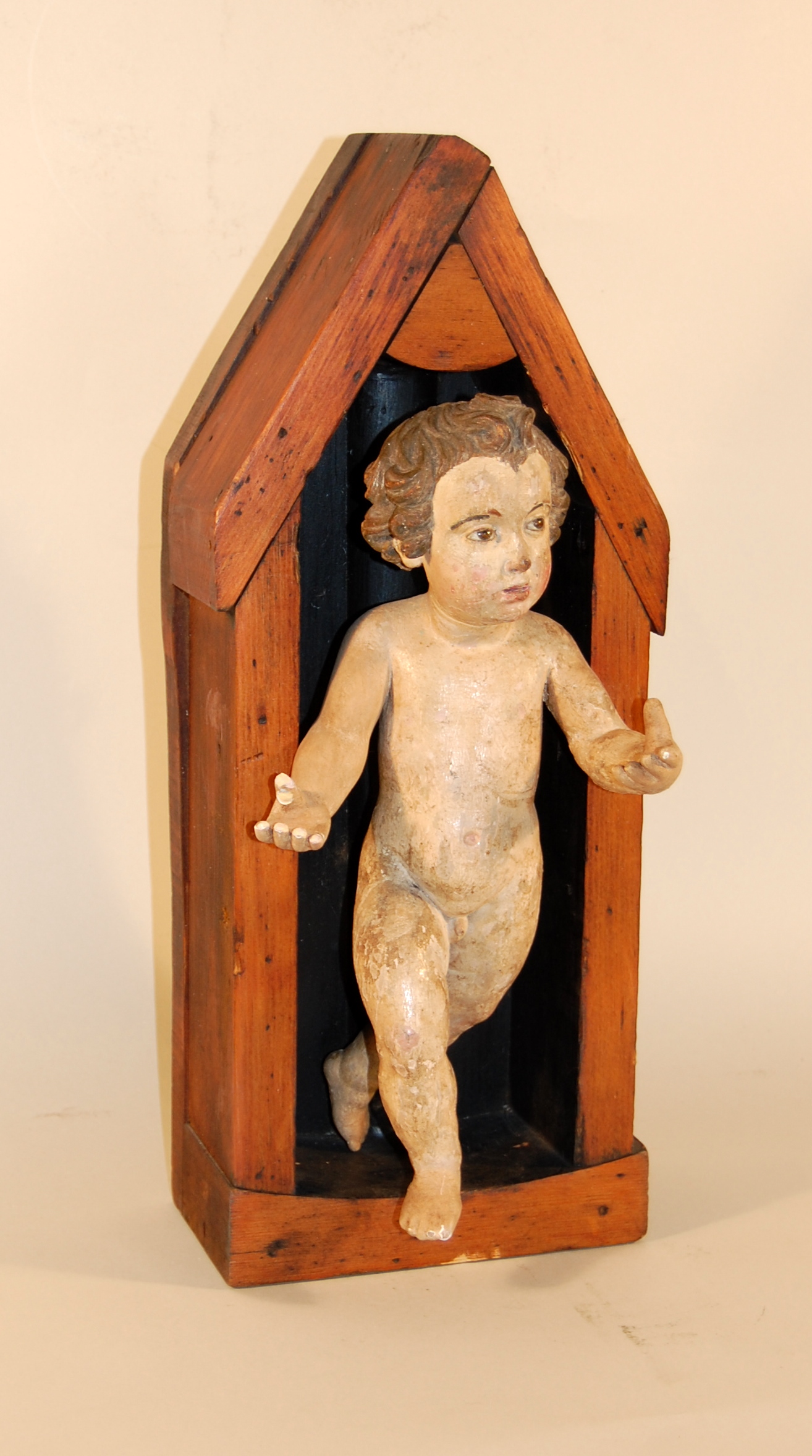 Description: A rectangular box stands vertically on its side, with a pointed top representing a gabled roof. The interior of this wooden form is painted black and frames an antique wooden doll. This doll represents a nude, male infant angel stepping forward through the opening of the box with his left arm extended forward.