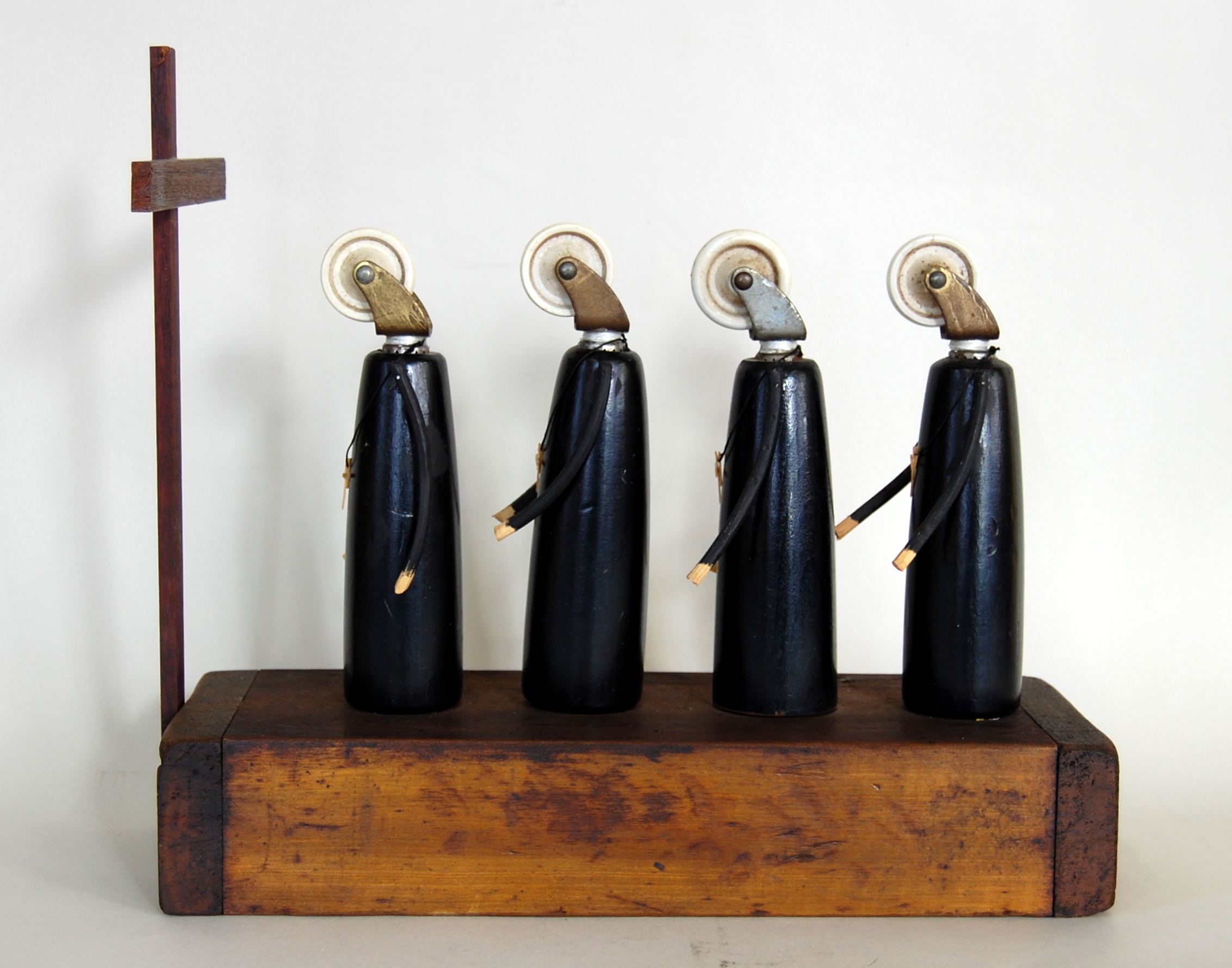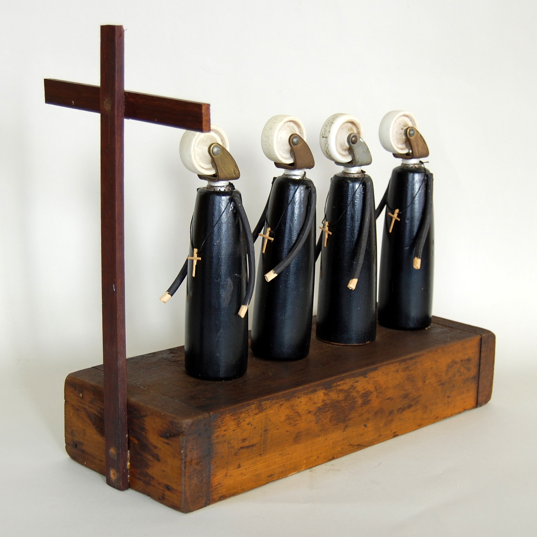 Description: Resting on a rectangular wooden block are four identical forms of nuns. They stand in line with their heads in deference to the large cross that stands before them. Representing each nun is a leg from a piece of furniture with a white plastic wheel attached. The leg is a rounded, almost cylindrical in shape, but narrows slightly towards the end with the attached wheel. The wooden form is painted a glossy black. The white wheel represents the white coif that covers the nun’s head. Each nun’s arms are represented with strands of wicker painted black until the wrist. Their arms rest by their waists and their hands extend slightly forward. Each nun wears a cross around her neck, the cross pendant made with splinters of wood and the cord made with thin black yarn. White yarn is wrapped around each nun’s neck, representing the portion of the coif that covers the nun’s neck.