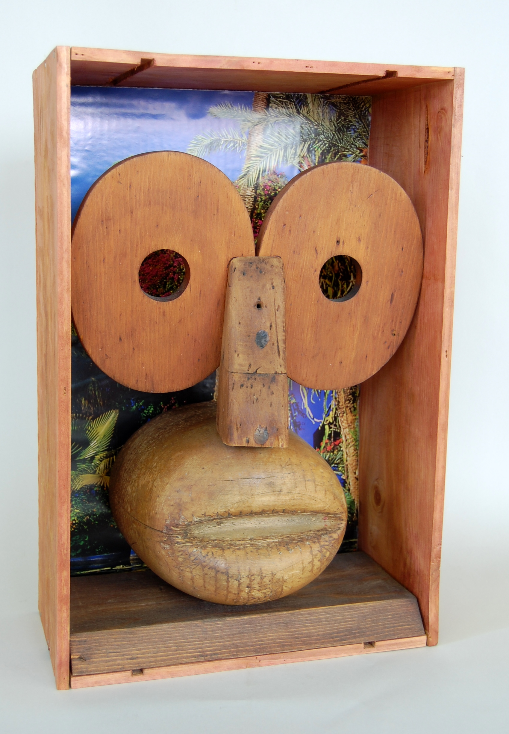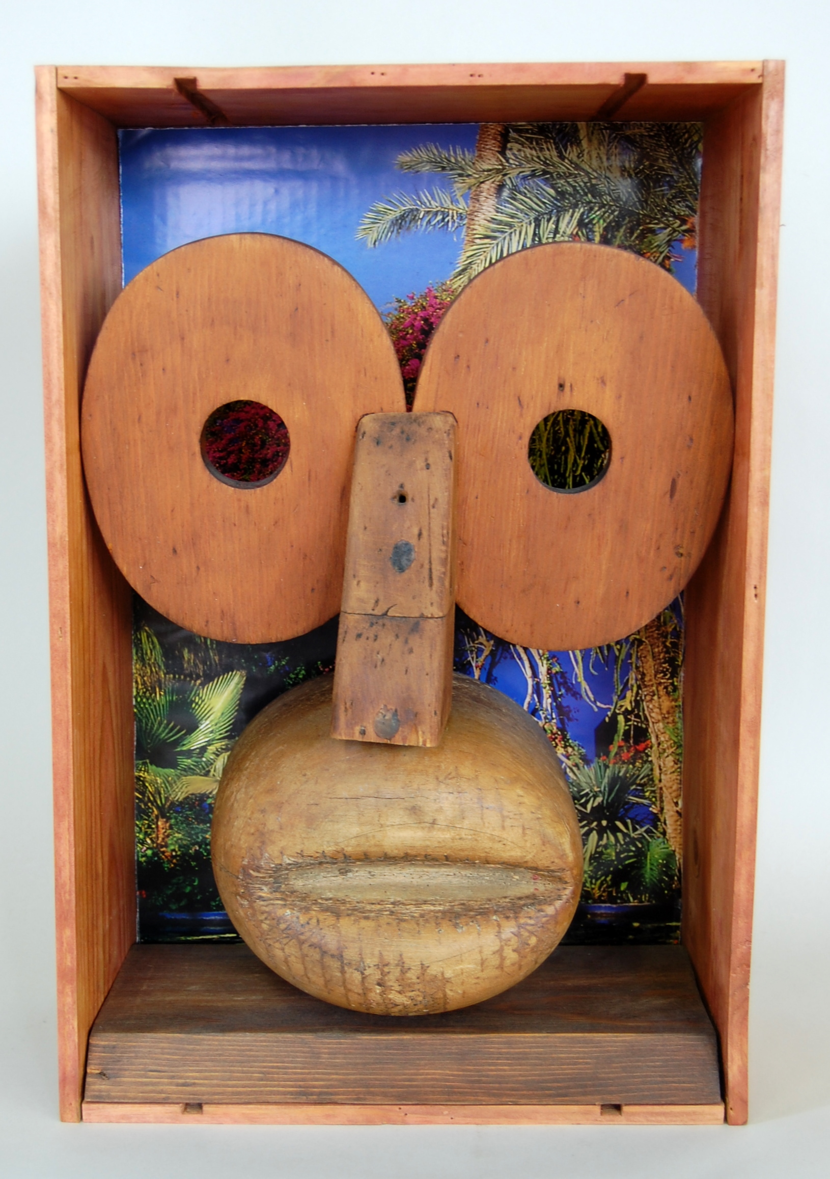 Description: A wooden box placed vertically on its side frames the image of a face. A large rounded wooden form with a carved line extending horizontally across it represents its lips. It rests on the box’s surface. A triangular wooden form rests above it, representing its nose. Above the nose, two identical oval, ring shaped wooden forms represent eyes. Behind the face, paper with tropical foliage lines the back wall of the box.