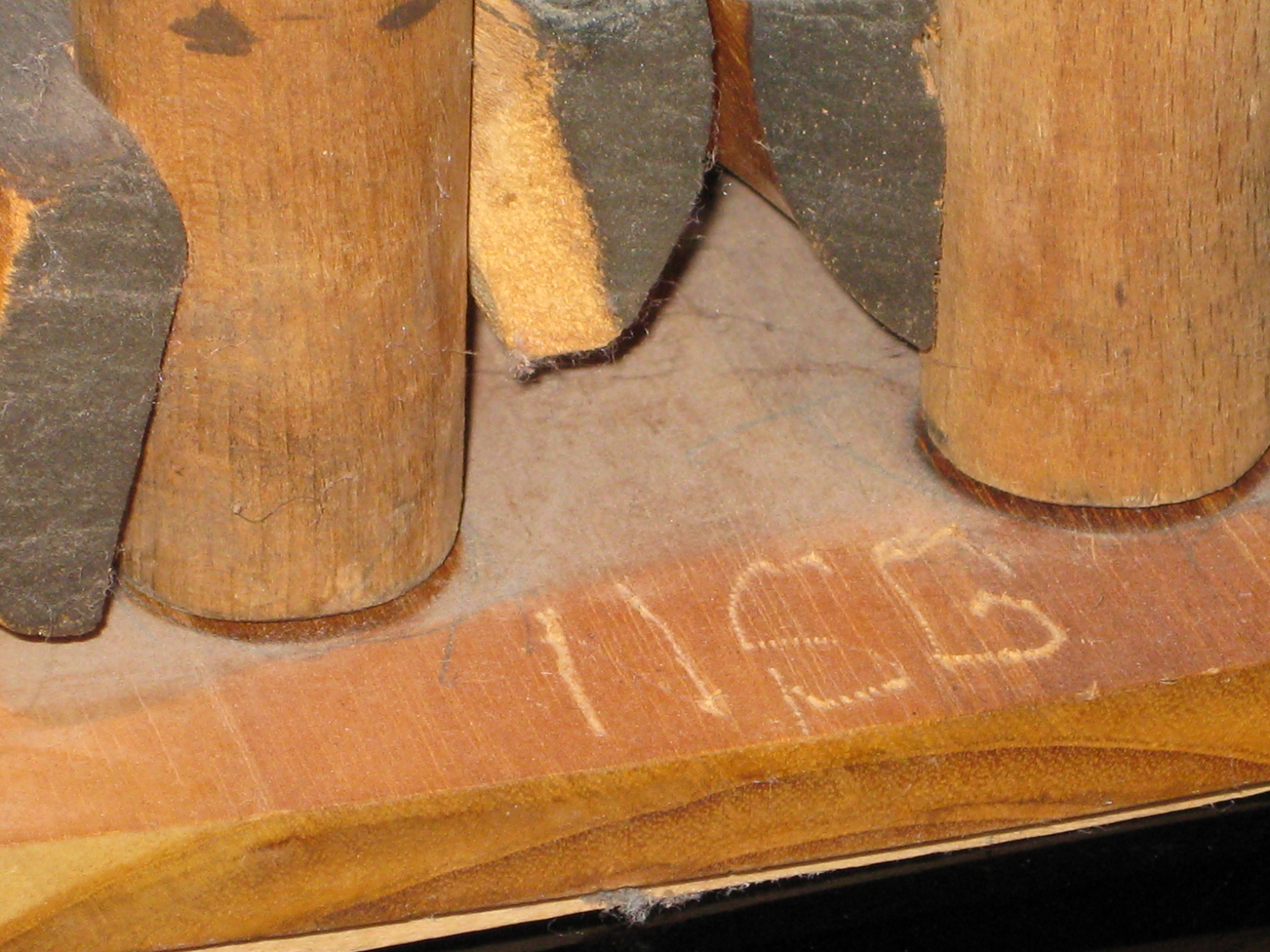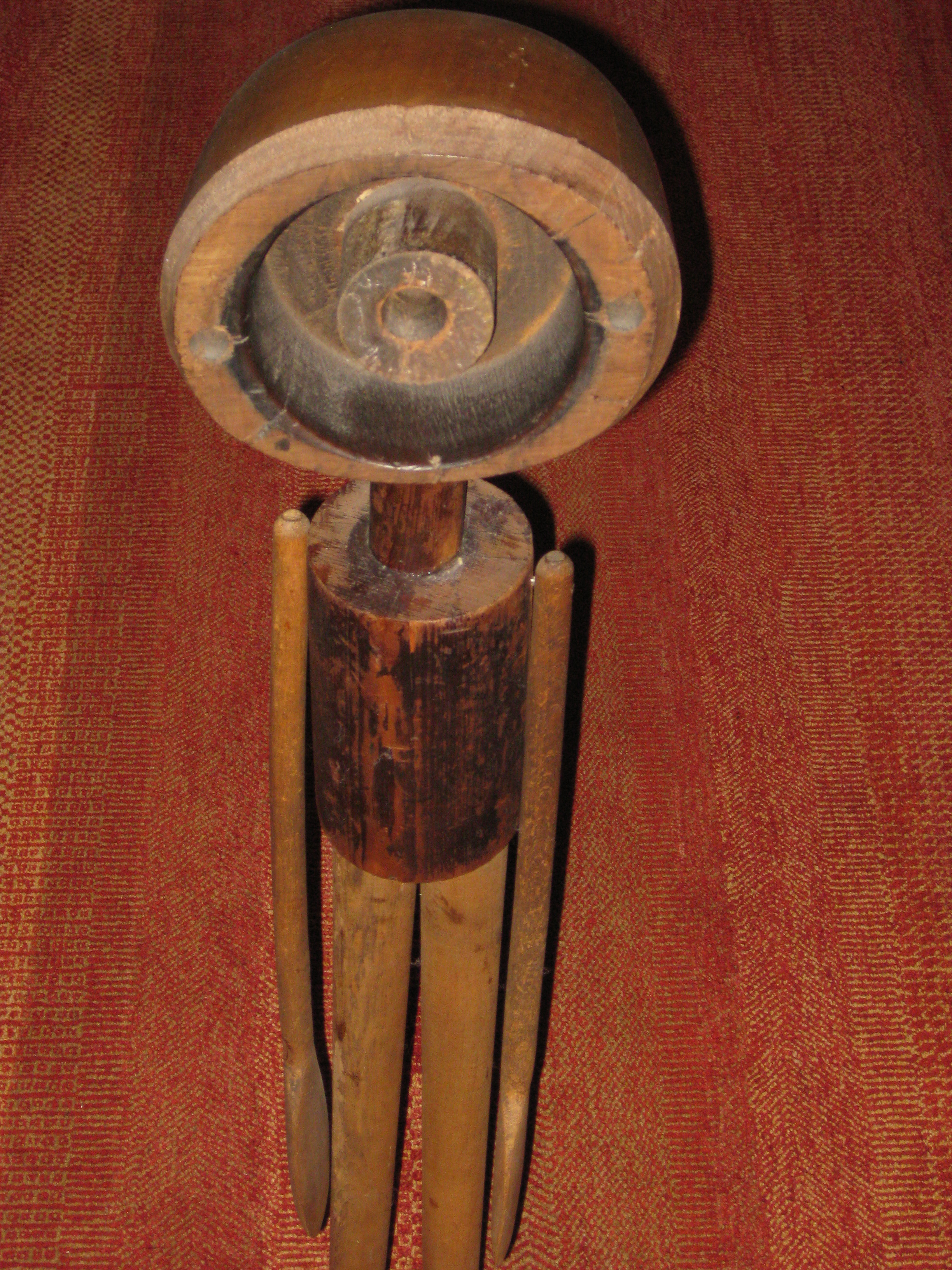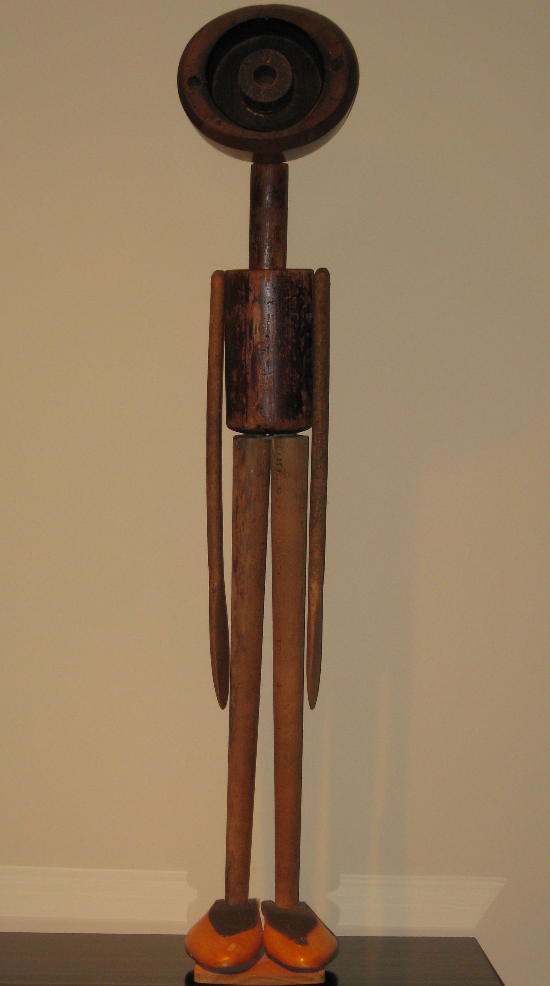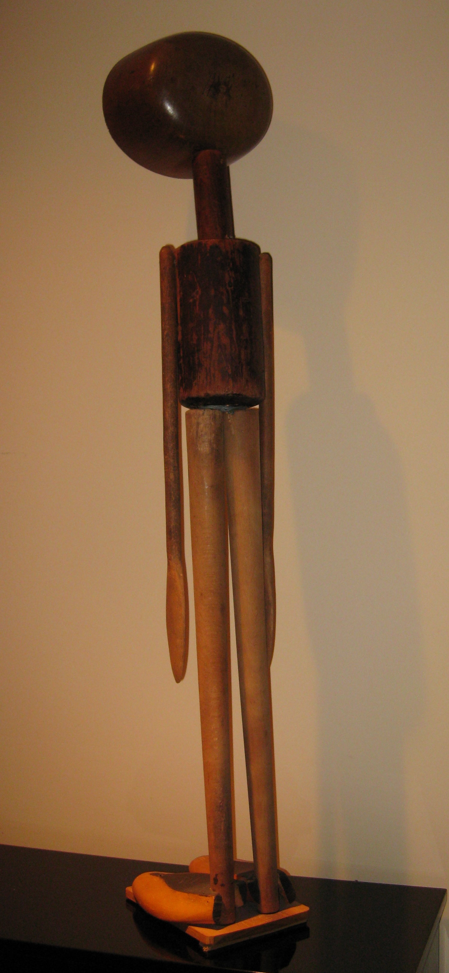Description: A variety of wooden forms represent a standing figure. A round form with concentric circles etched into it represents the head. A cylindrical form, representing the neck connects the head to a larger cylindrical form, representing the torso. Two long, narrow, cylindrical forms represent his legs that are supported by two identical wooden shoe forms, representing his feet that point forward in attention. His arms echo this body language as two identical, large wooden spoons representing his arms rest against his body. The figure stands on a thin wooden board.