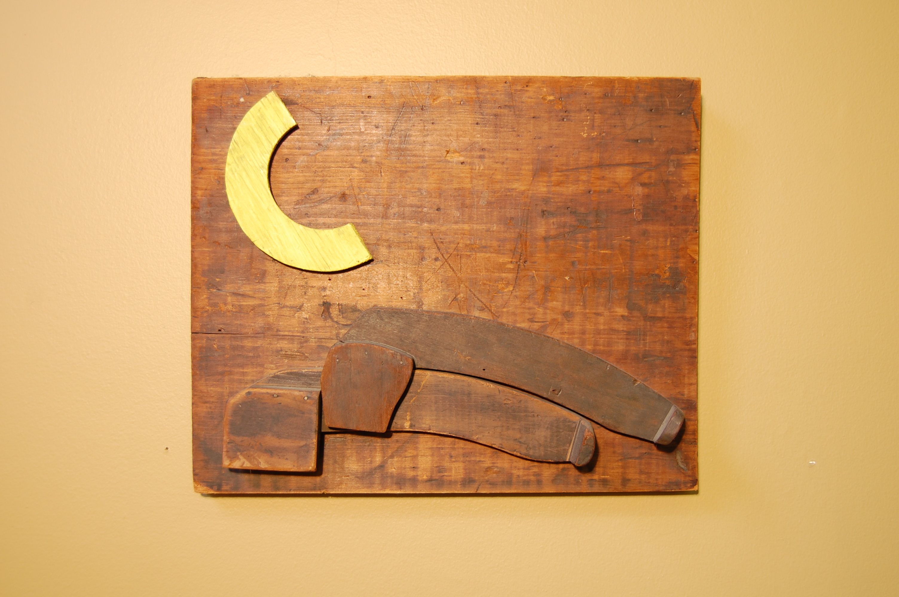 Description: A horizontal wooden rectangle serves as the backdrop of this hanging piece. A scene is featured in which two lovers embrace one another under the moon. Two identical wooden forms, both with a rounded tip, a curved body, and a bracket protruding from the other end are placed one above the other, the rounded end representing their heads that are held close together and the brackets representing their feet. In the upper left corner of the piece, a yellow-painted wooden form in the shape of a half ring represents the moon, illuminating the romantic night sky.